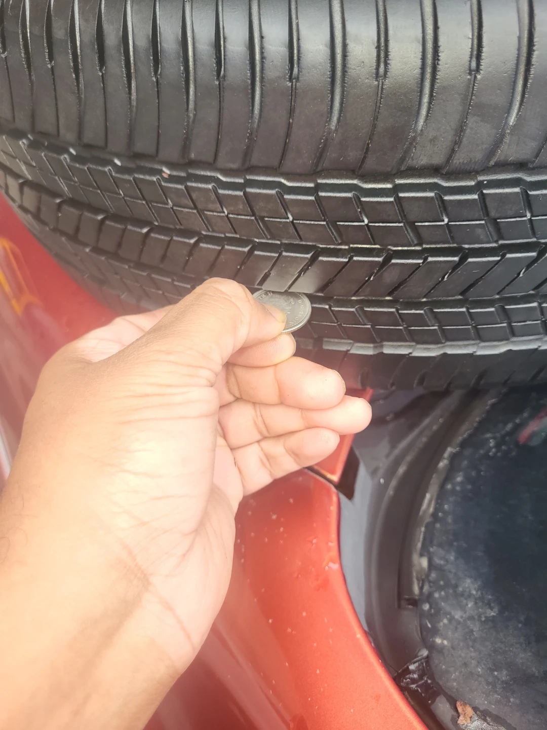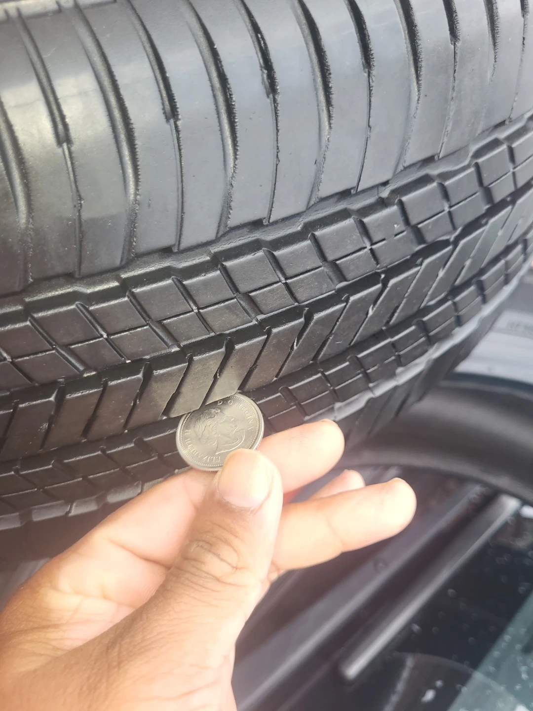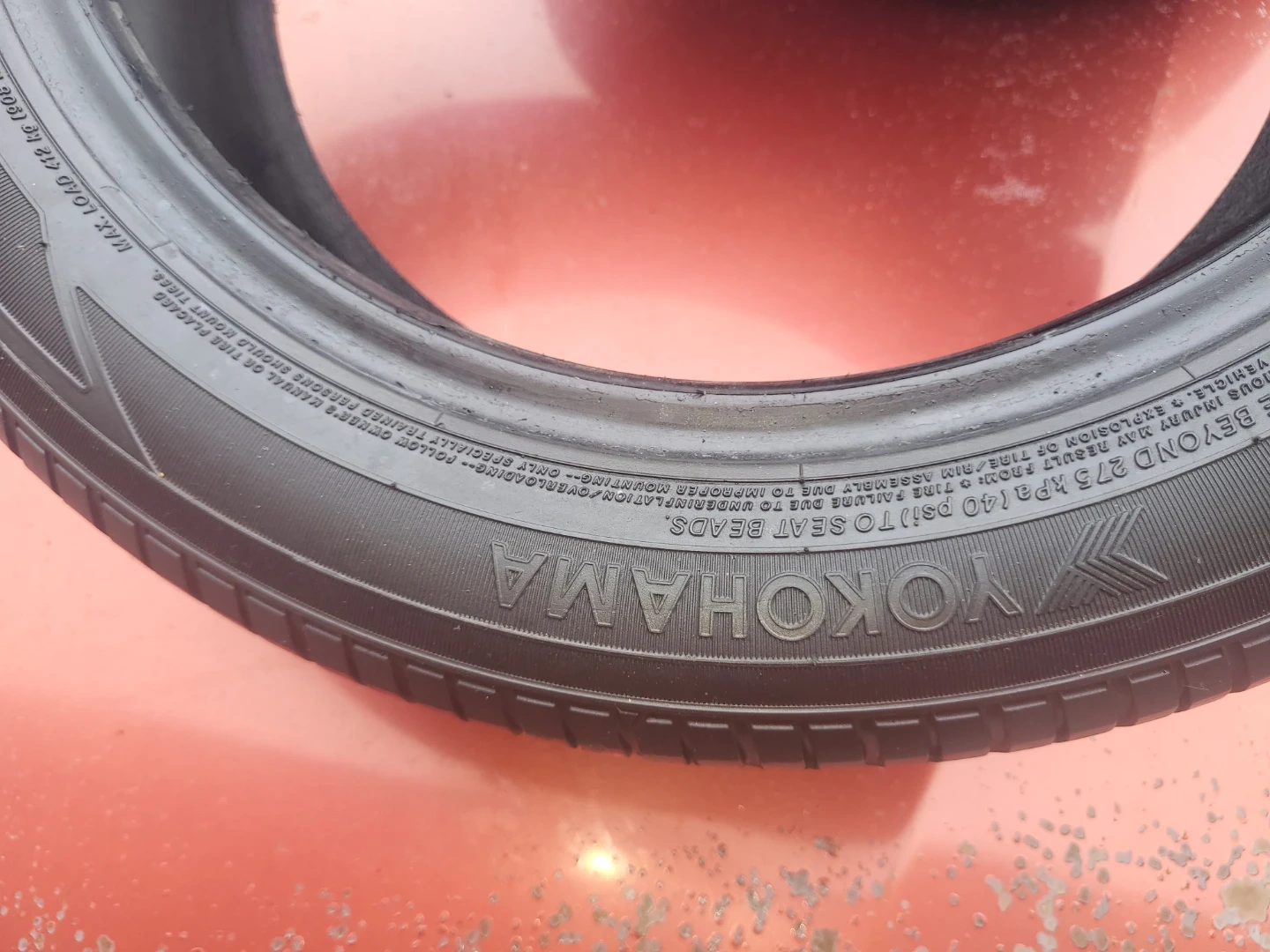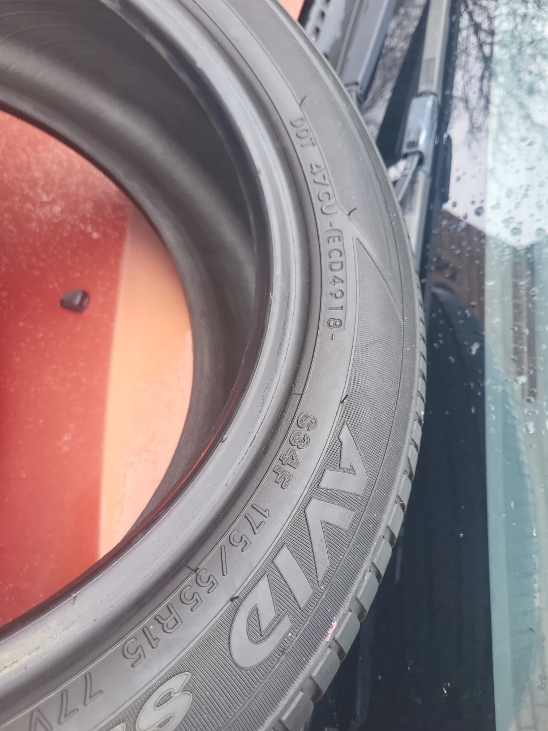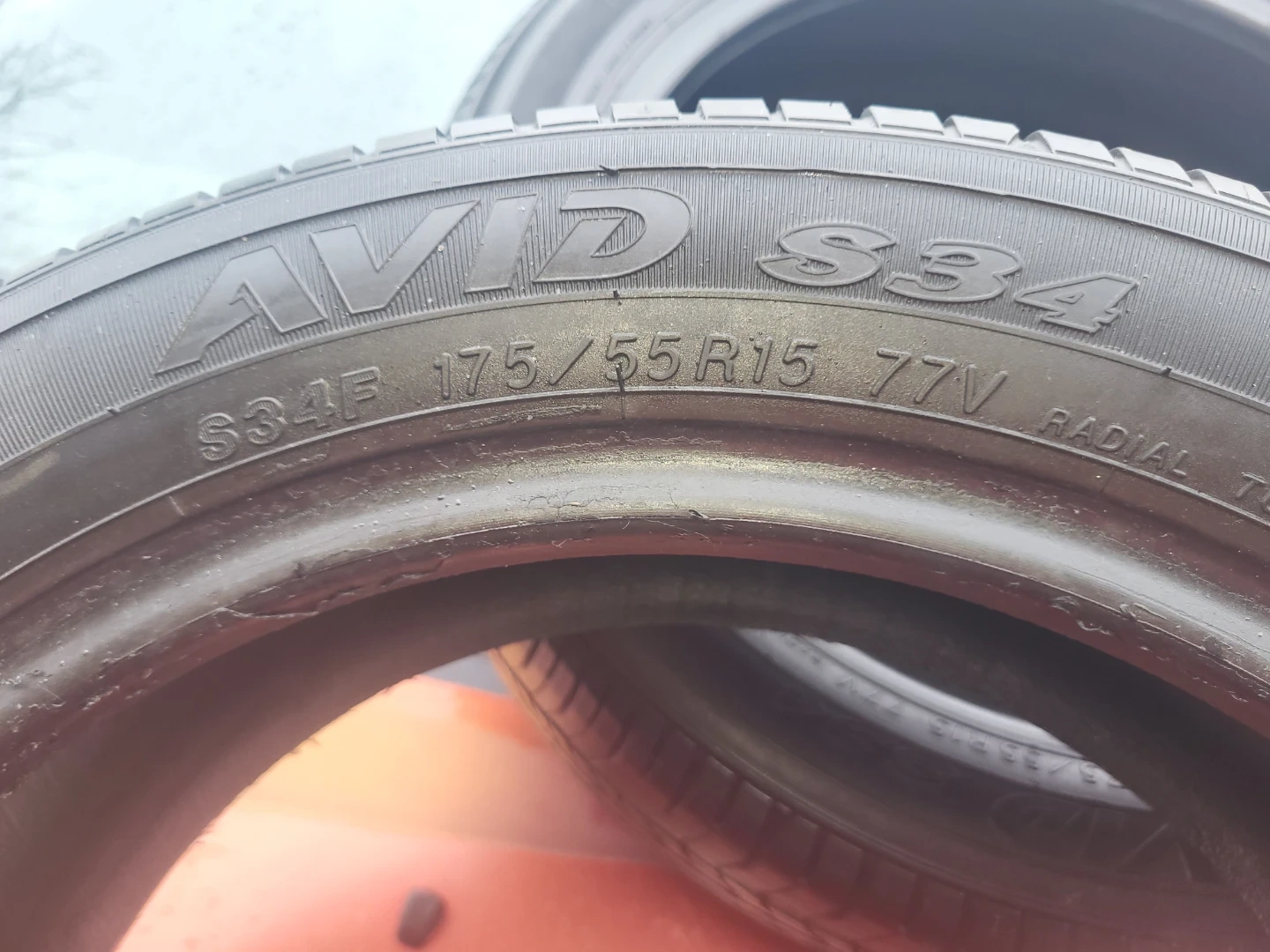 This is a Yokohama AVID tire with a size of 175/55R15. The tread depth looks good, with a quarter fitting comfortably in the grooves. It's a solid tire for your vehicle.