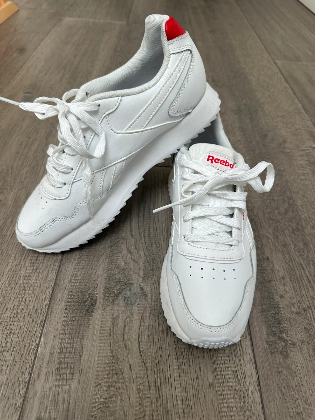 The Reebok Royal Glide Ripple Double (style FW6714) is a women's casual sneaker featuring a white upper with red accents, a distinct, chunky, ripple-style outsole, and a durable synthetic leather construction. Designed for everyday comfort and style, this shoe offers a modern, elevated take on the classic Reebok Shoe size is US women's 7.5, UK 5, EUR 38, and CM 24.5.