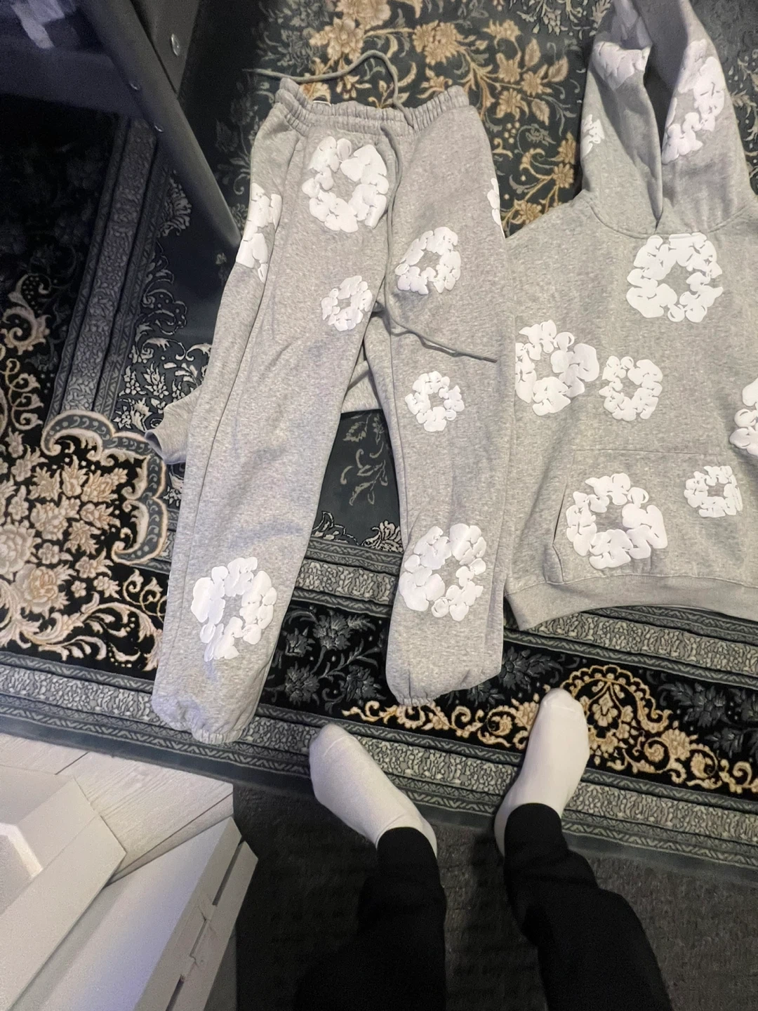 Selling a comfy grey hoodie and sweatpants set. The set has a matching design of what looks like scrunchies all over. Perfect for lounging around the house or running errands!