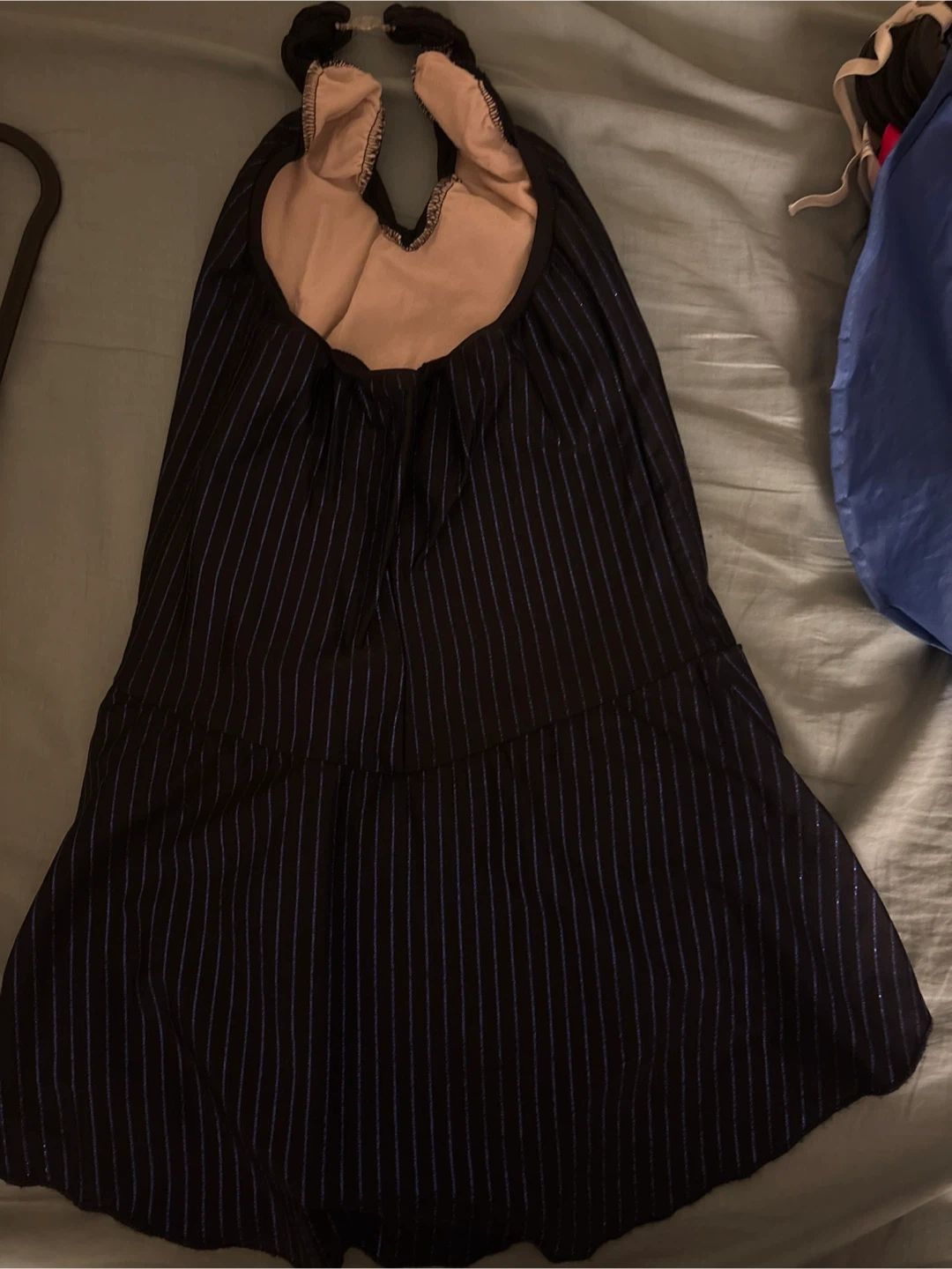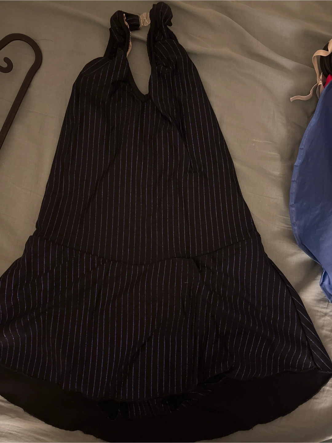 This black halter dress features a pinstripe pattern with blue vertical lines. It has a gathered or pleated detail at the waist area and a flared skirt. The neckline is a V-neck, and it ties at the back of the neck.