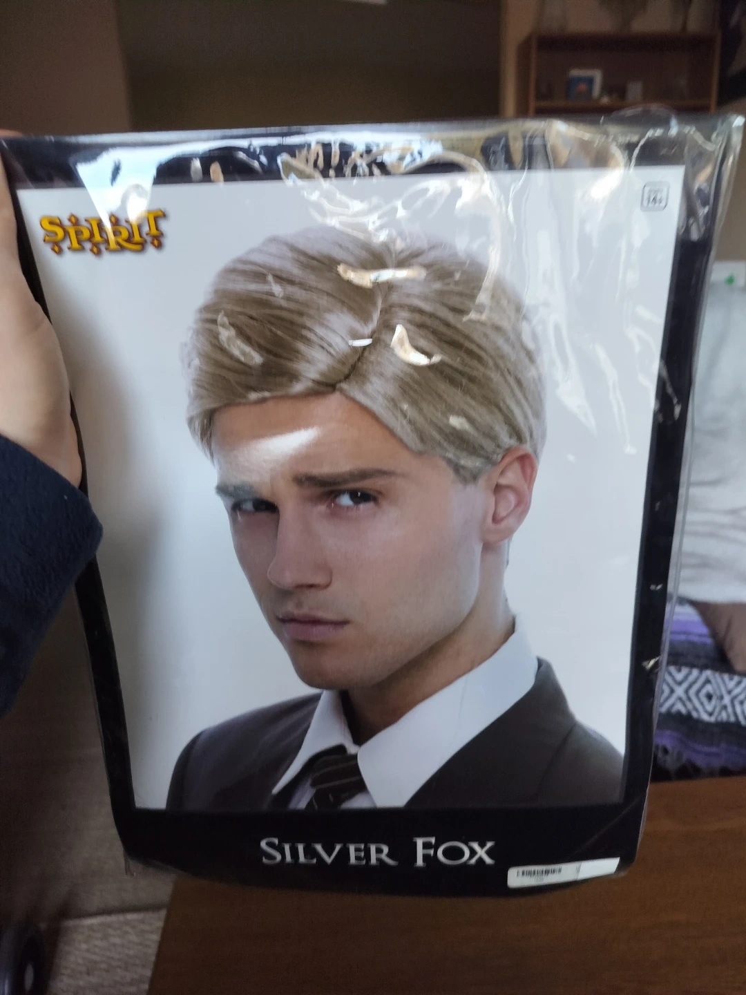 Spirit Halloween "Silver Fox" wig. This wig is designed to give you a distinguished look. It's suitable for adult costumes and parties. Comes with a black bow tie. Only worn once, in great condition.