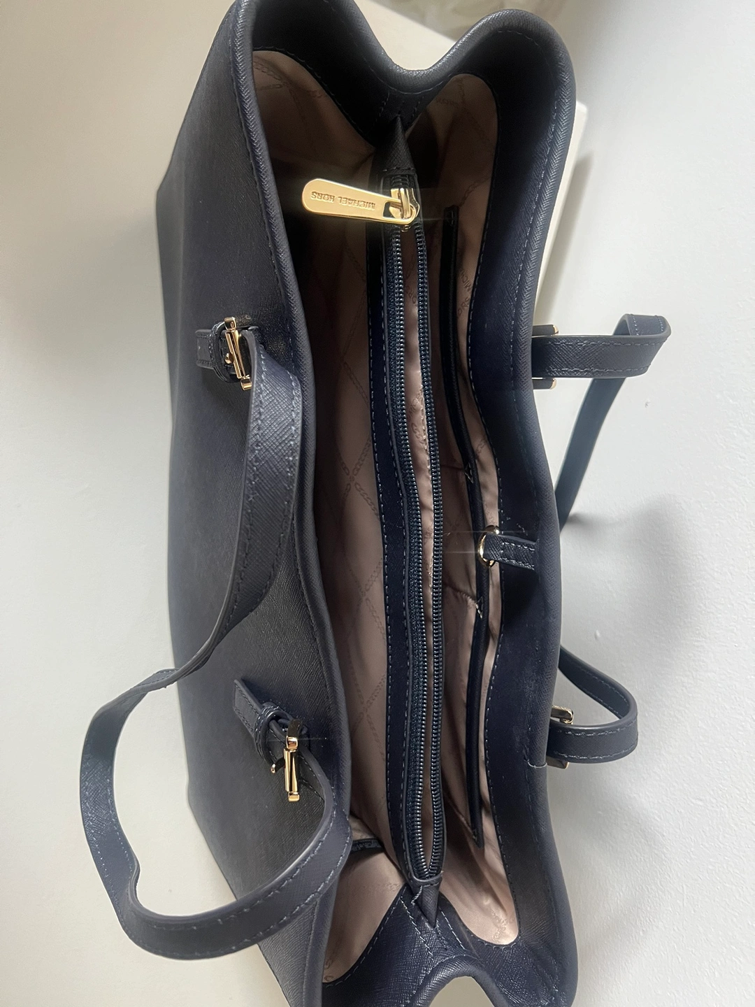 A Midnight Blue Michael Kors tote bag with gold hardware and a large MK logo charm. The bag has a top zipper closure, two top handles and a detachable shoulder strap. The inside of the bag is lined in a beige fabric with a zippered pocket on one side. Never used, this has been kept in a MK garment bag (pictured) which is also included.