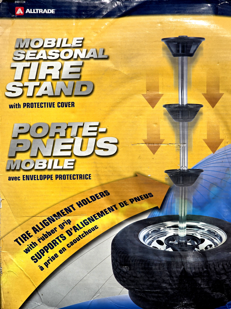 Mobile Seasonal Tire Stand - Sturdy steel base - 5 heavy-duty caster wheels - easy transport and handling - Protective dust cover - Tire alignment holders with rubber grip *** unused, and new in box *** Of course: - Feel free to reach out with any questions or to coordinate a pickup The usual caveats: - Pick-up available for all items - Delivery only with pre-payment close by, and extra fee for distance, since people ask! ;) - if it is listed here, it is still available. :) Really! (Box had gotten damp at some point.)