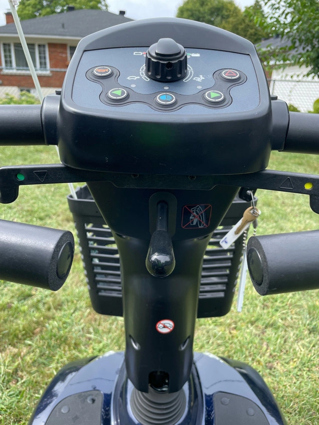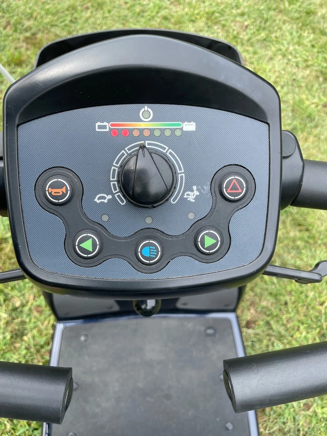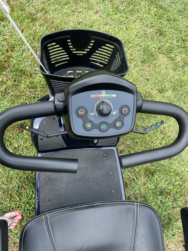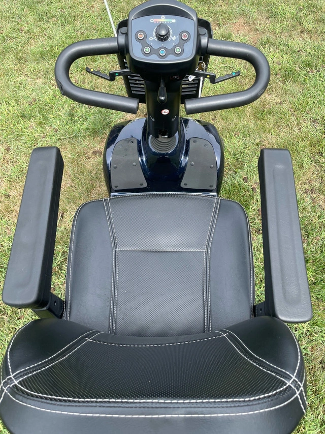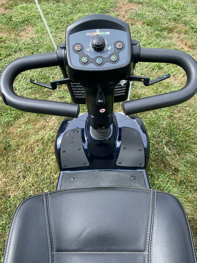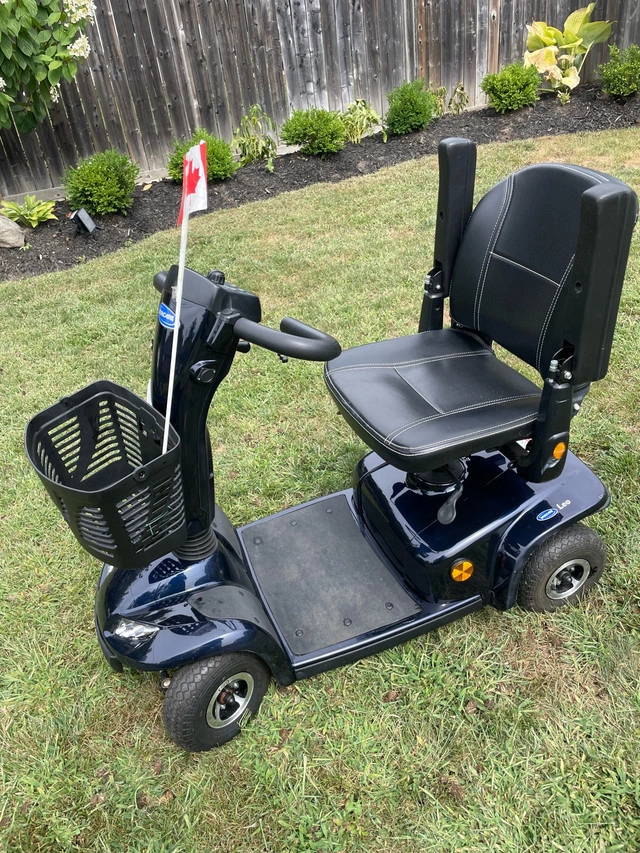 Absolute steal!! midnight blue. Slightly used only a few summers, twice a week (hairdresser, groceries and church). Always stored inside shed, and batteries taken in house for winter months. Well maintained, extra keys, a few scratches/scuffs. Includes charger. The Invacare Leo is a versatile four-wheel mobility scooter designed for both indoor and outdoor use, known for its compact size and long-range capabilities. It features a comfortable, adjustable seat, delta-steering handlebars, and a swivel seat with adjustable arms. The Leo is engineered for safety and ease of maneuverability, making it a popular choice for those seeking independence. Key Features: Compact Design: The Leo's compact size makes it easy to maneuver in tight spaces, both indoors and outdoors. Long Range: It is equipped with 36 Ah batteries, providing a range of up to 36 km (22.5 miles) on a single charge. Comfortable Seating: The adjustable, swiveling seat with width and angle adjustable arms ensures a comfortable ride. Safety Features: The scooter includes built-in anti-splash guards to protect electronics and the transaxle. Delta Steering: Delta-steering handlebars allow for easy and comfortable steering. Disassembly: It can be easily disassembled for transportation or storage. Weight Capacity: The Leo has a weight capacity of 350 lbs (158 kg).