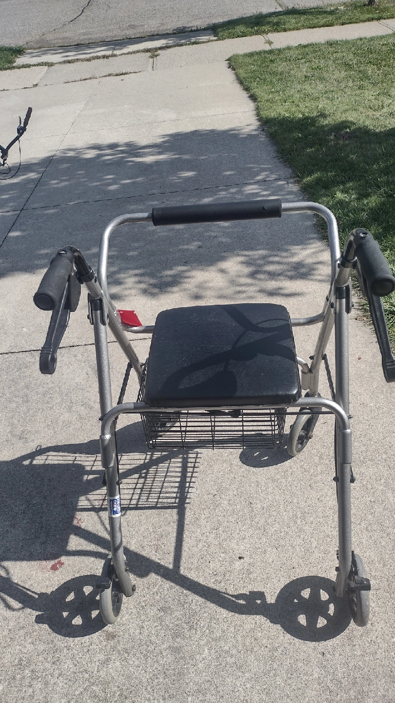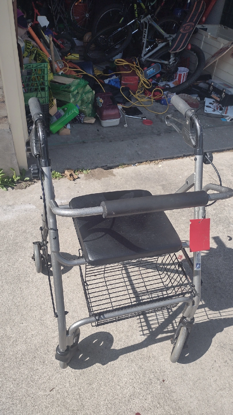 Selling a used mobility walker. It features a seat and a basket for convenience. Great for anyone needing a little extra support while getting around the neighbourhood