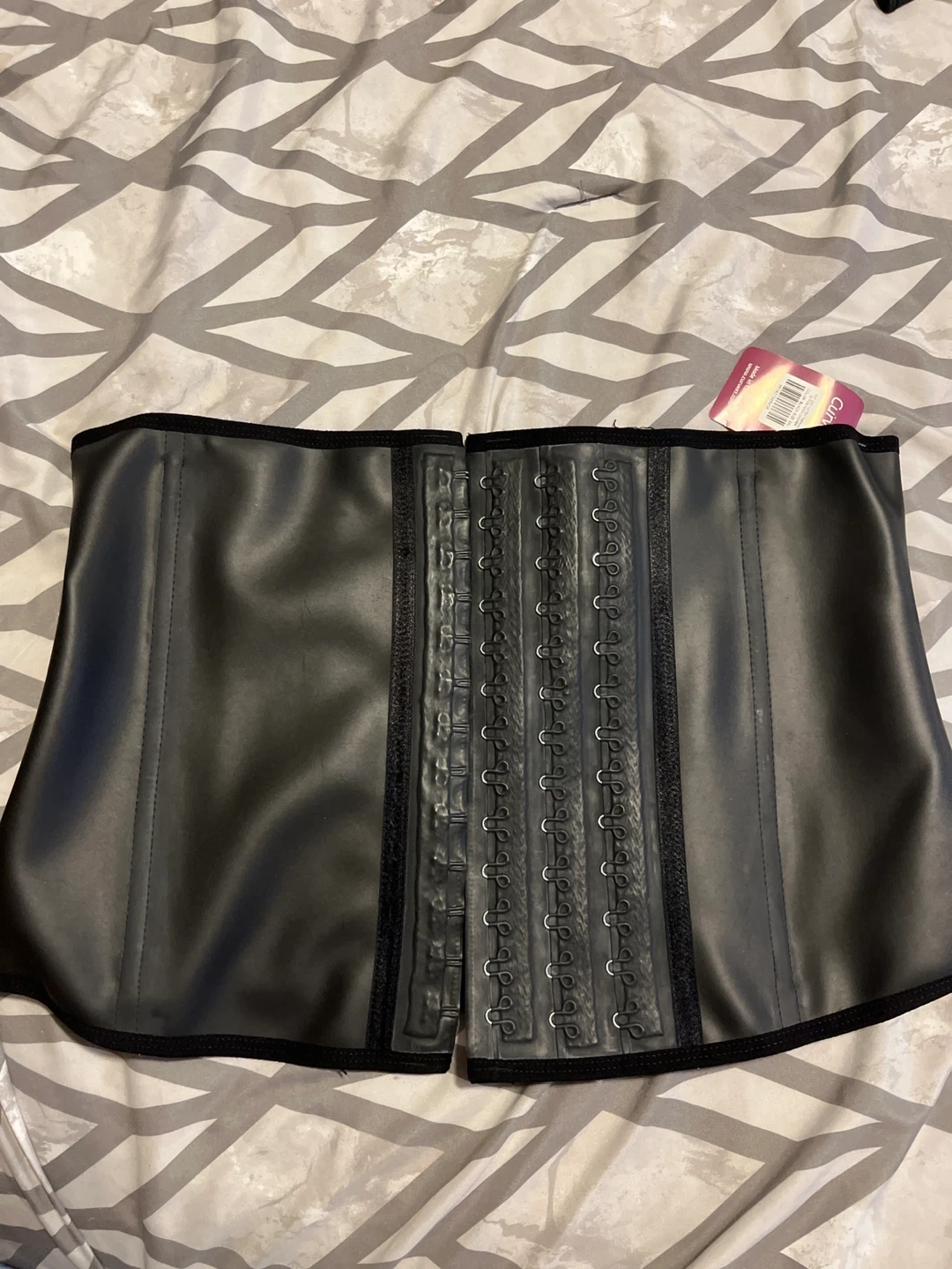 This is a black Curvy Kate corset belt. It's made of a latex-like material with hook and eye closures. The belt has boning for support.
