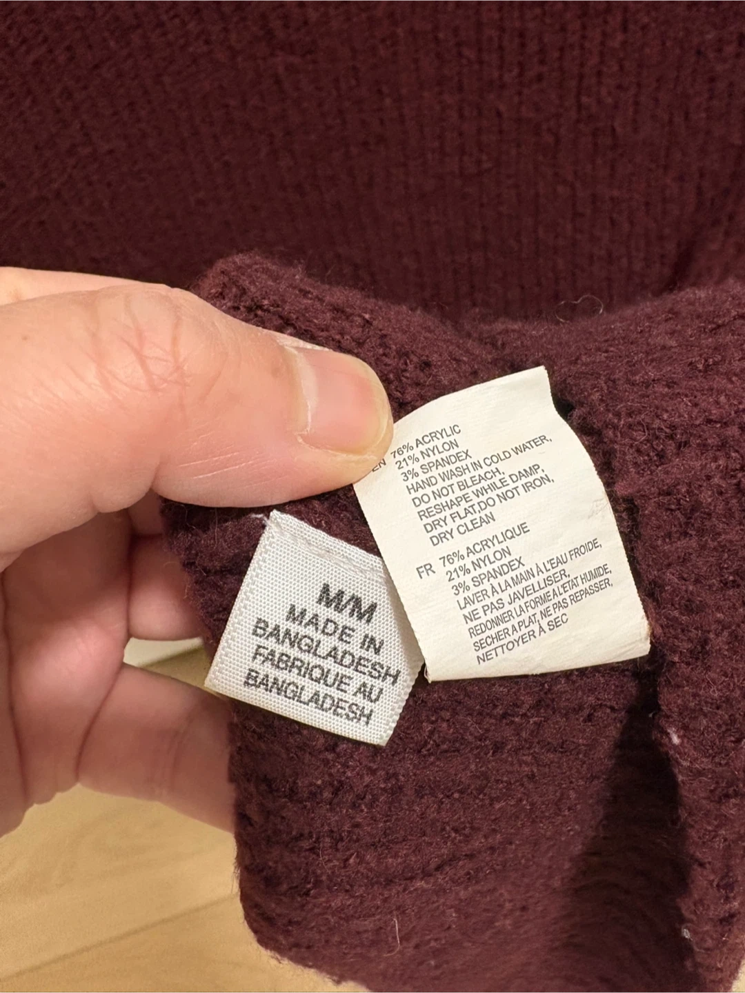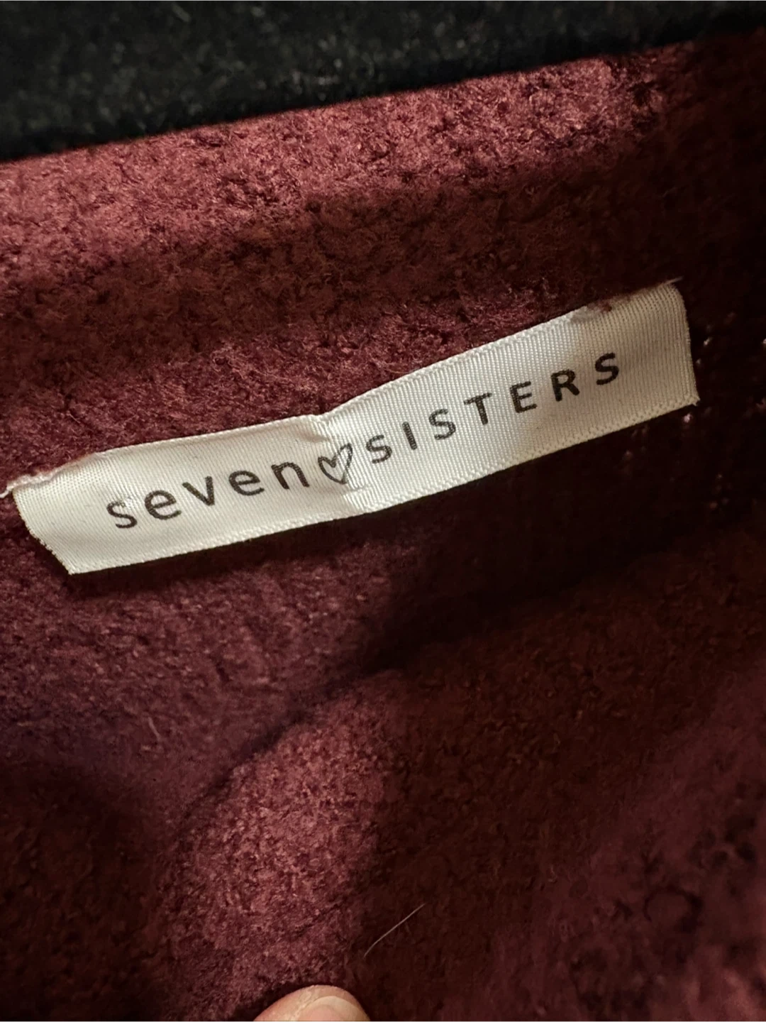 Cozy burgundy sweater from boutique Seven Sisters! It's a size medium and made of soft 76% acrylic, 21% nylon, and 3% spandex