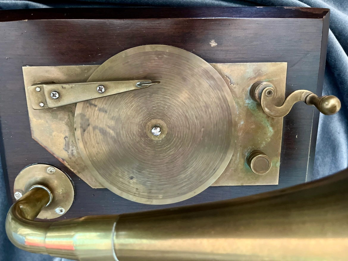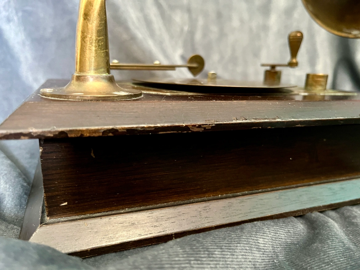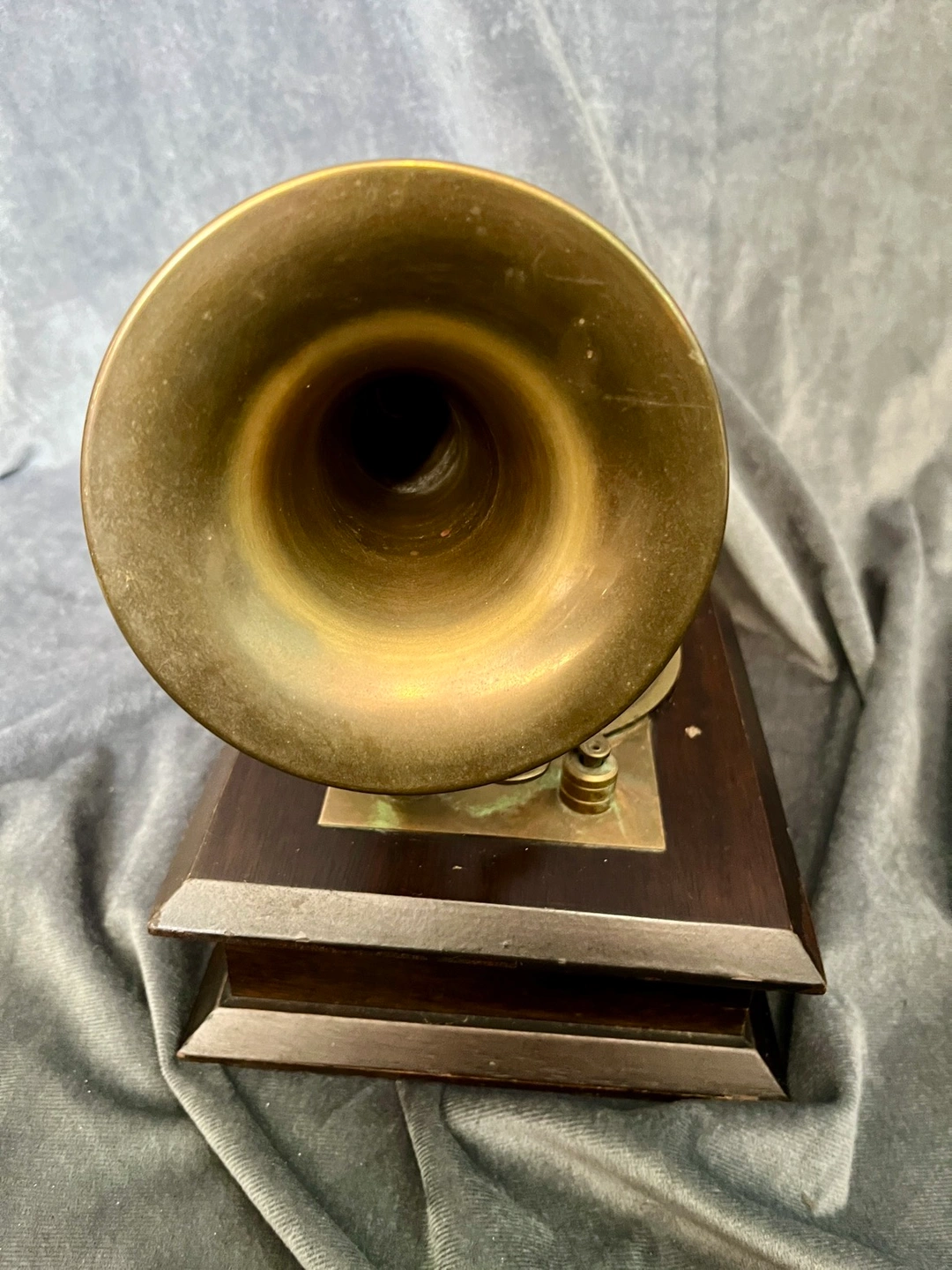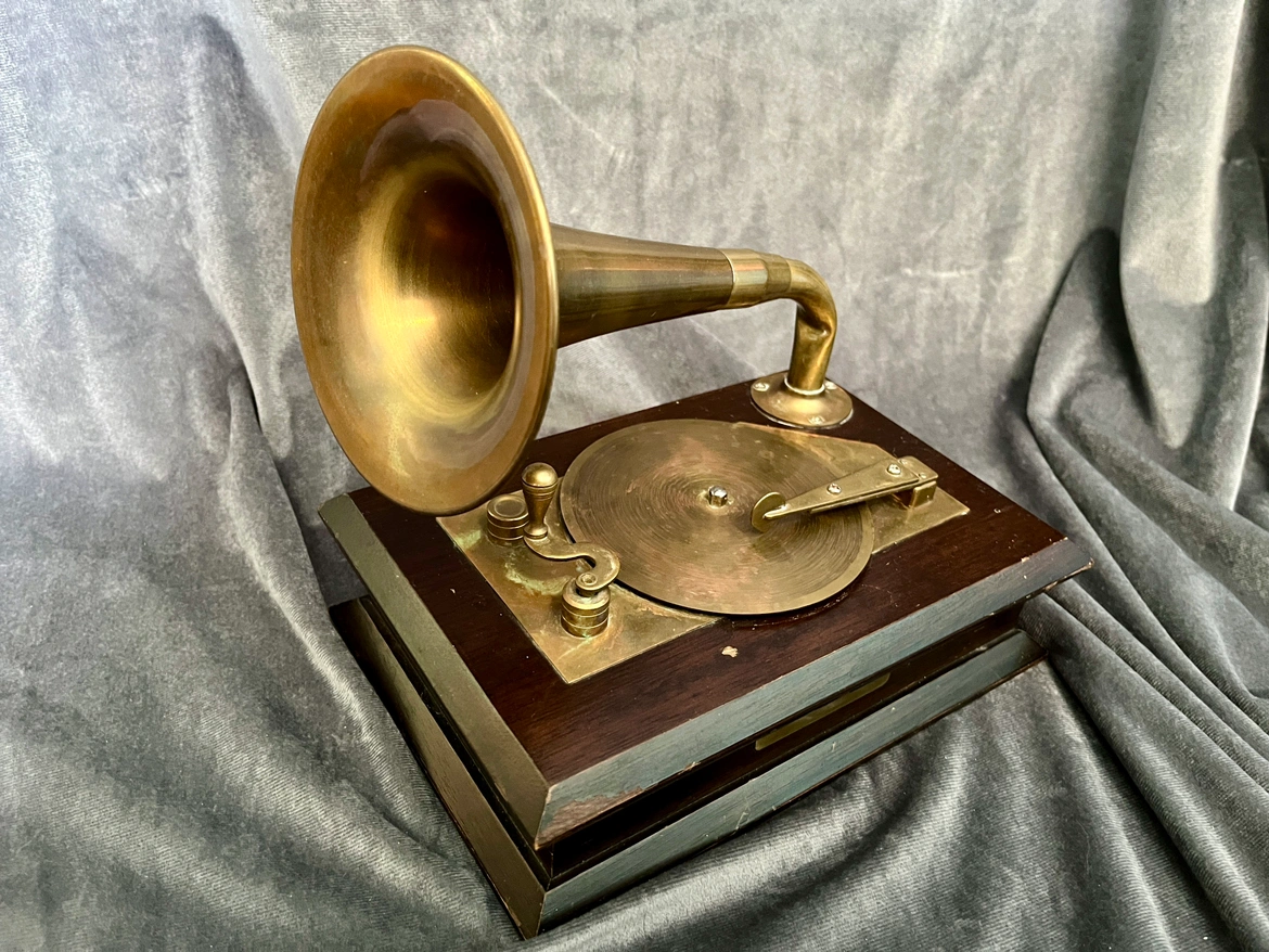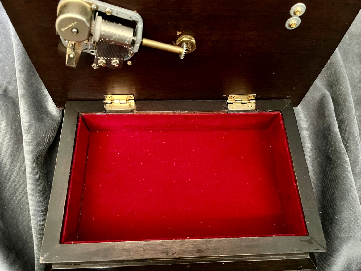 202This music box has a heavy metal brass coloured faux gramophone on top. The box opens on hinges to reveal a storage area. The music box plays a song I recognize but I cant figure out what it is. I have a short video if you want to see how it works but I can’t post it here. The wood has scratches and areas of wear, some of which are pictured. In the inside of lid there are also spots where holes previously had screws perhaps. The drawer is lined like a thin fake velvet feeling material. I’m not sure what year this was made. Pickup only. St. Clair West & Spadina Road area.