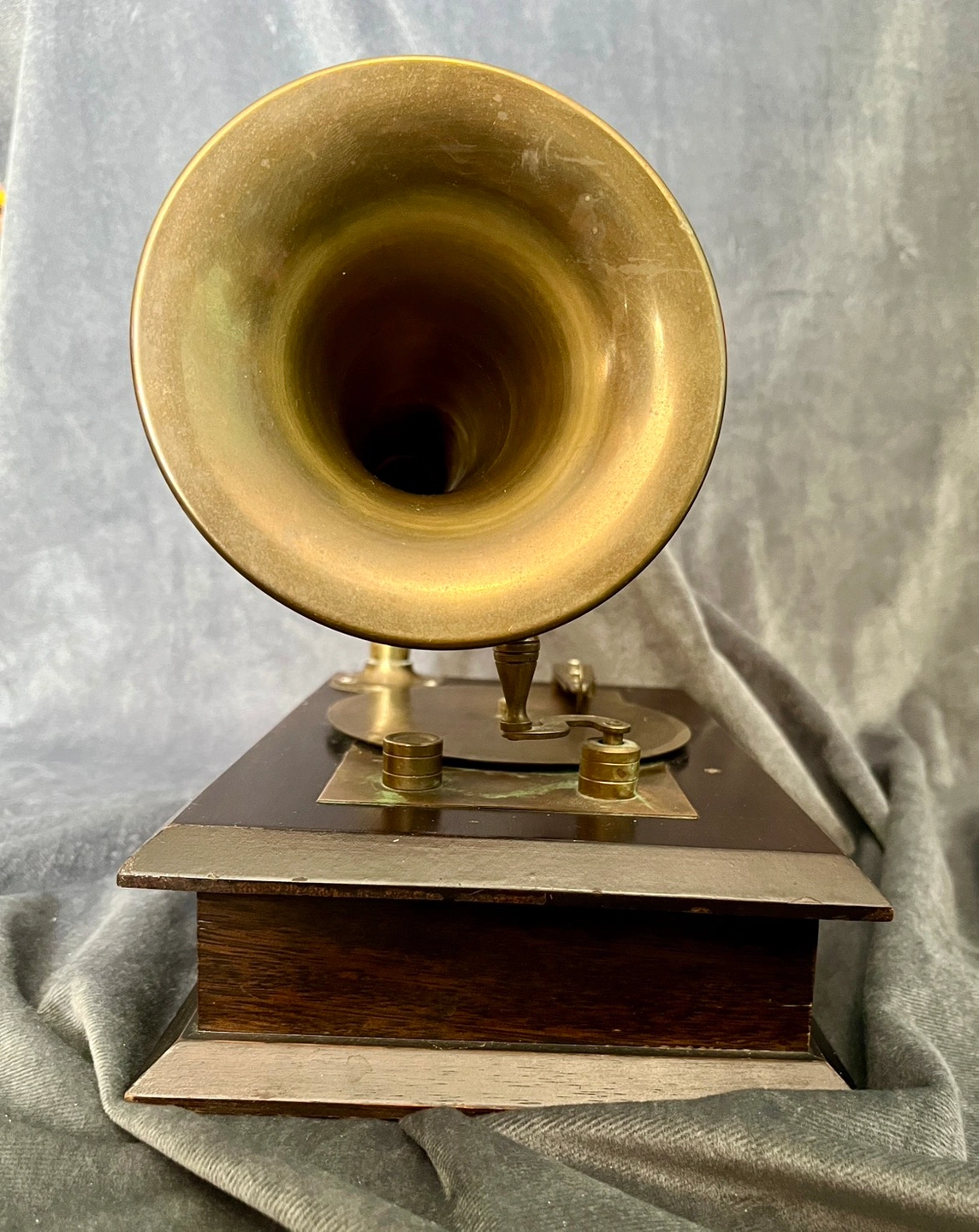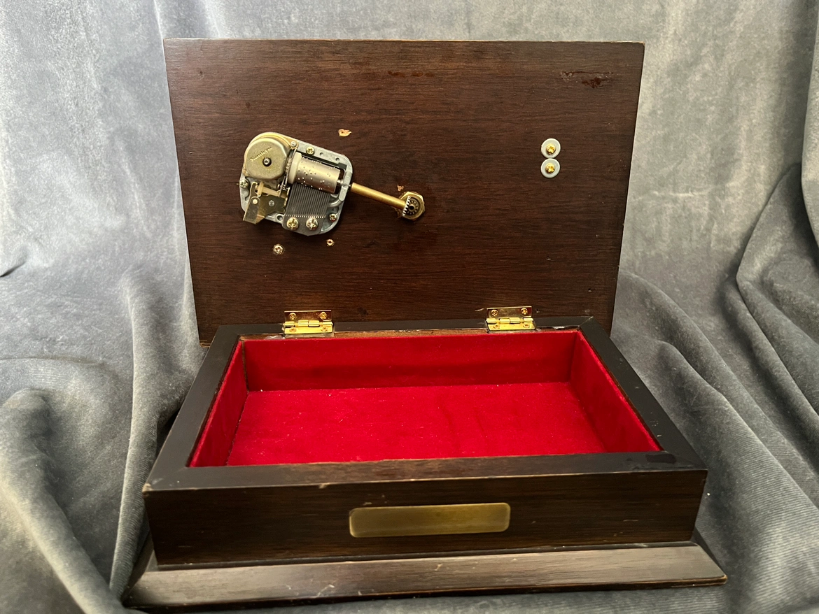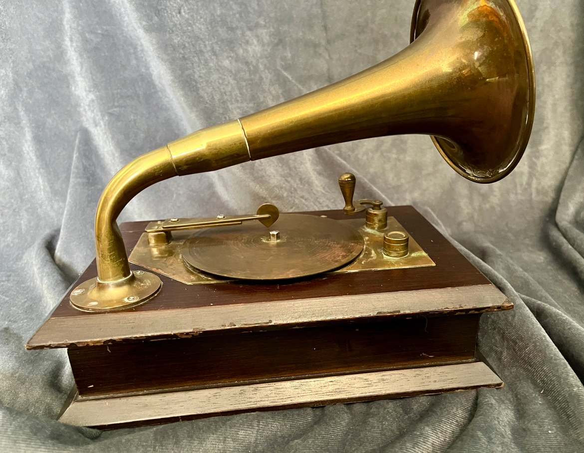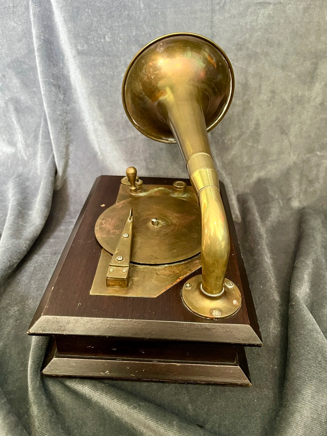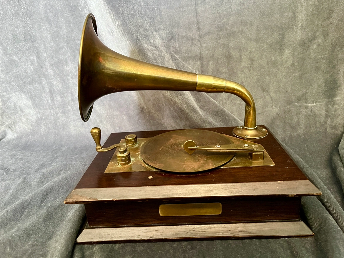 202This music box has a heavy metal brass coloured faux gramophone on top. The box opens on hinges to reveal a storage area. The music box plays a song I recognize but I cant figure out what it is. I have a short video if you want to see how it works but I can’t post it here. The wood has scratches and areas of wear, some of which are pictured. In the inside of lid there are also spots where holes previously had screws perhaps. The drawer is lined like a thin fake velvet feeling material. I’m not sure what year this was made. Pickup only. St. Clair West & Spadina Road area.