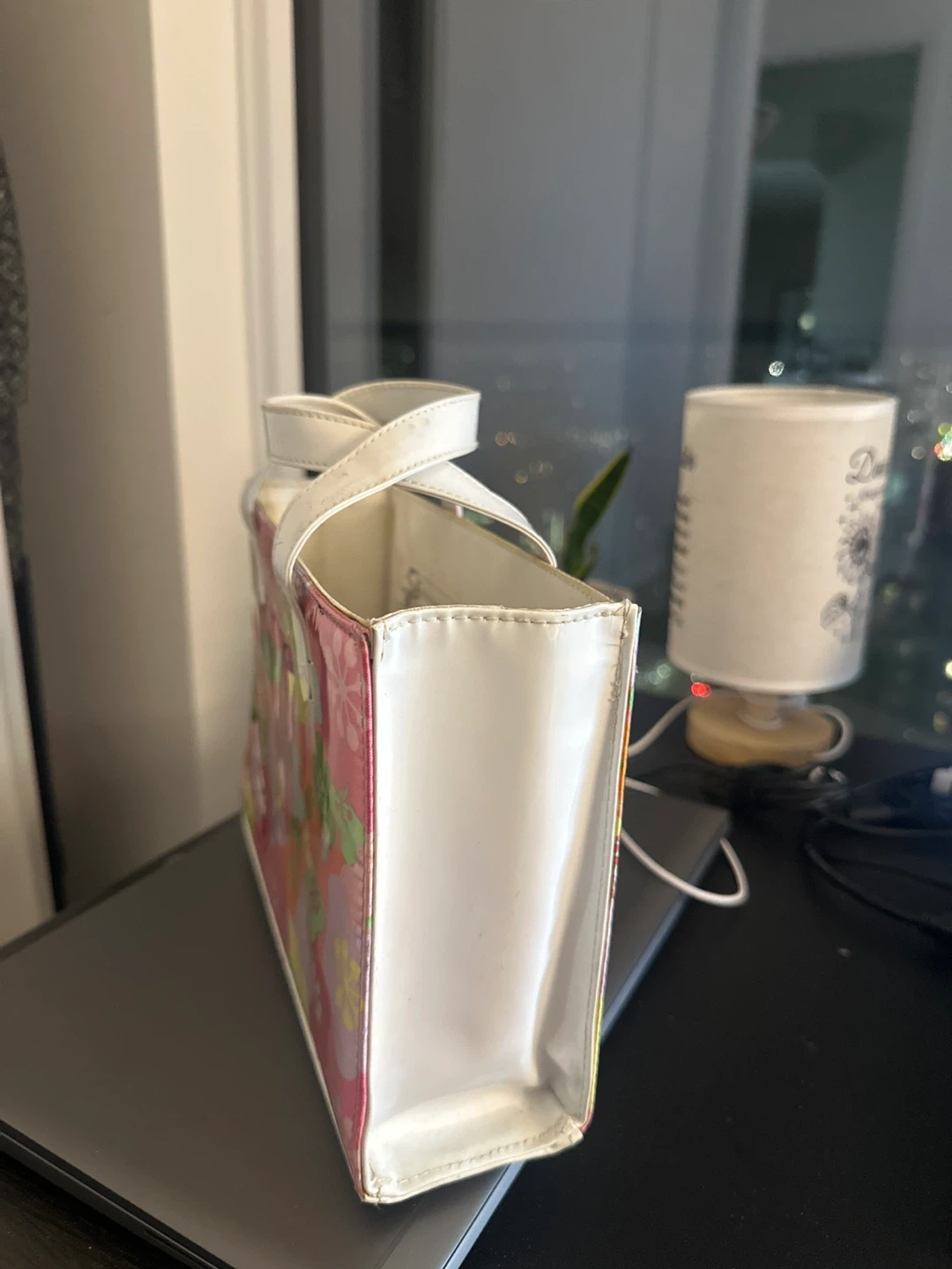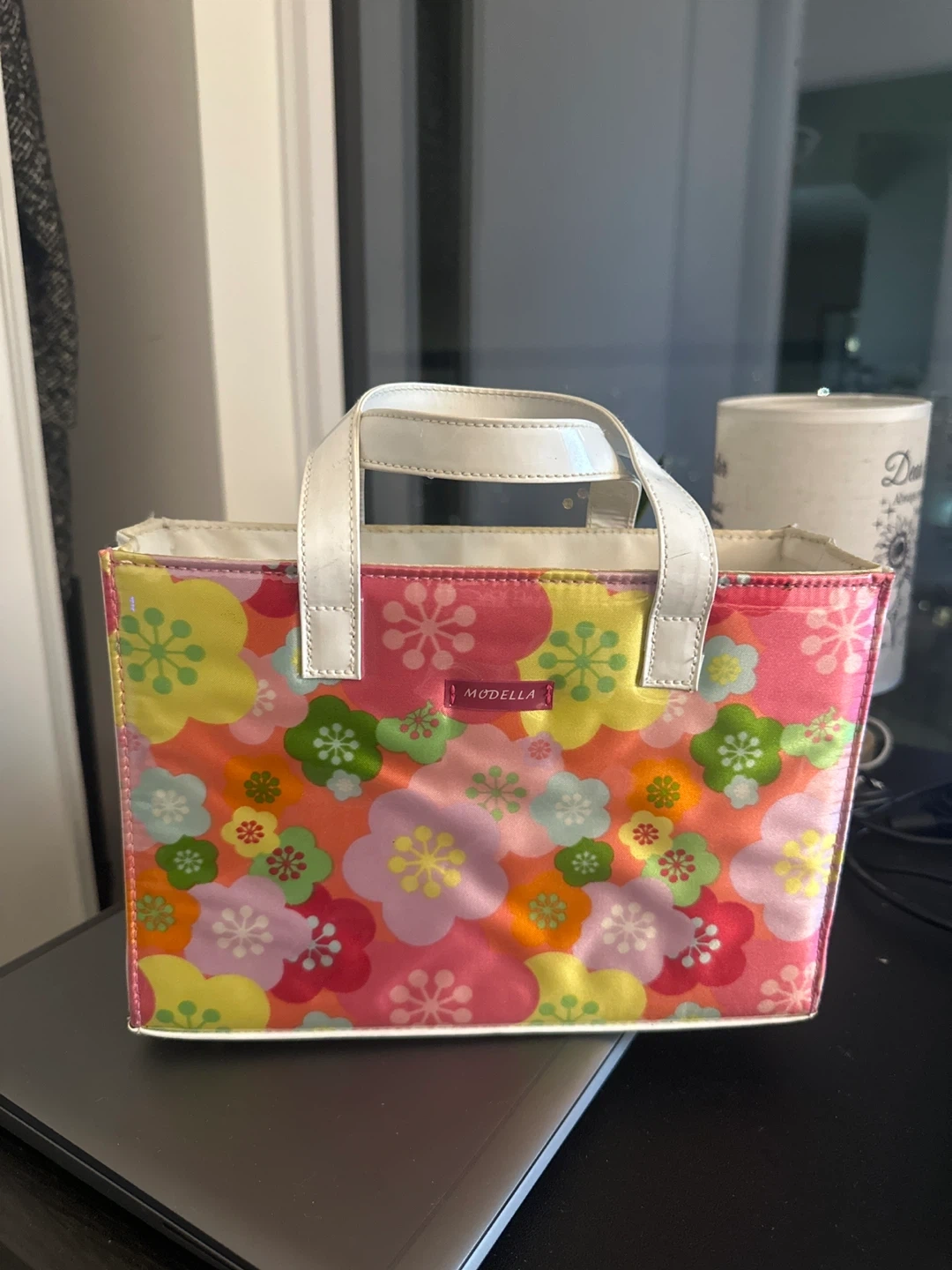 529Cute Modella tote bag with a colourful floral design! Great for carrying your essentials around town or using as a lunch bag. The interior is clean and ready for its next adventure!