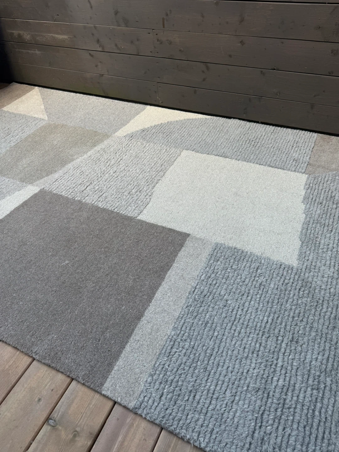 A stylish contemporary area rug featuring a Modern Geometric pattern in shades of grey. It's in great condition and would look lovely in any living room or bedroom. Measures 60” wide X 96” long (5’x8’)