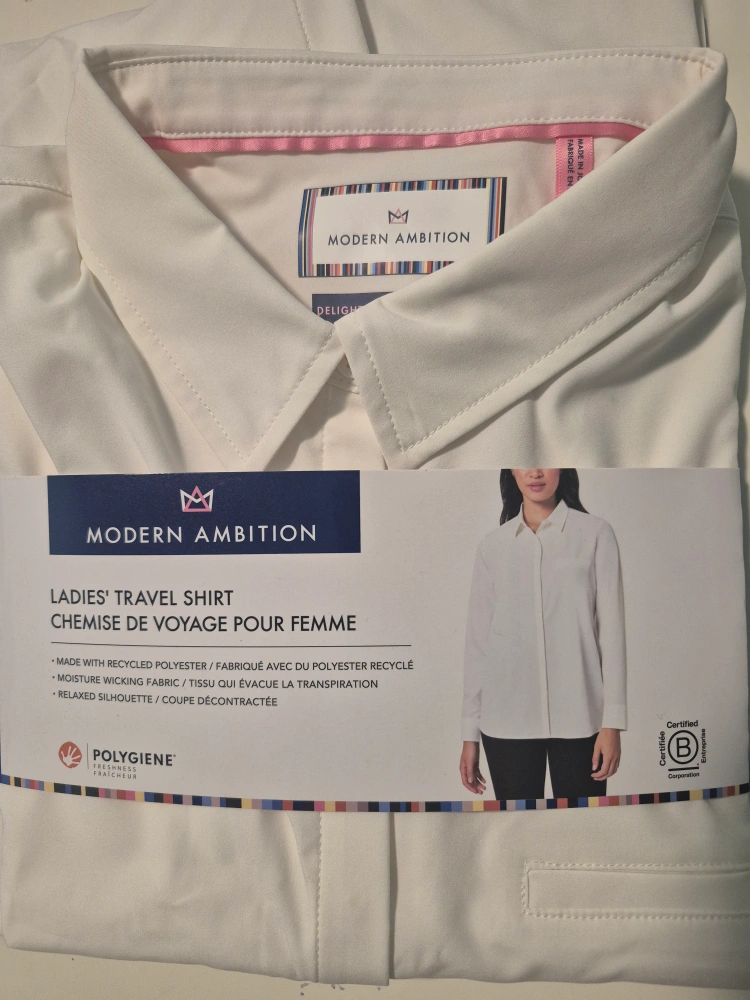 15Selling a Modern Ambition Ladies' Travel Shirt in white, size large! It's made with recycled polyester and has a moisture-wicking fabric. The shirt features a relaxed silhouette and is delightfully technical