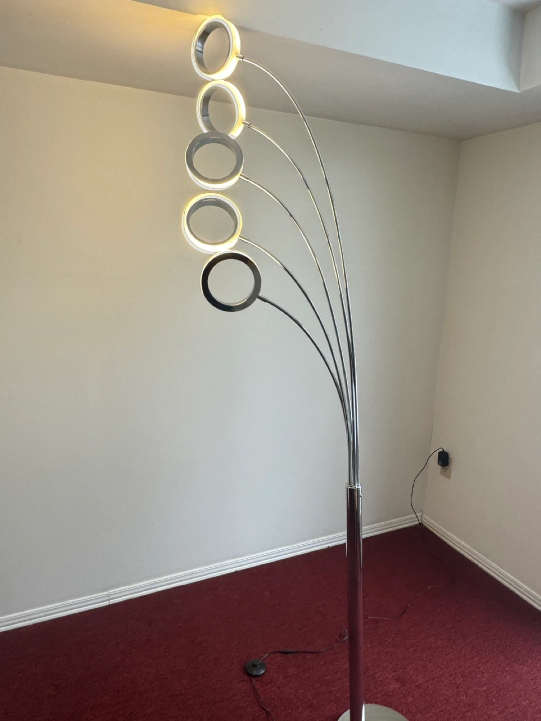 65Here's a modern arc floor lamp in great condition! It has a sleek design with multiple light rings that create a nice ambient glow. Perfect for adding a touch of style to any room