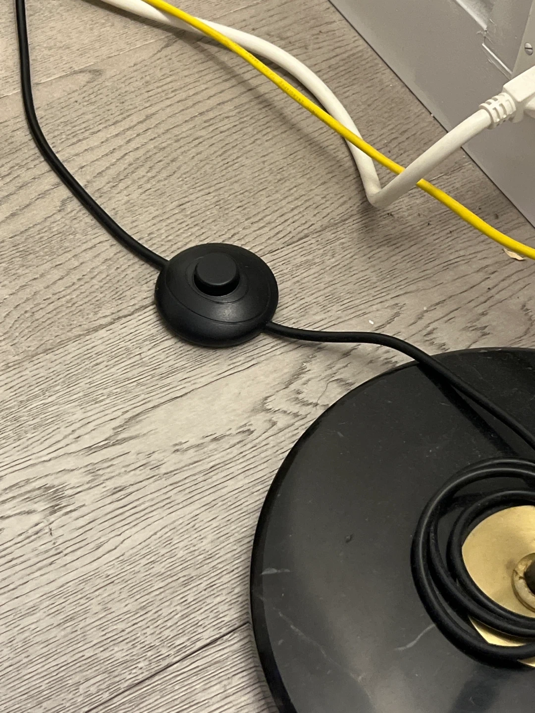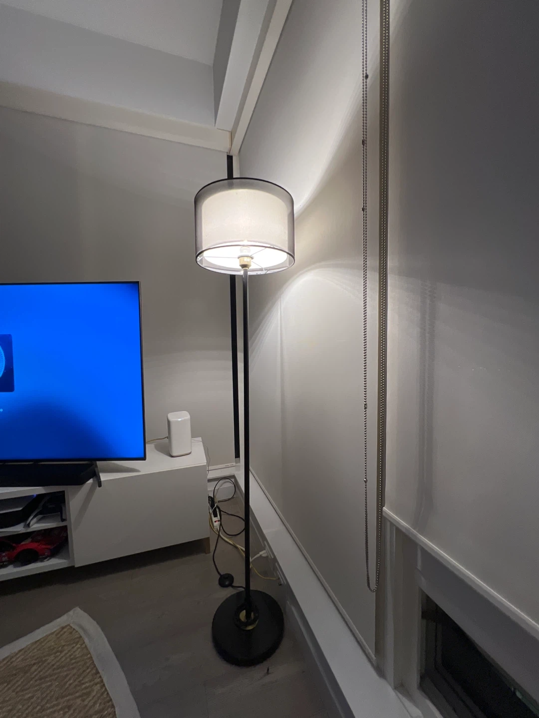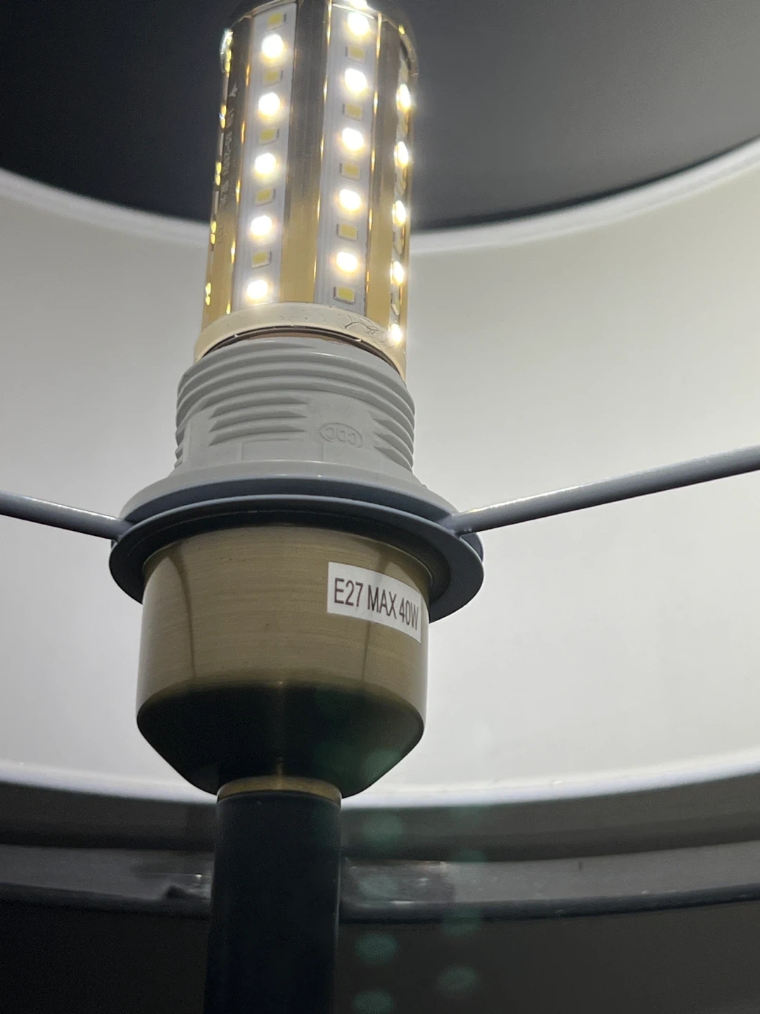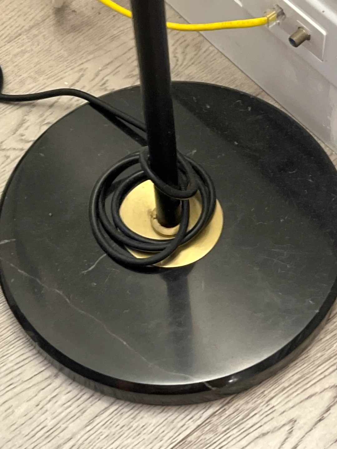 Selling a modern floor lamp with a black and brass finish. It features a round base and a drum shade. The lamp uses an E27 Max 40W bulb. Great for adding some stylish lighting to any room!
