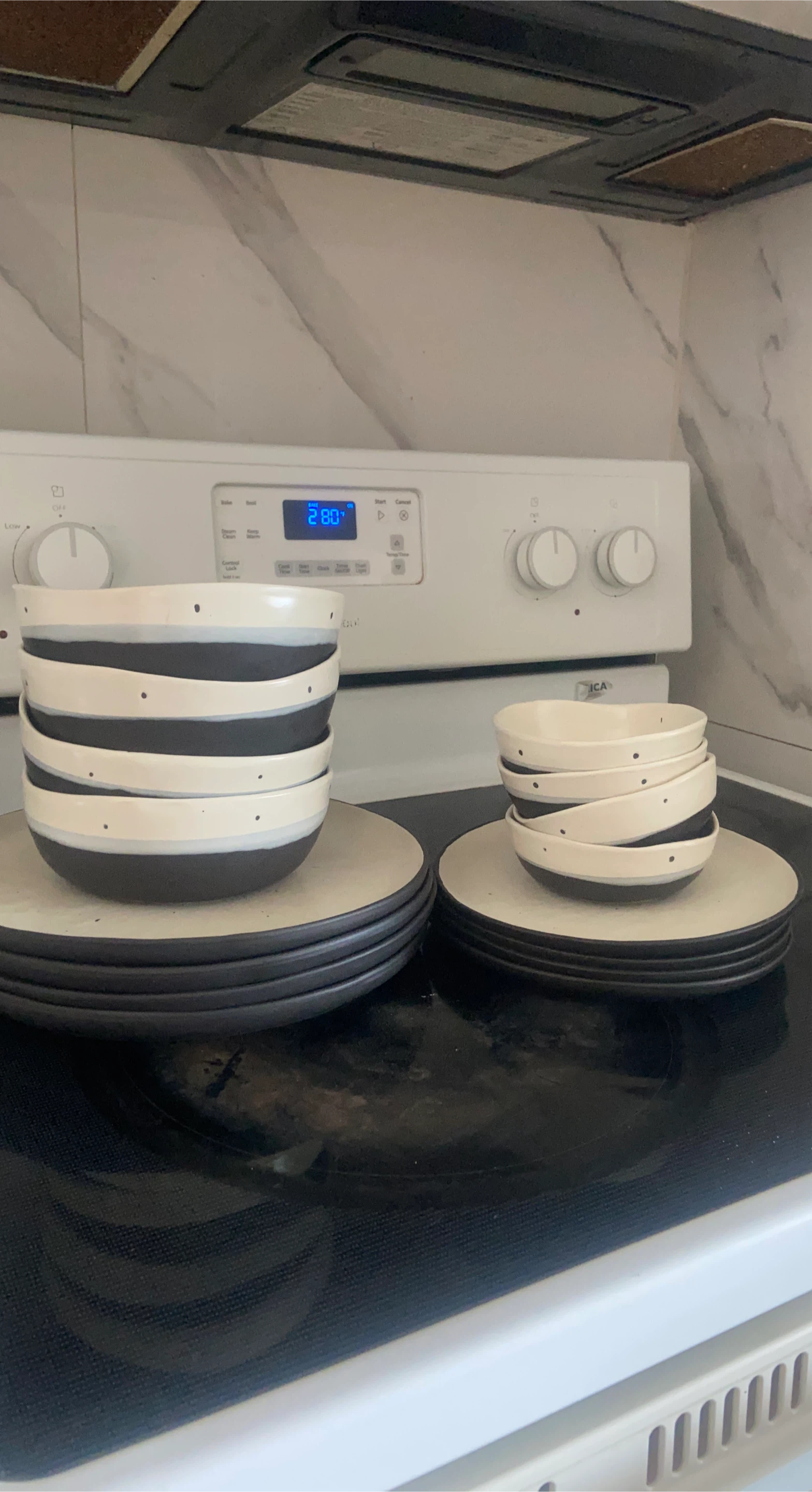 74Selling a stylish dinnerware set featuring a modern black and white design! Includes plates and bowls, perfect for adding a touch of elegance to your dining experience