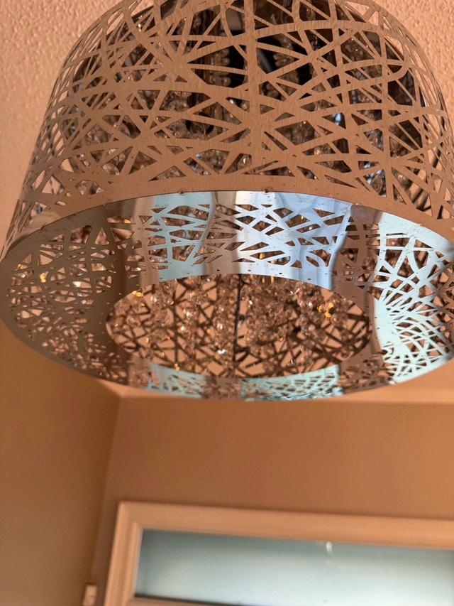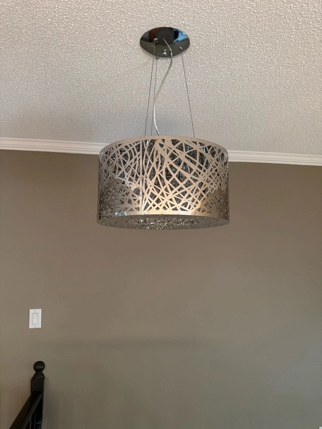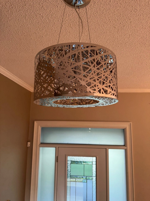 10Beautiful modern pendant light with a chrome geometric design. Provides elegant lighting and a stylish touch to any entryway, dining room, or hallway. In excellent condition and fully functional. Dimensions: approx. 12” high x 14” wide. Easy to install. Uses standard light bulbs $30 OBO PICK UP ONLY For Sale By: Owner