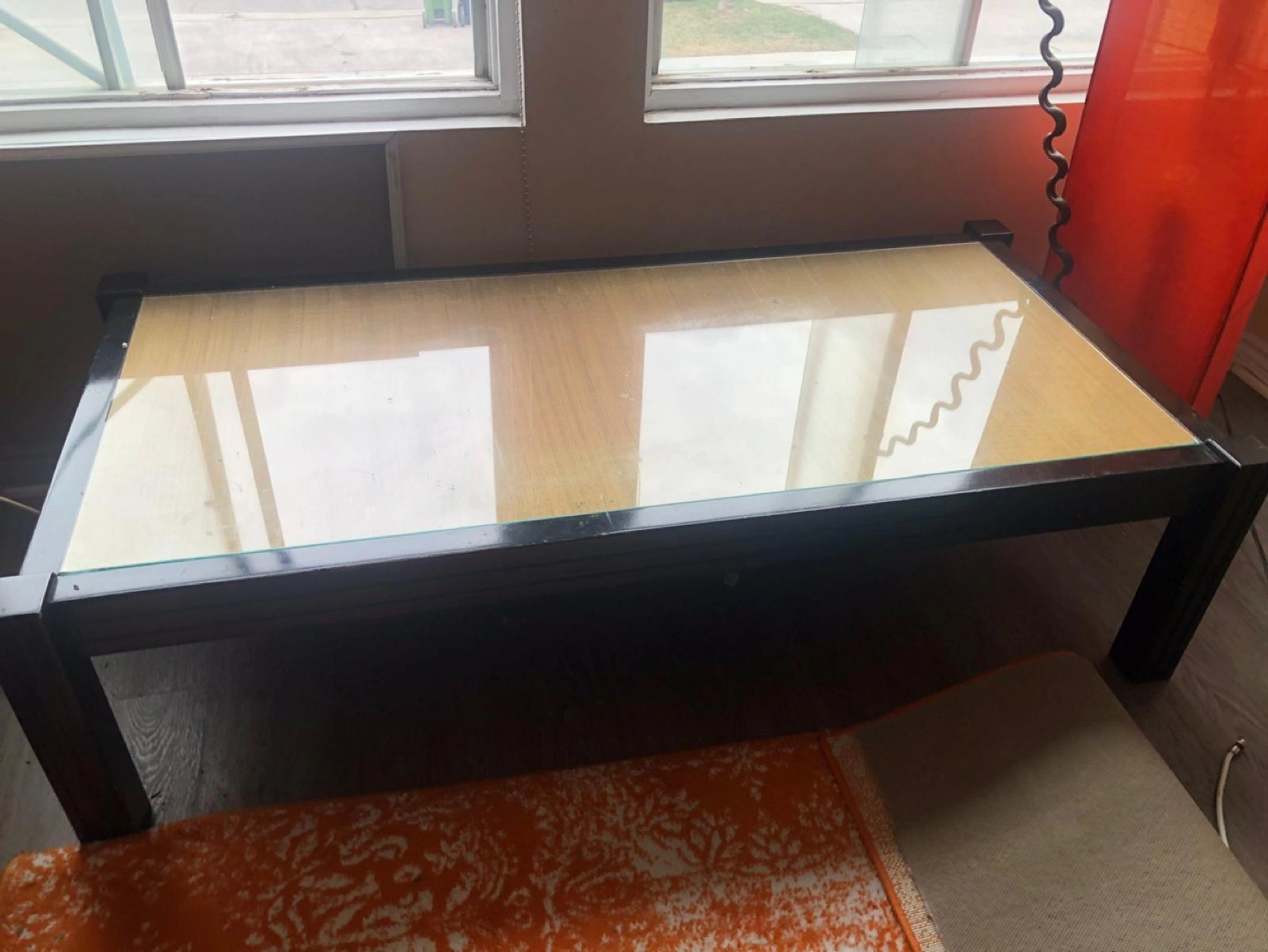 5Rectangular coffee table. Black frame, light wood top, and glass covering. Simple design, great for a retro or minimalist space. $90 or best offer. Great condition !