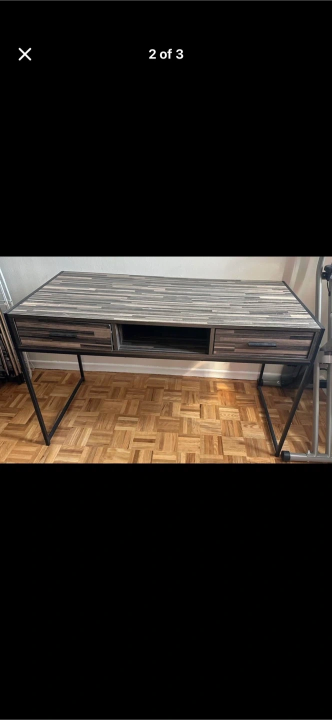12Here's a stylish desk with drawers, perfect for your home office or study space! It features a unique wood-grain design on the top and drawers, complemented by a sturdy black metal frame. It's in great shape and ready for a new home
