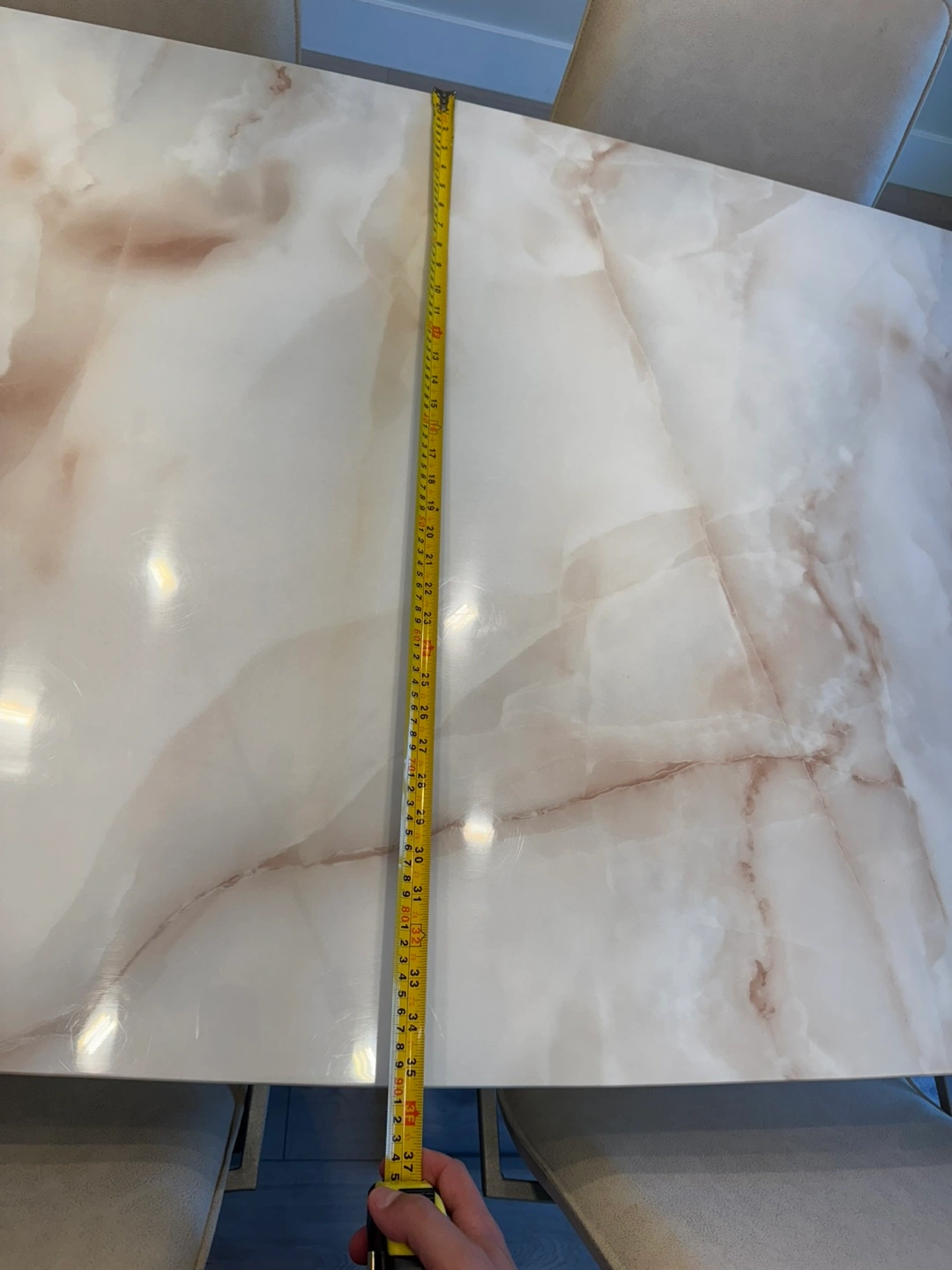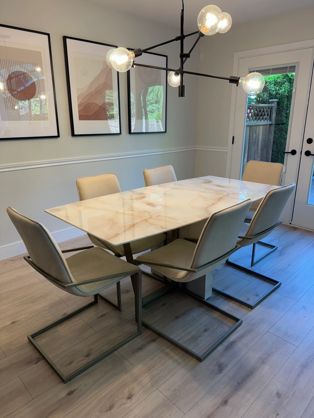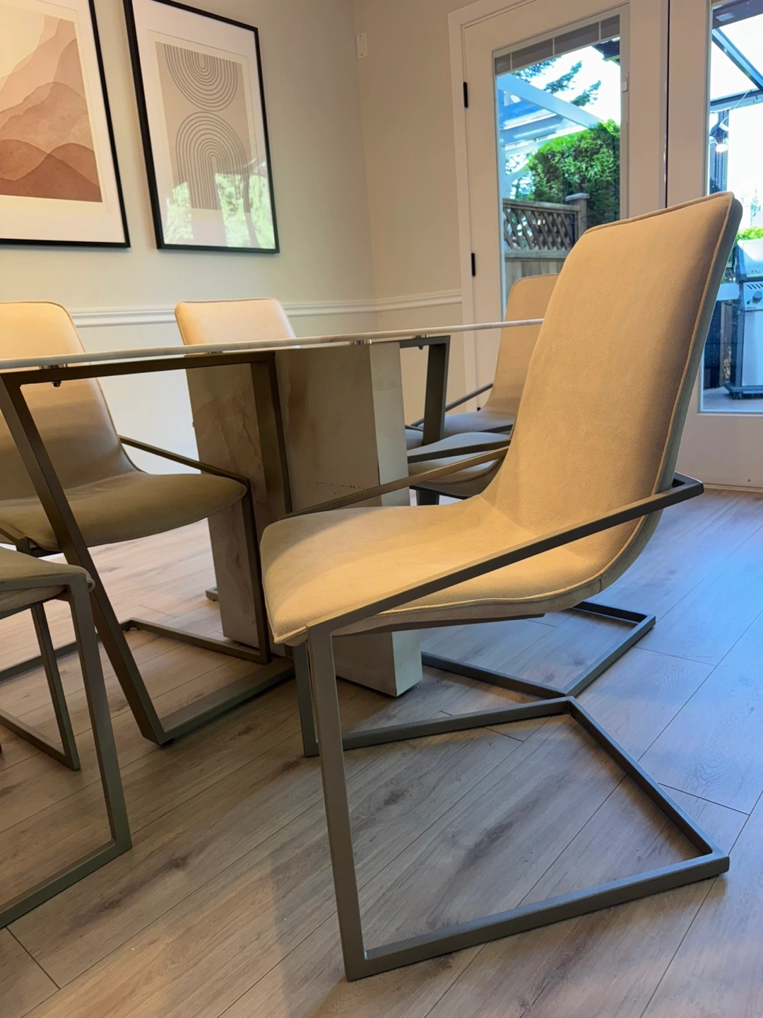 Beautiful modern dining set featuring a rectangular glass tabletop with a marble-effect finish and a sturdy base. Comes with 6 upholstered chairs with metal frames and a modern design in beige suede fabric. Condition: excellent overall; the table base shows some signs of wear Perfect for adding a contemporary touch to your dining room. PU Walnut Grove