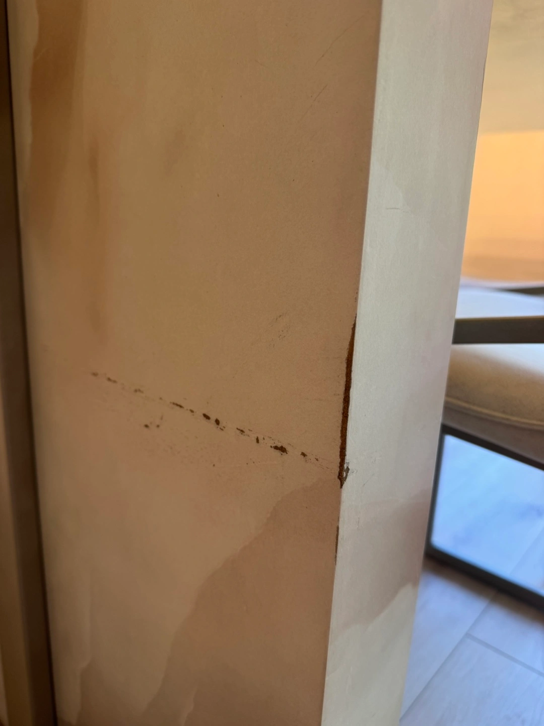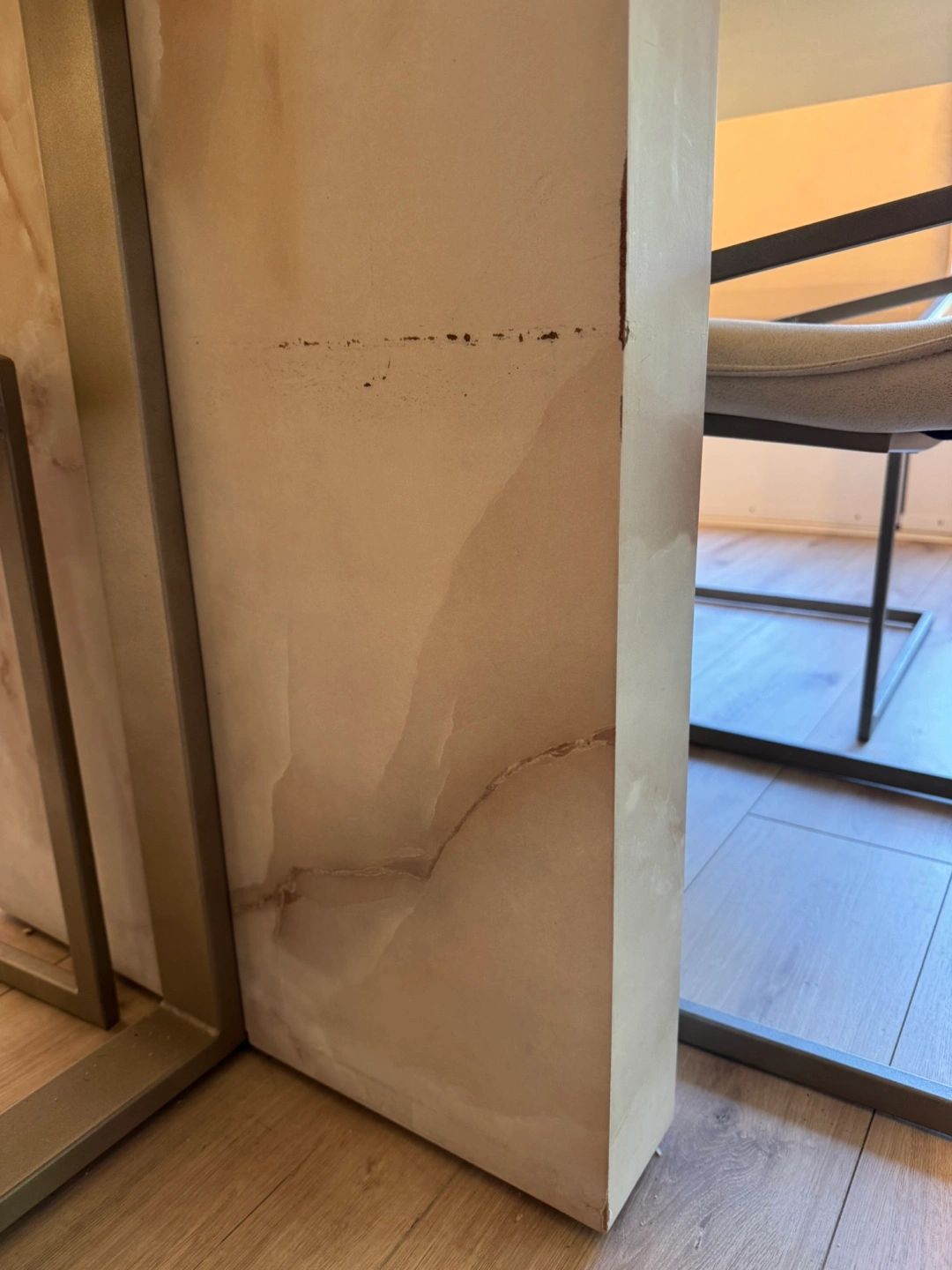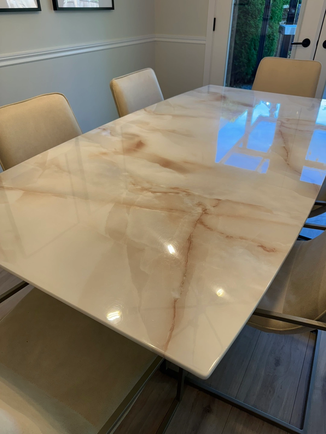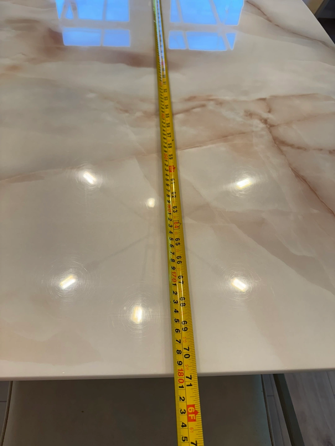 Beautiful modern dining set featuring a rectangular glass tabletop with a marble-effect finish and a sturdy base. Comes with 6 upholstered chairs with metal frames and a modern design in beige suede fabric. Condition: excellent overall; the table base shows some signs of wear Perfect for adding a contemporary touch to your dining room. PU Walnut Grove