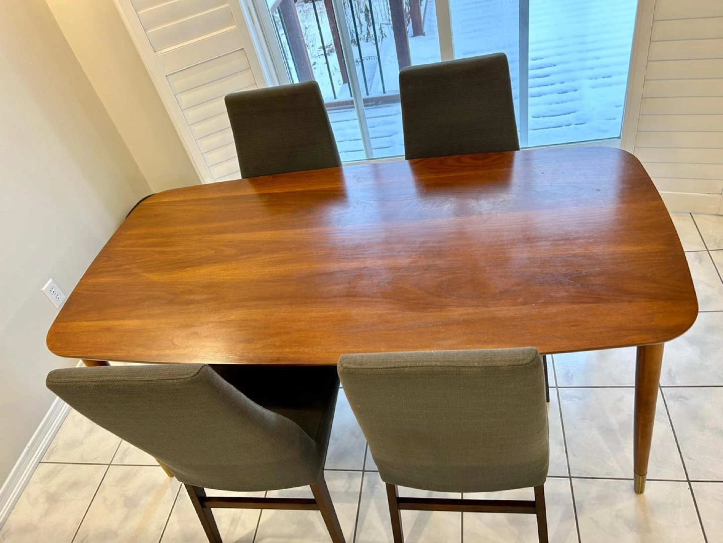 Beautiful dining set. Includes a mid-century modern style dining table and four matching chairs. Table features a rich wood finish and slightly tapered legs with brass accents. Chairs upholstered in a dark grey fabric. Great for smaller spaces. - Bought from Structube 2 yrs ago Table - width-169 cm / Depth -85 cm / Height- 76 cm Chair - width - 54cm / Depth - 46cm/ height - 101cm