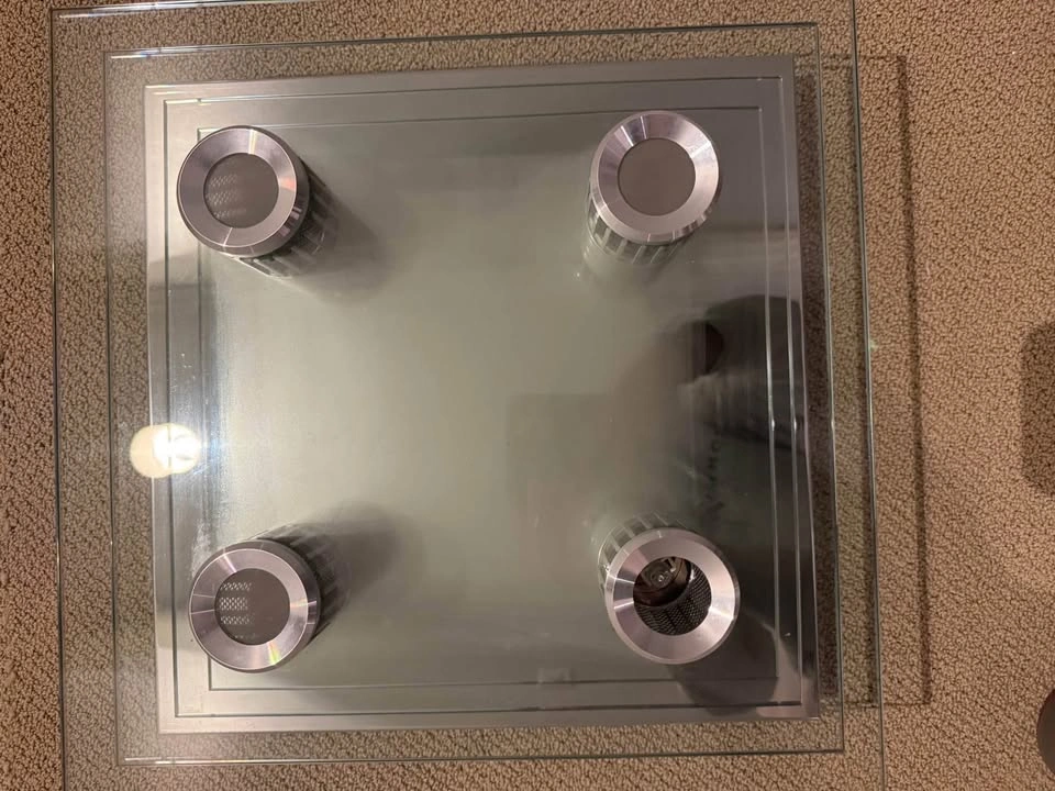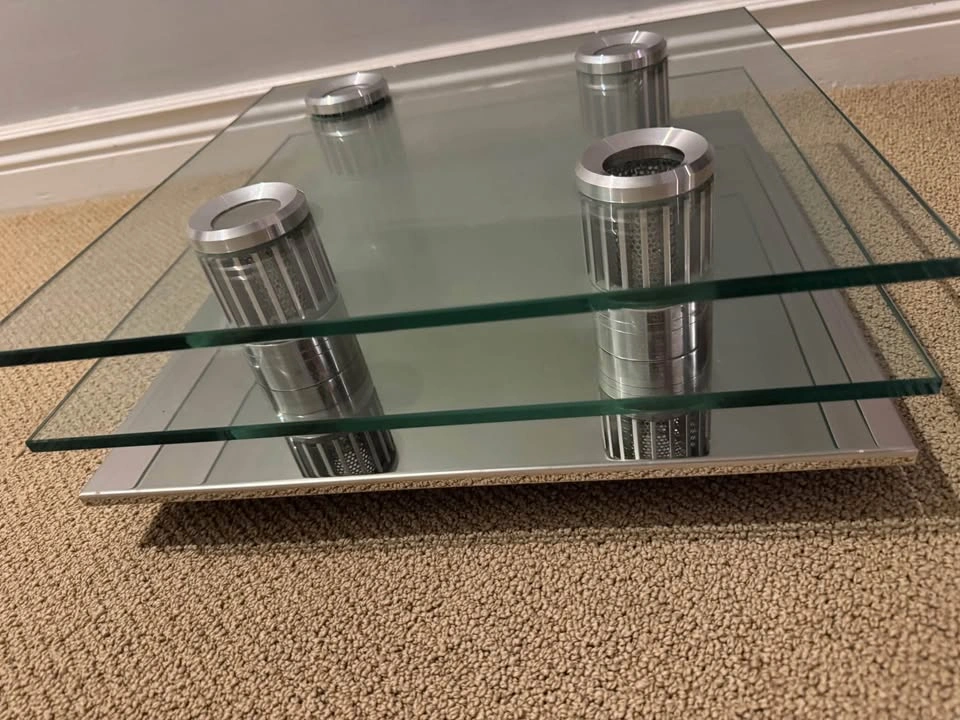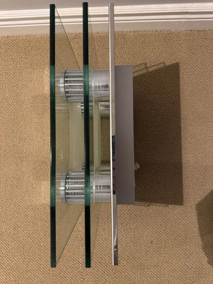 27Contemporary ceiling light with thick glass panels and chrome details. Stylish and bright — ideal for modern interiors such as living rooms, dining rooms, or entryways. It’s compatible with European wiring and fittings. One bulb cover lid is missing (as shown), but it’s otherwise in great condition and fully functional.