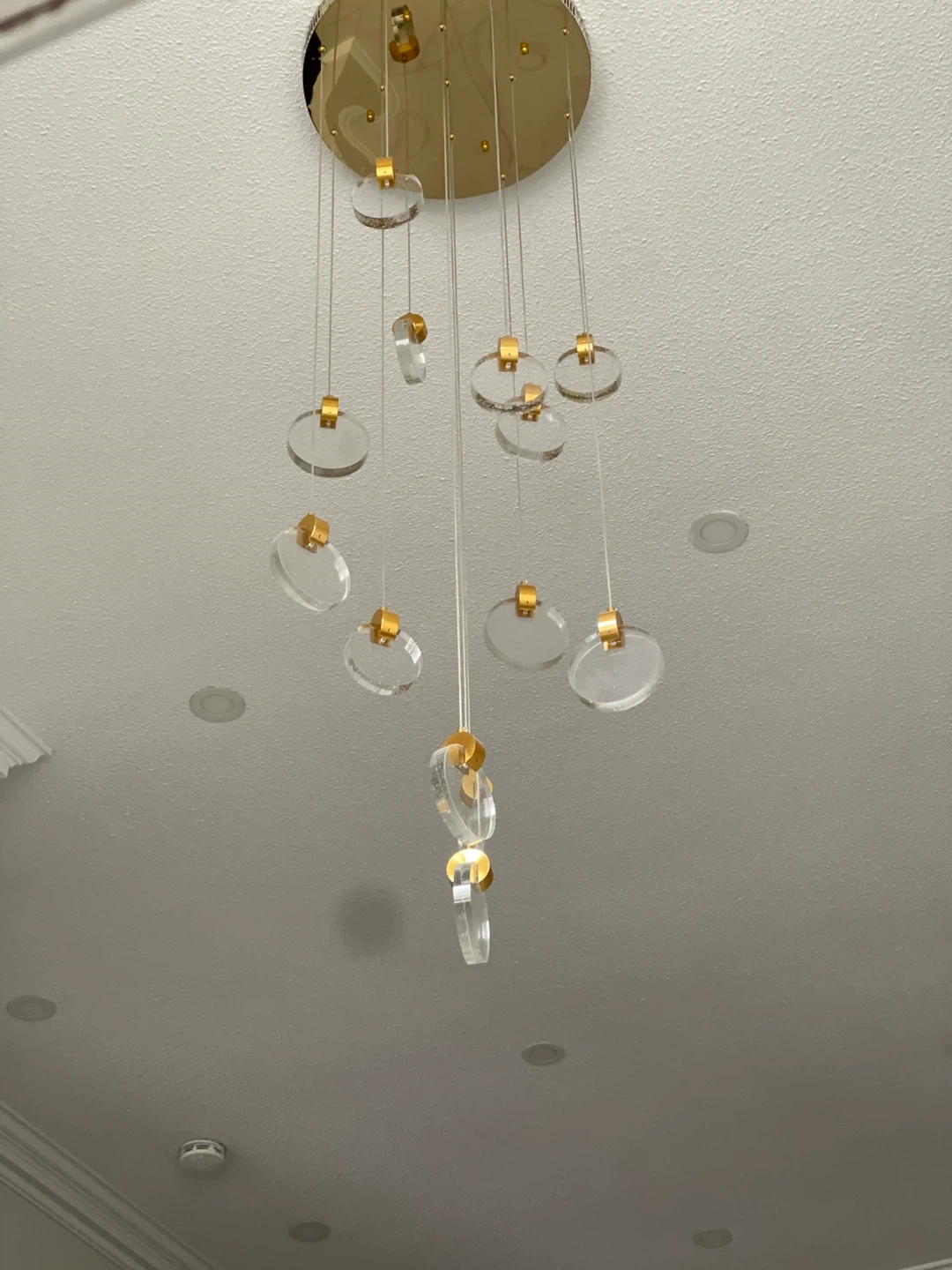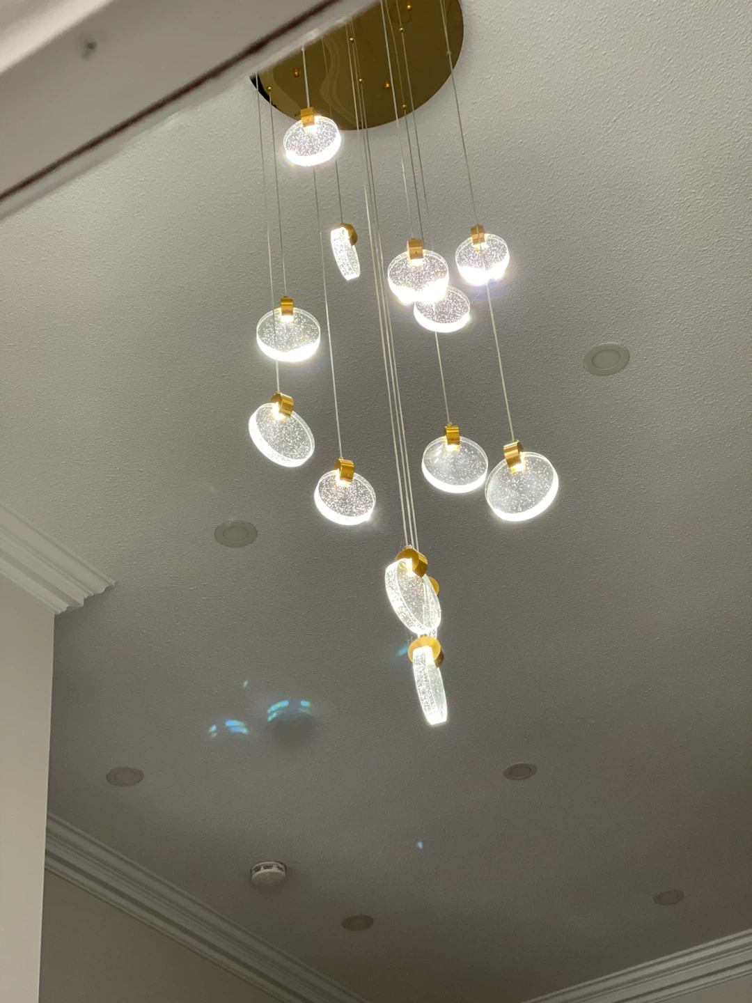 70Add a touch of modern elegance to your home with this beautiful chandelier! It features a gold finish and clear acrylic bubbles, creating a unique and eye-catching design. Perfect for a dining room, living room, or entryway