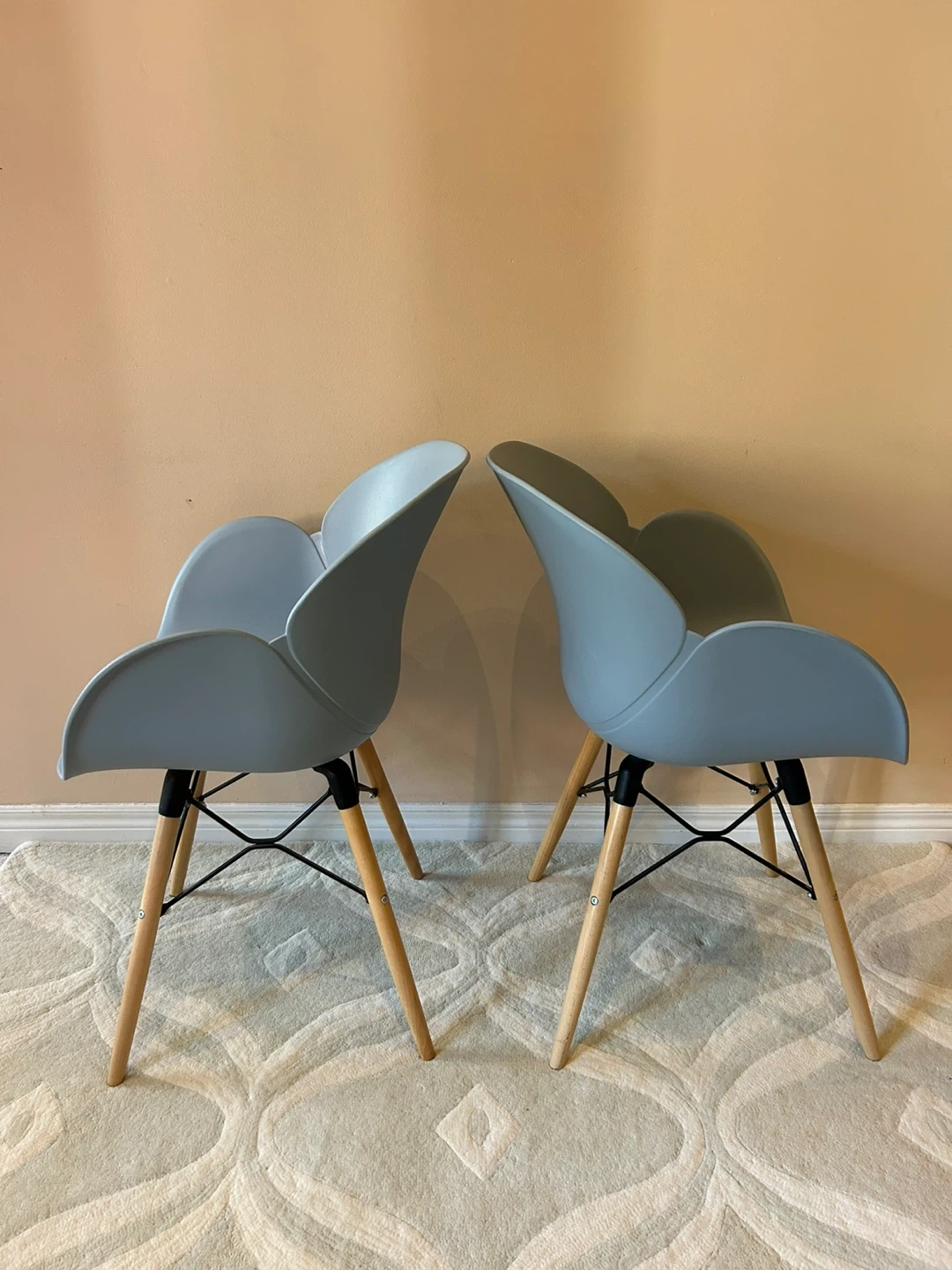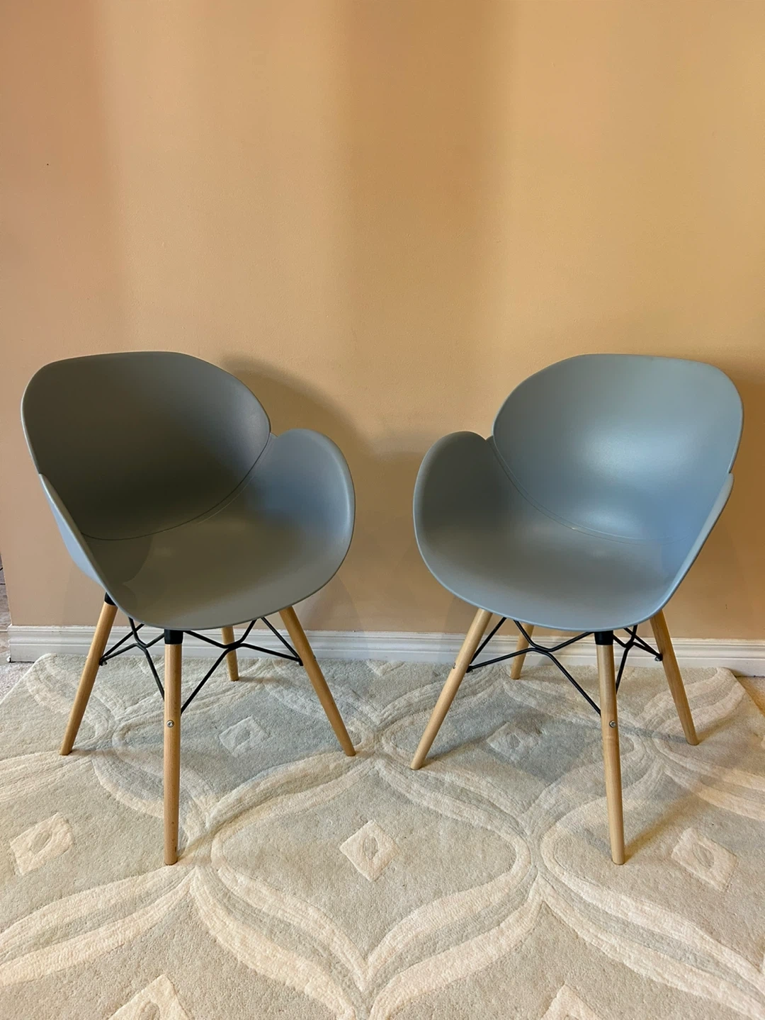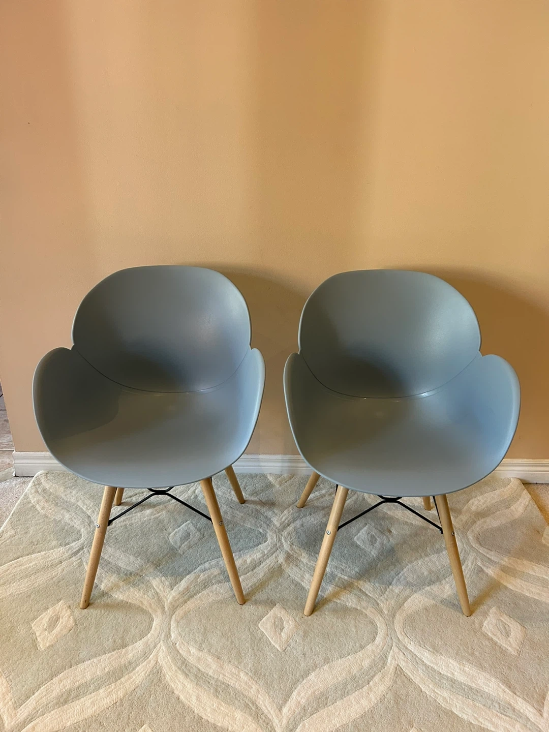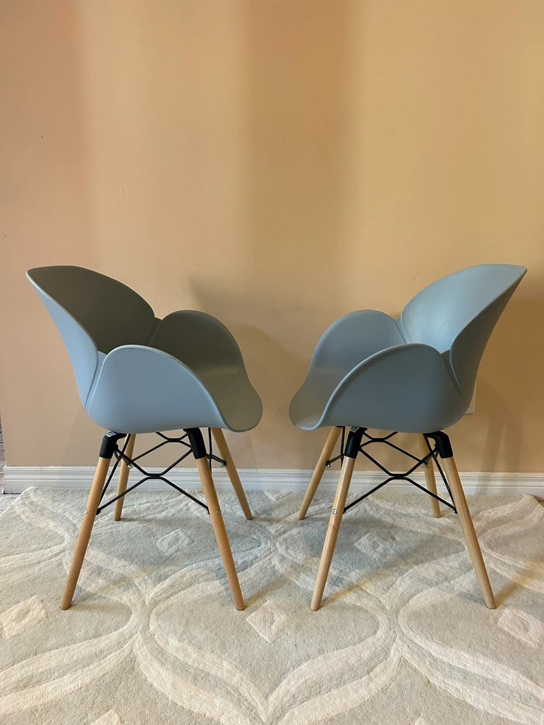Selling a set of two modern accent chairs. They are in great condition and have a unique, stylish design with wooden legs. Perfect for adding a touch of contemporary flair to any room!