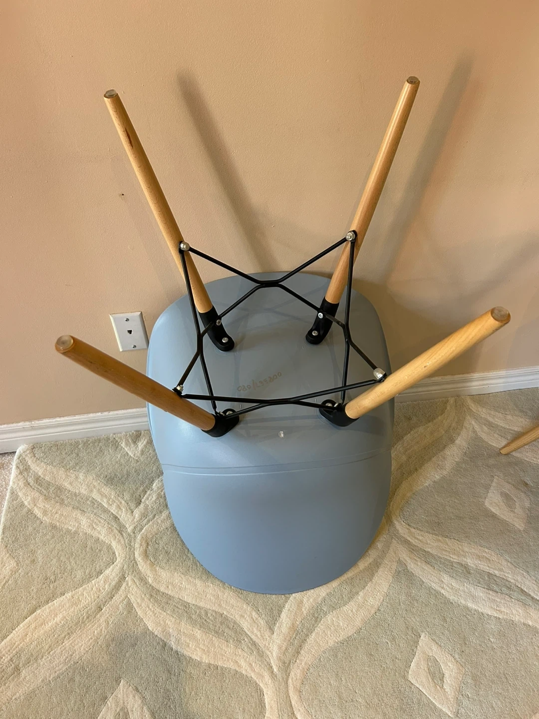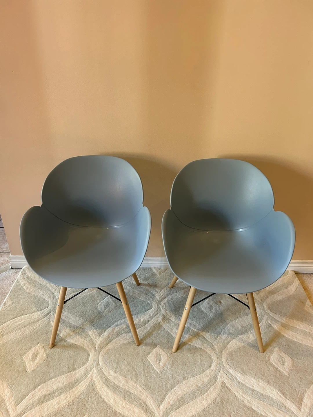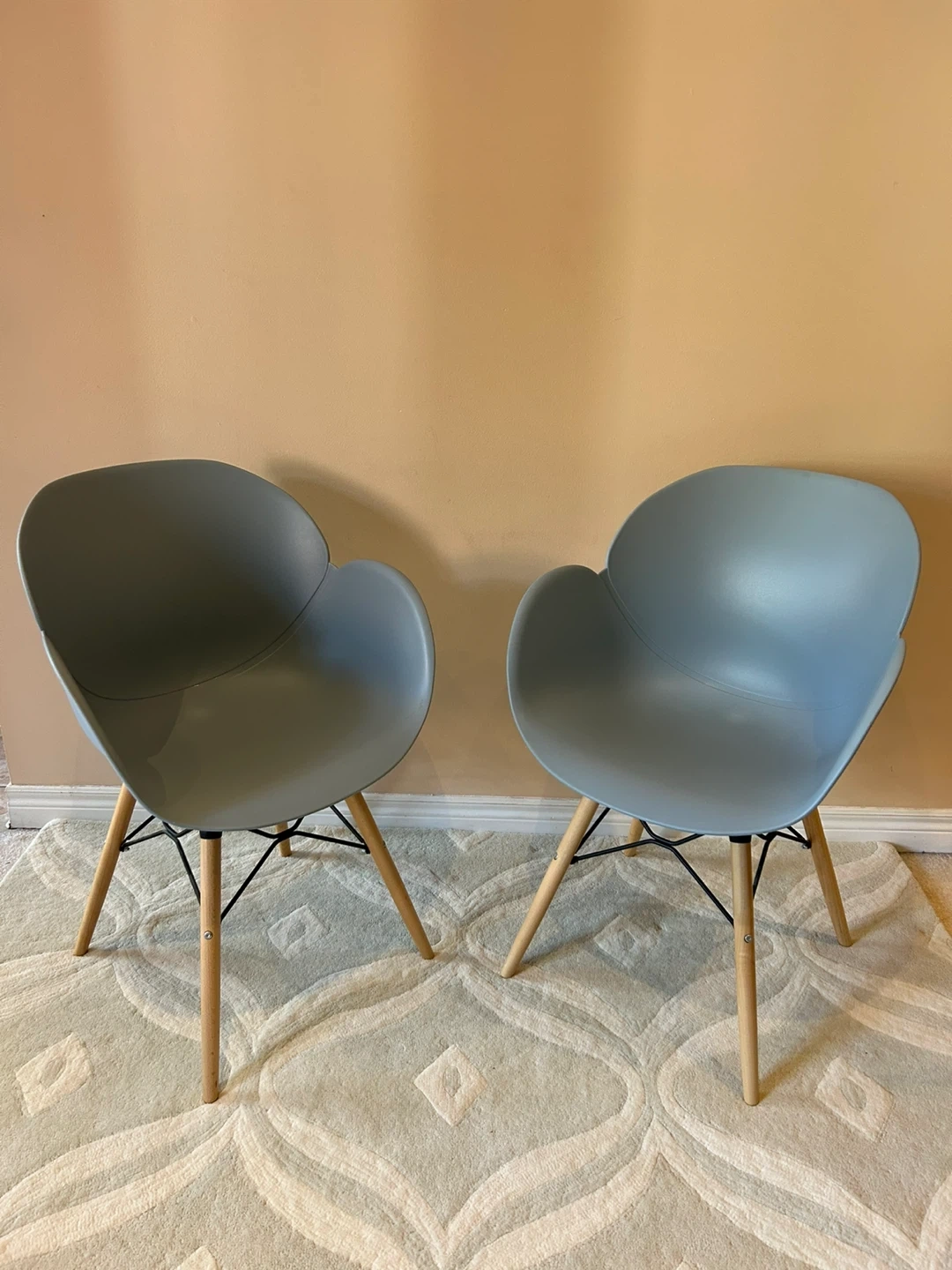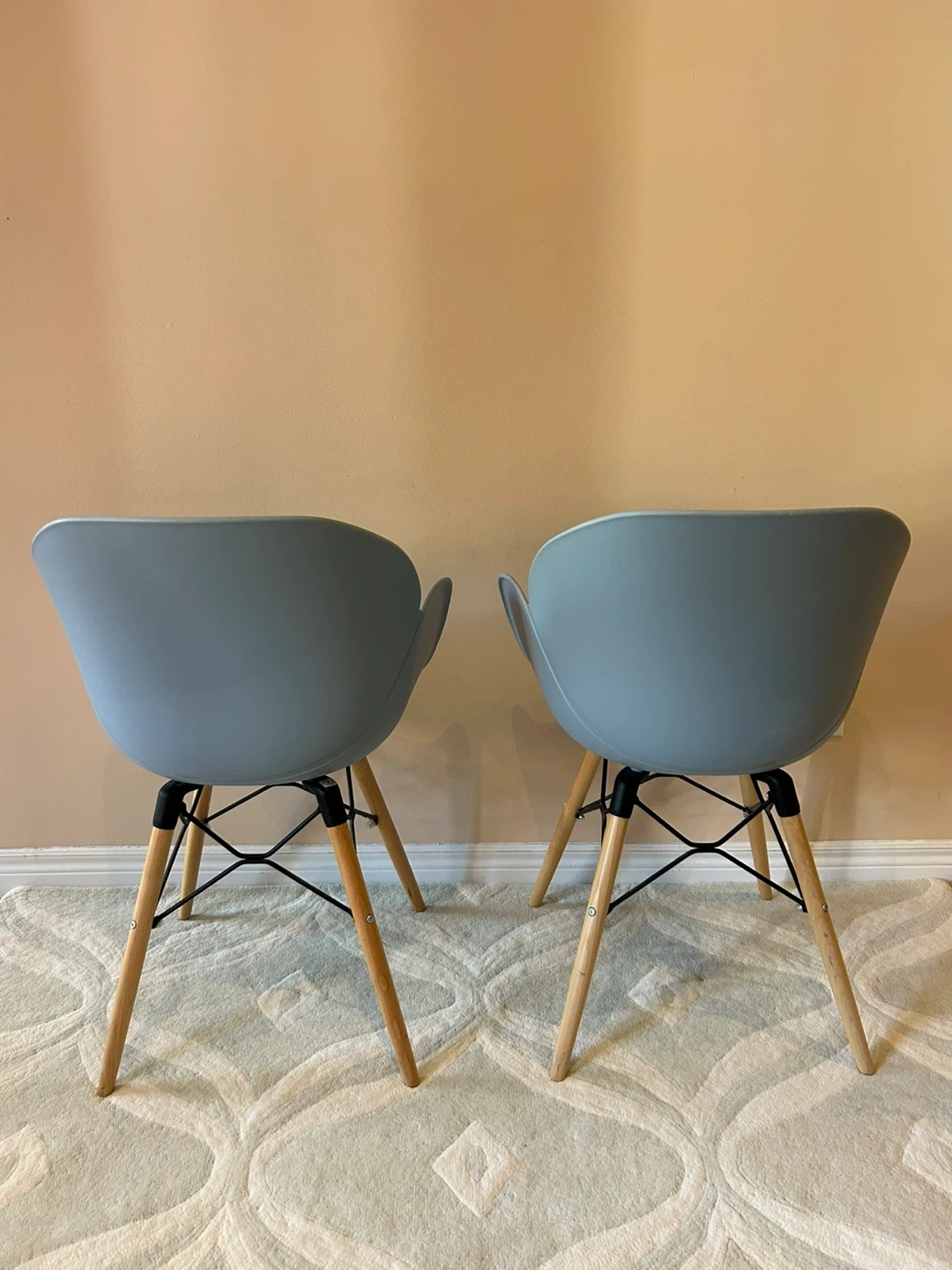 Selling a set of two modern accent chairs. They are in great condition and have a unique, stylish design with wooden legs. Perfect for adding a touch of contemporary flair to any room!
