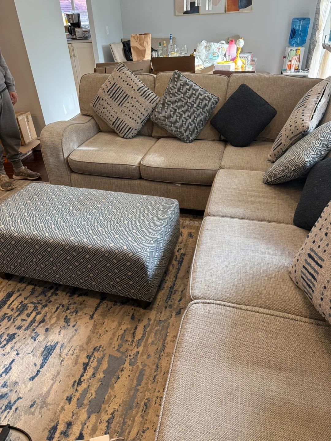 60Stylish and super comfortable L-shaped sectional sofa in a beautiful neutral gray tone, complete with a matching patterned ottoman. Perfect for cozy family nights or entertaining guests — it blends effortlessly with any décor. ✨ Details: • Condition: Gently used, very clean, and well cared for • Color: Gray fabric with patterned accent pillows and ottoman • Includes: All matching throw pillows shown in photos • Comfort: Deep, plush seating with great back support