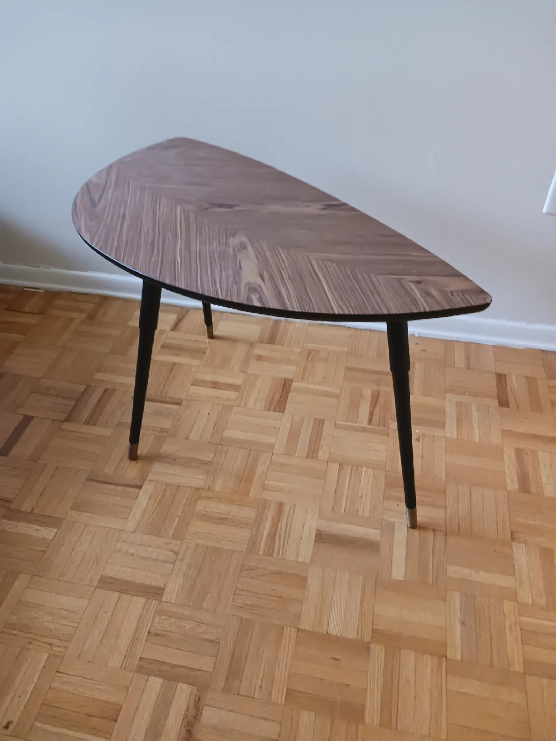 124Selling a stylish half-moon shaped accent table. It features a beautiful wood grain top and sleek black legs with brass-colored feet. It's in great condition and would be a lovely addition to any living space!