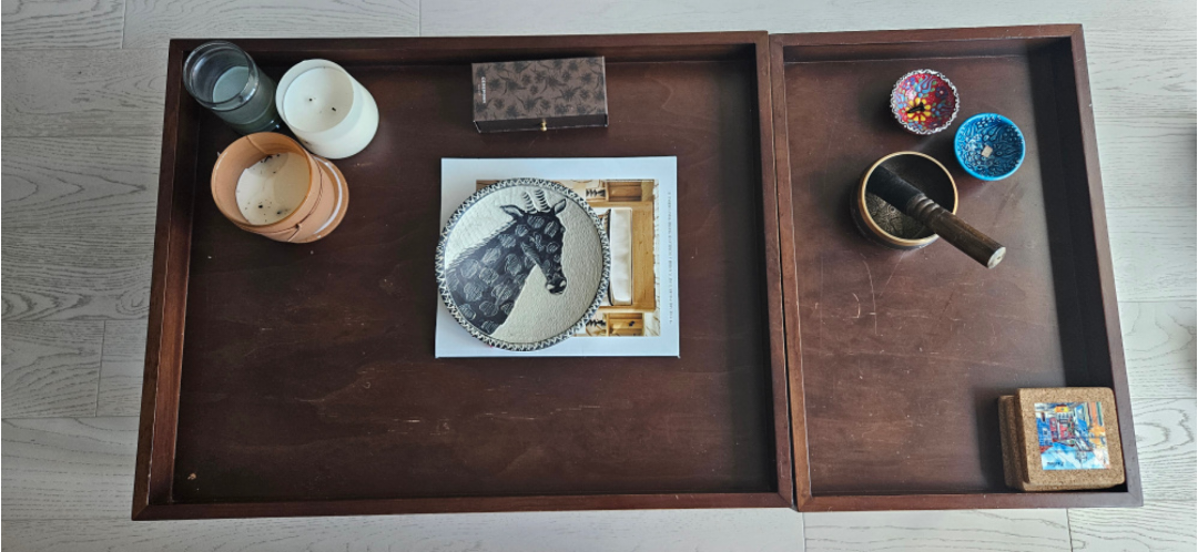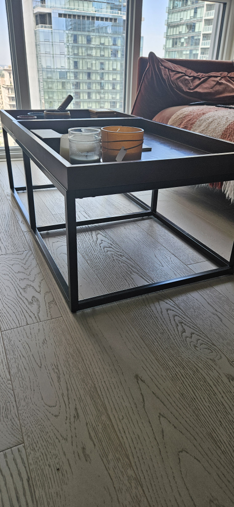 10This gorgeous coffee table is the perfect marriage of industrial chic and stylish practicality. The unique and appealing top with its split tray design helps keep objects secure, while the warm walnut finish complements the dark patina of the metal base. 42.1"W x 21.7"D x 15.2"H Durable MDF wood with walnut-finished pine veneer atop a sturdy metal base The coffee table has a dual-tray top supported by a strong metal base. Industrial without being utilitarian, this contemporary piece will complement any interior design.