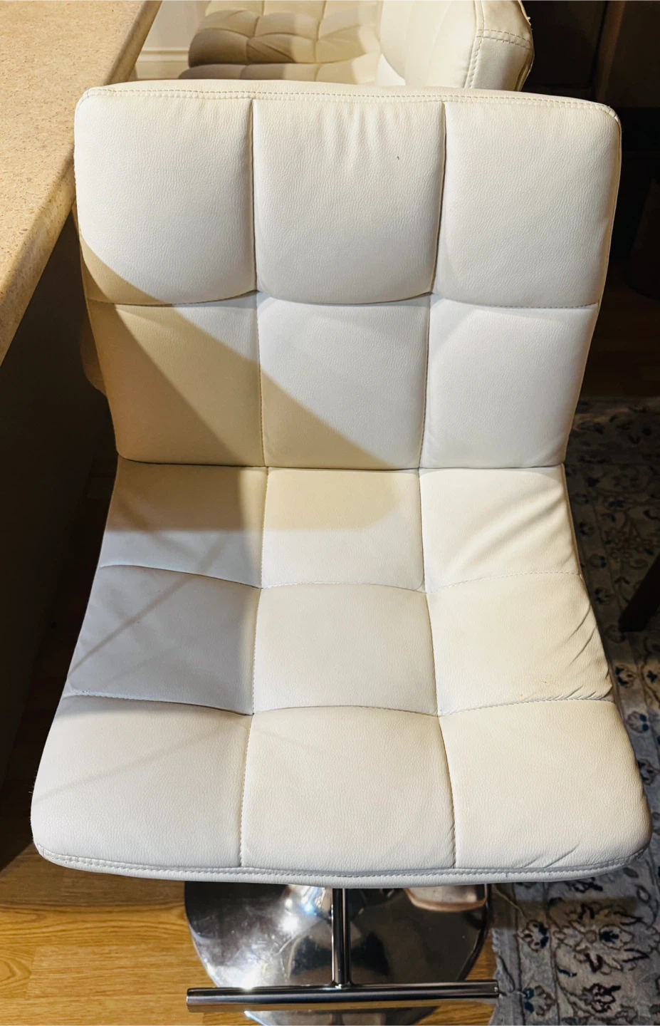 10Comfortable and stylish stools, perfect for your kitchen island or breakfast bar. Ideal height for island dining Soft white faux leather cushions Swivel seats & adjustable height Sturdy chrome base Very clean and well-maintained
