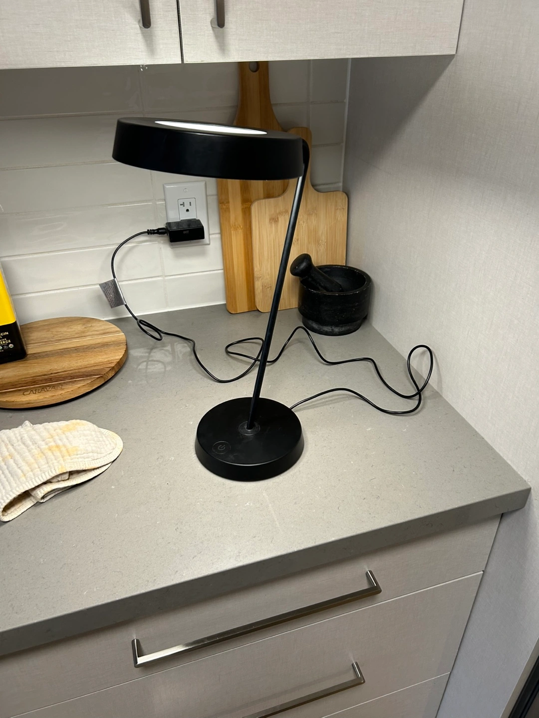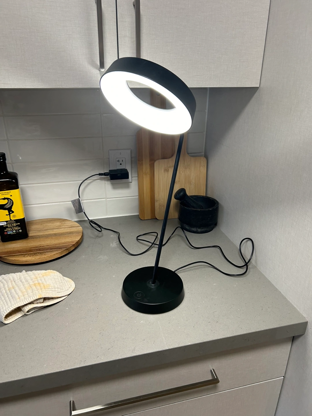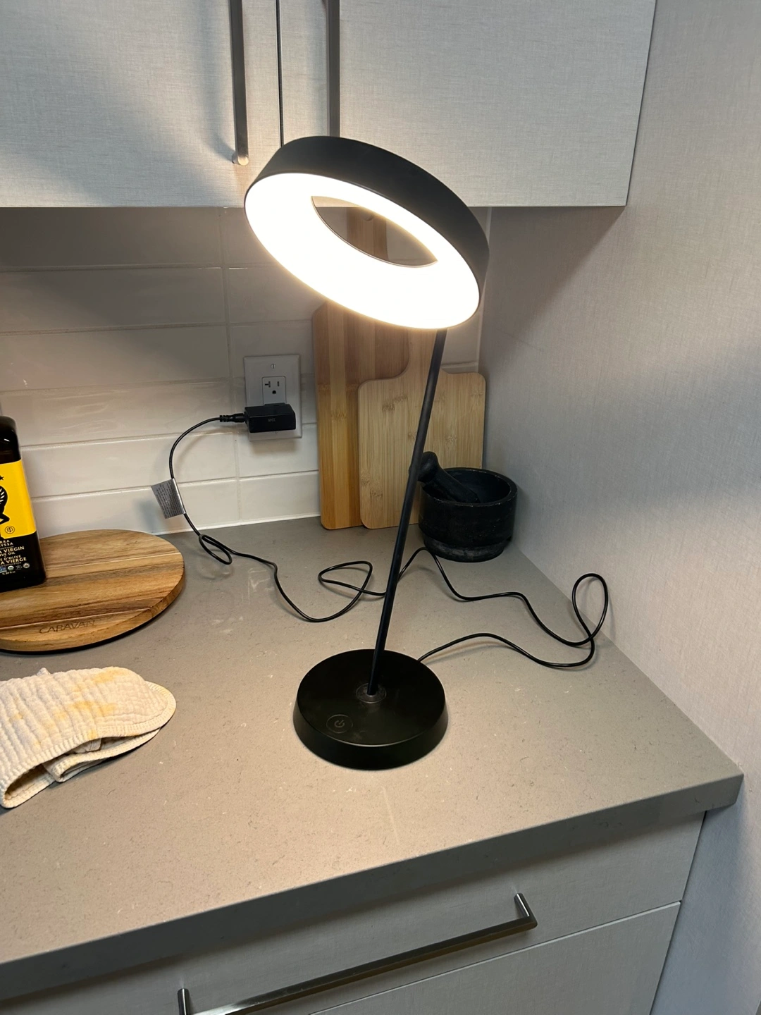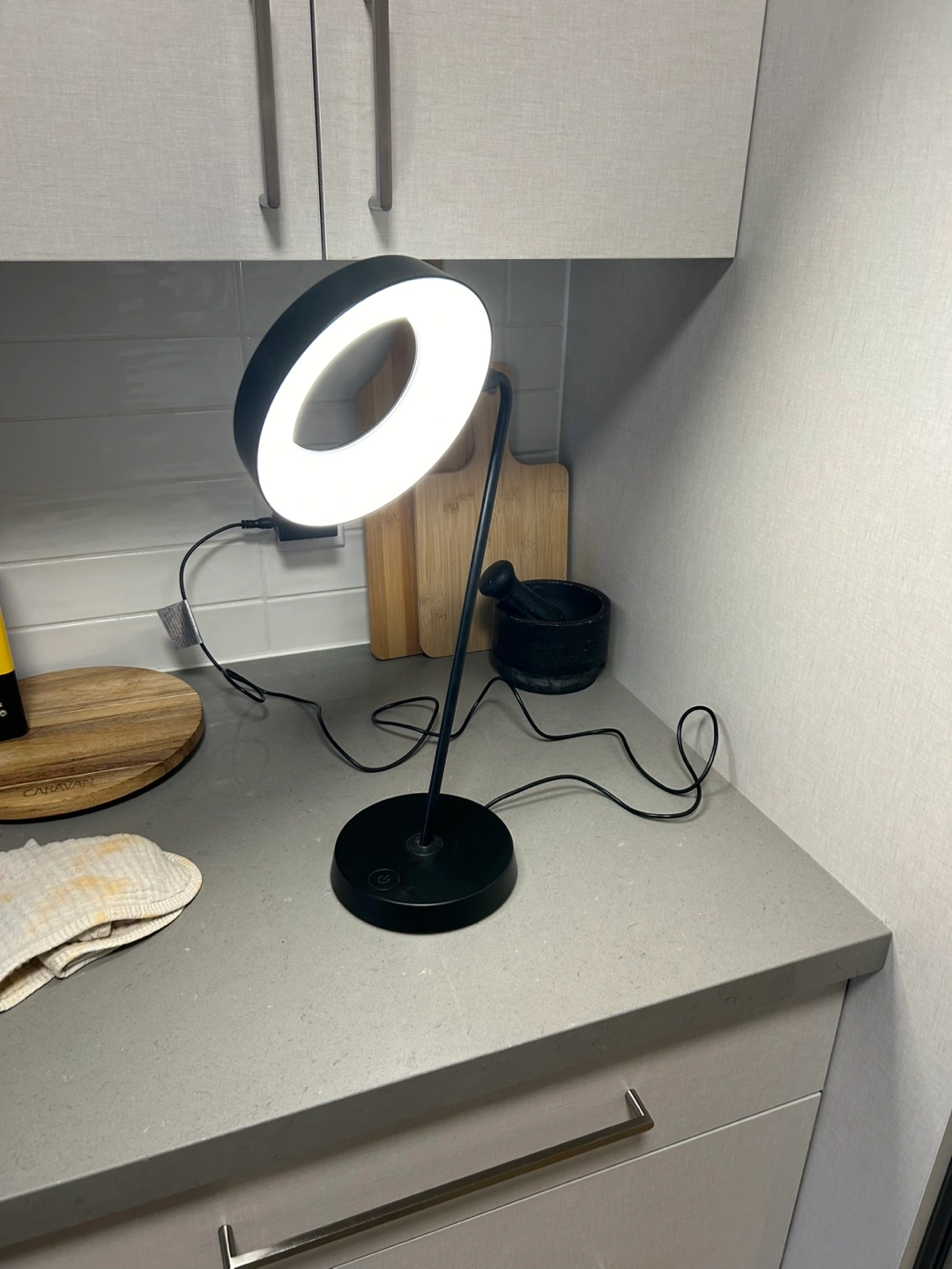 46Sleek black desk lamp. Features a circular LED light. Adjustable gooseneck. Touch controls.