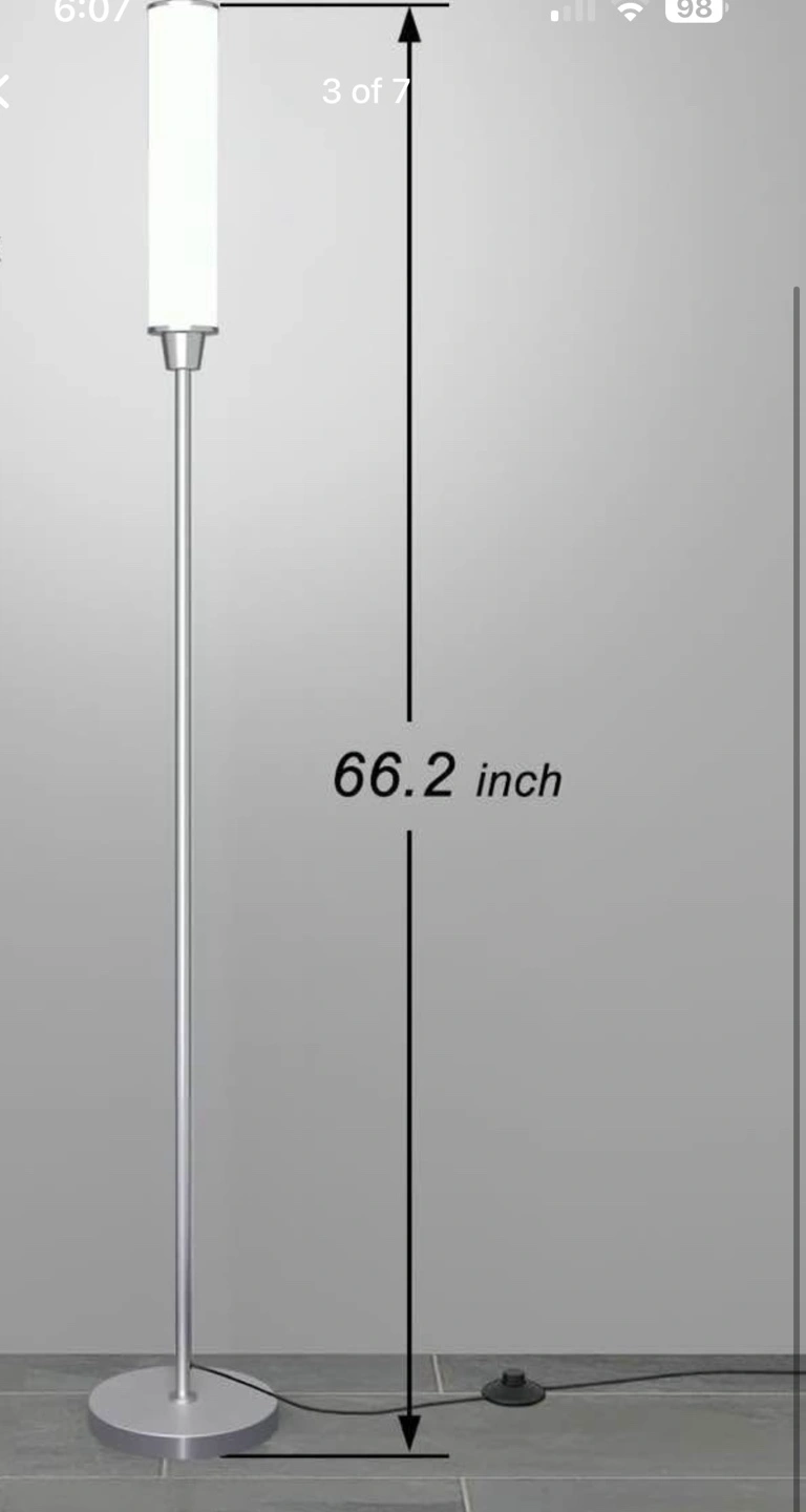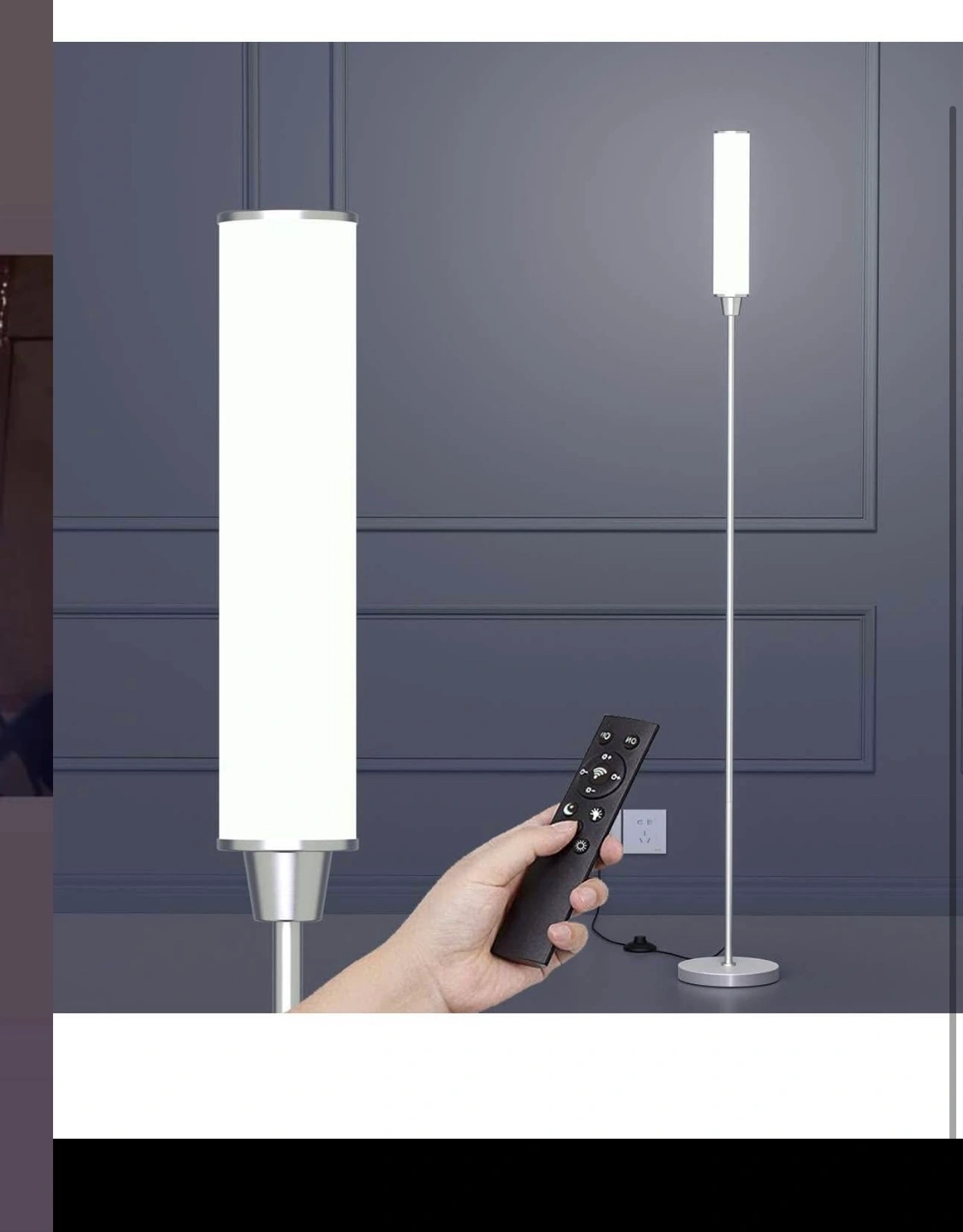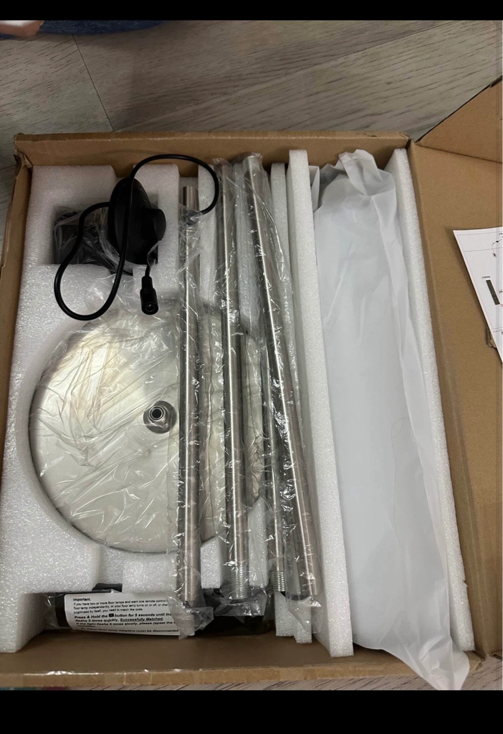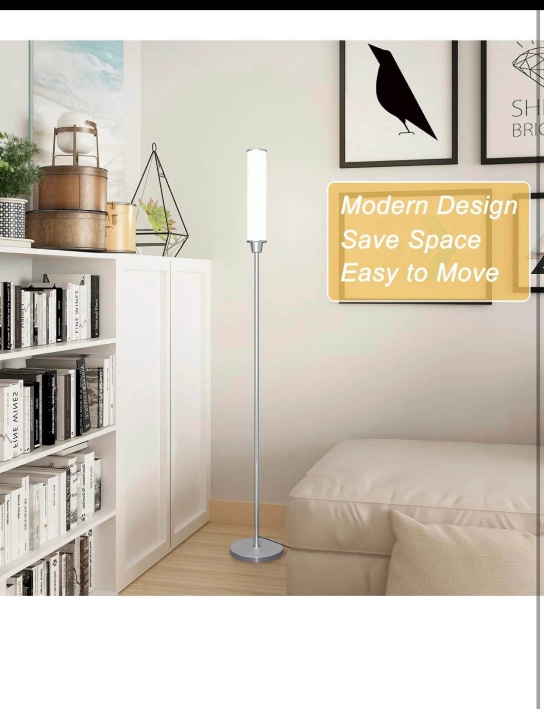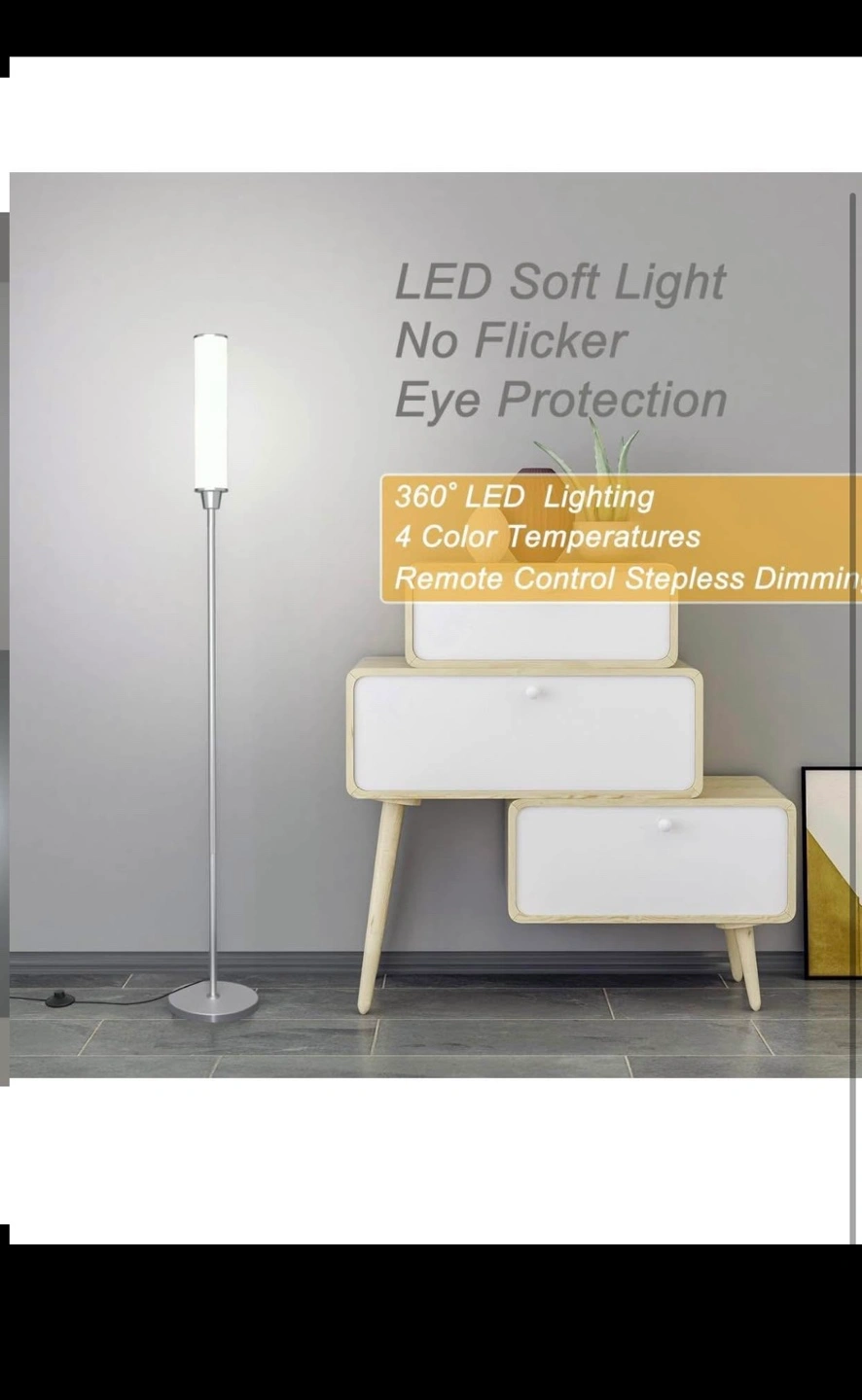 23Silver floor lamp with a white glass shade. Includes remote control with dimming and colour temperature settings.
