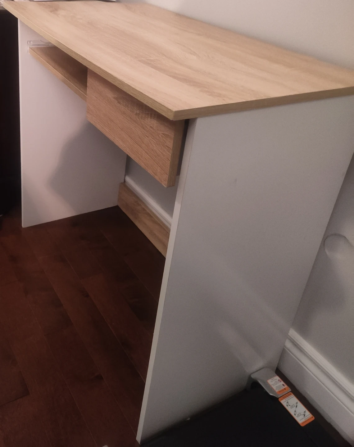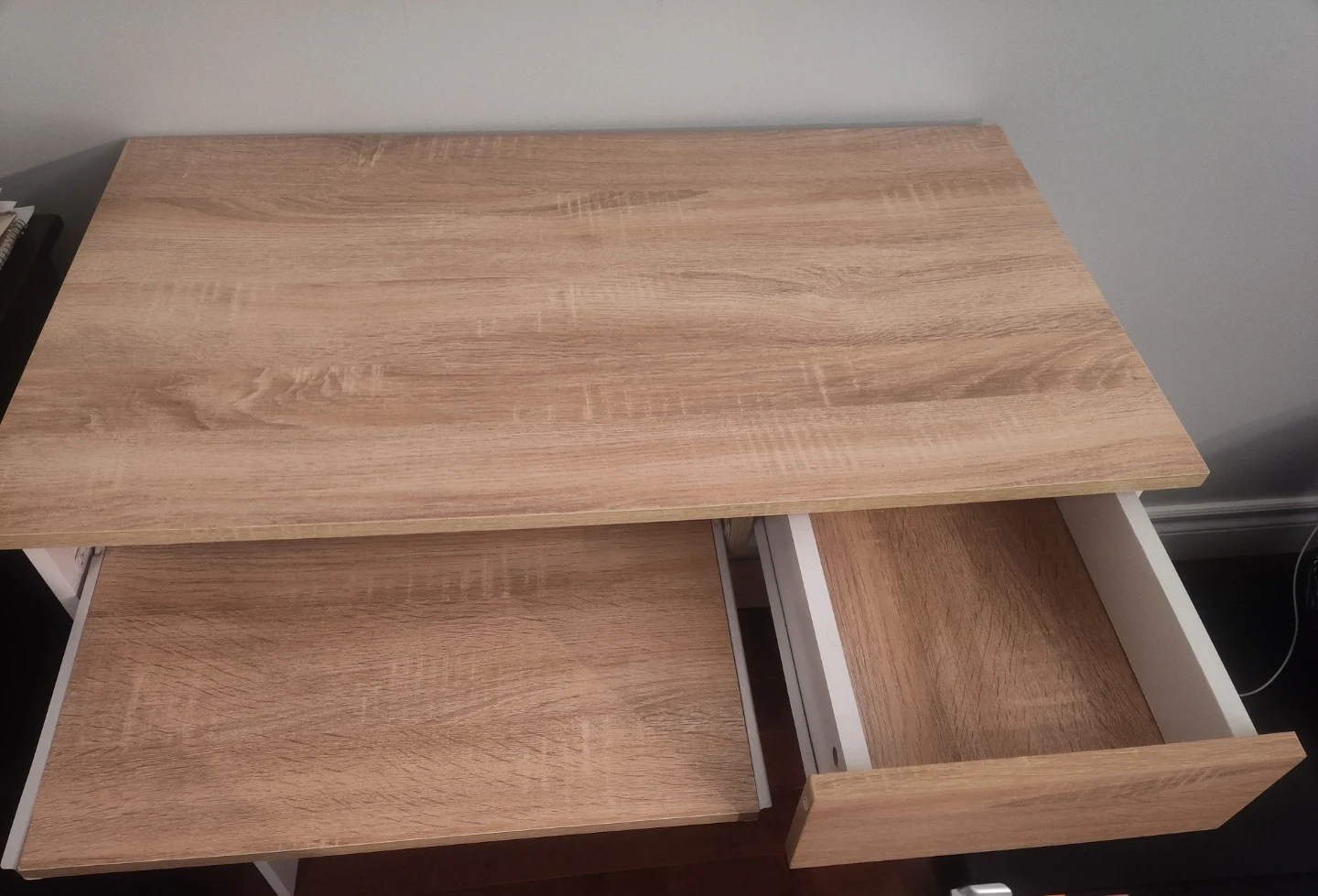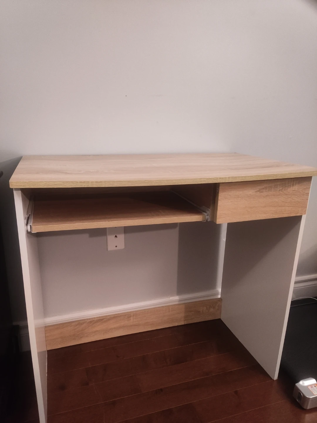 10Modern light wood desk with white panels.Includes pull-out tray and storage drawer. Clean, sturdy, and space-saving. Dimensions: 31.5" Length × 18" Width × 29.5" Height Ideal for home offices, student study areas, or minimalist setups. Ready to use and easy to move!