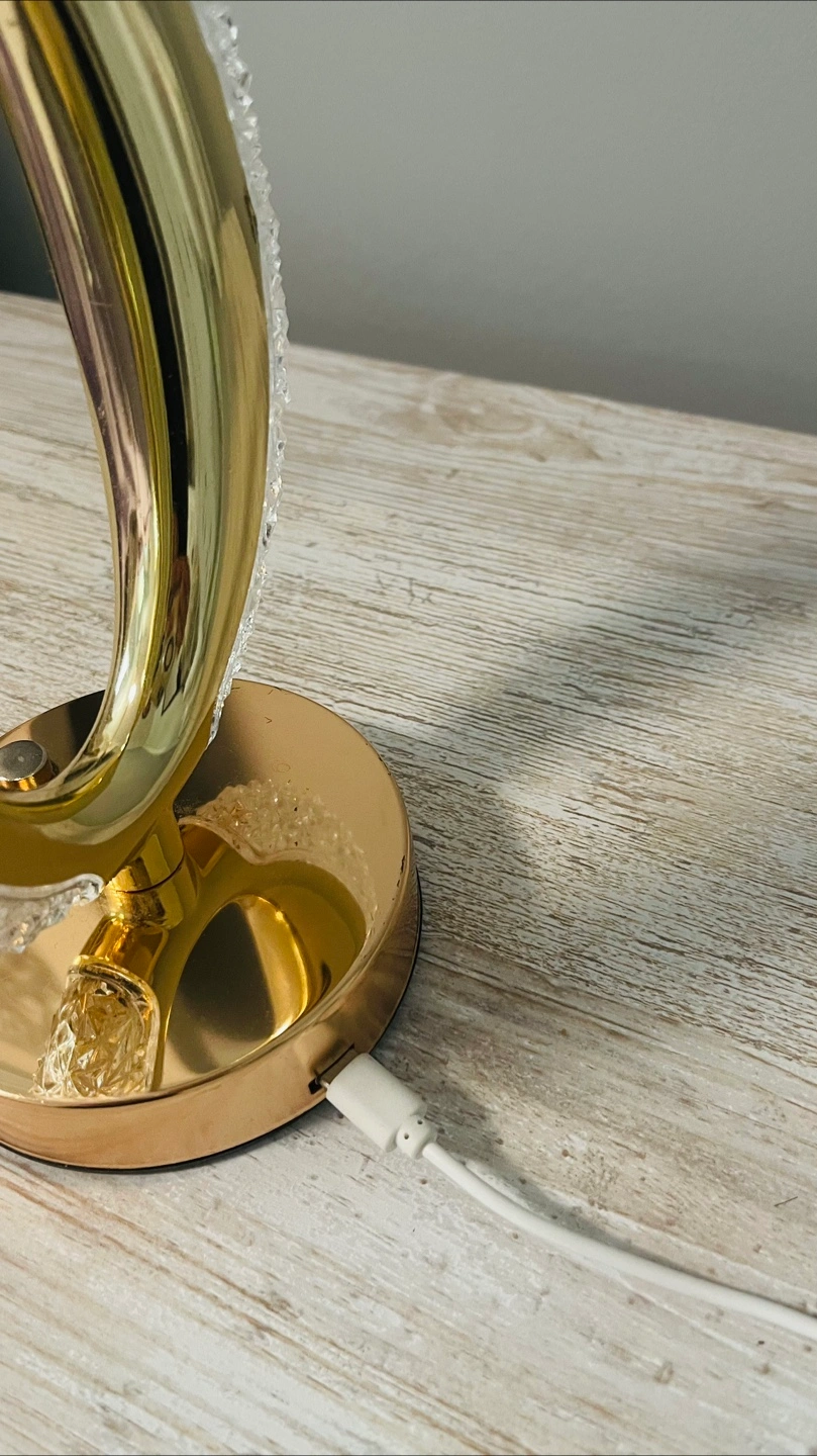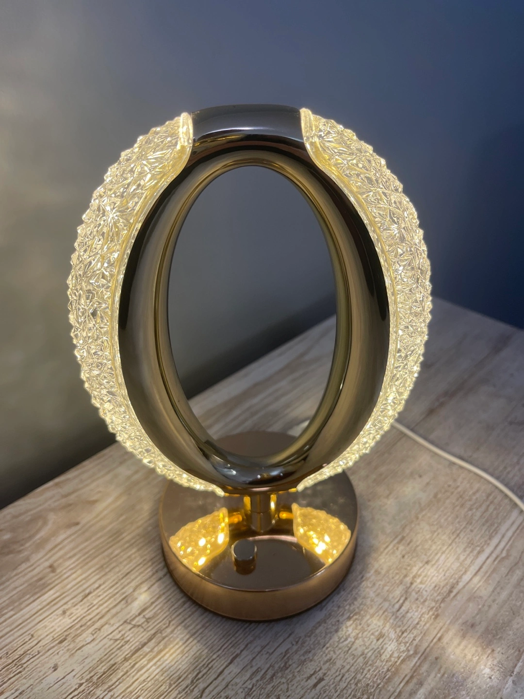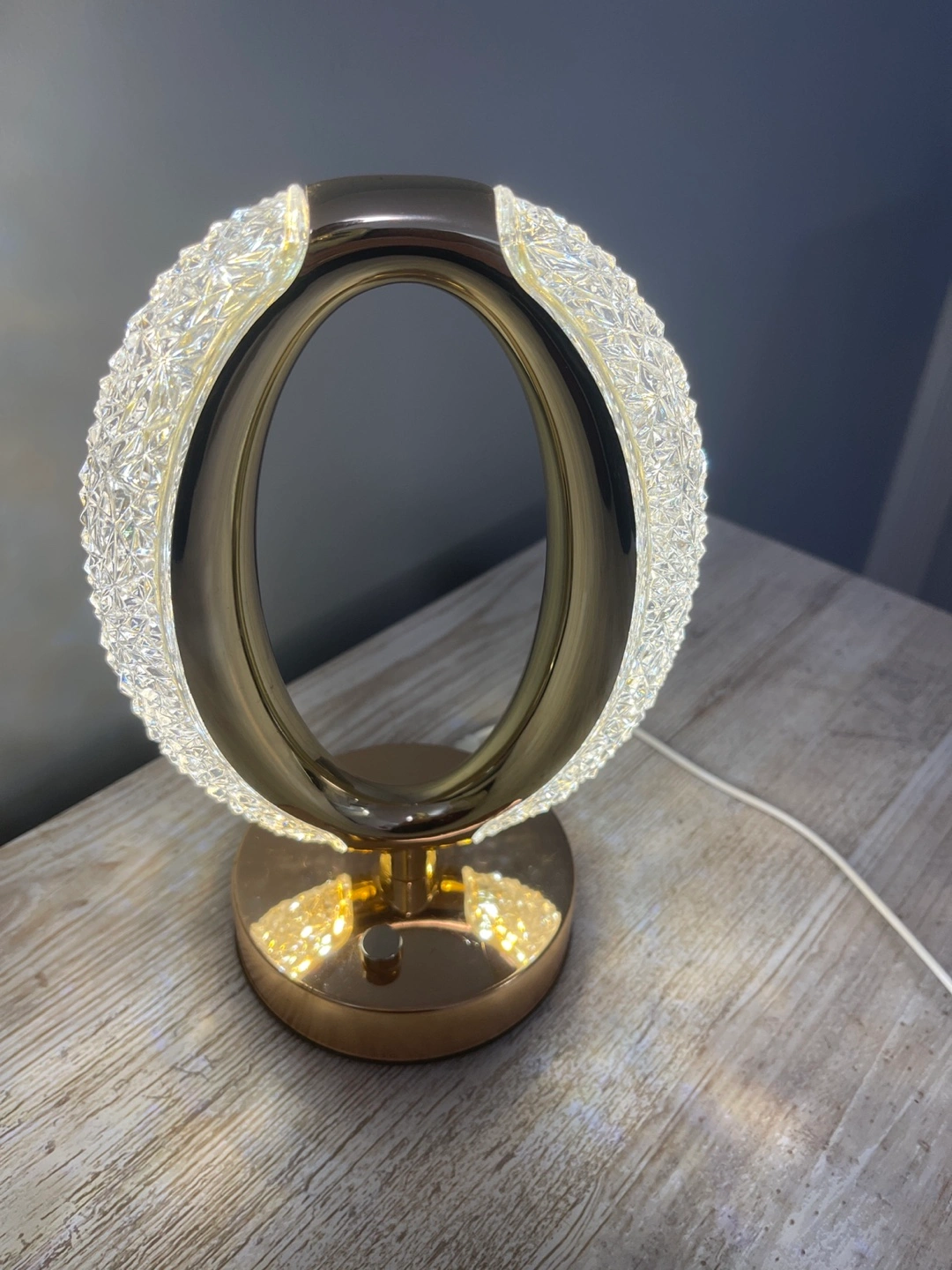 58A beautiful table lamp. Features a unique oval design. It has a gold-toned base, and a white power cable. The glass detail around the oval brings in some lovely light, so it’s a great addition to any room.