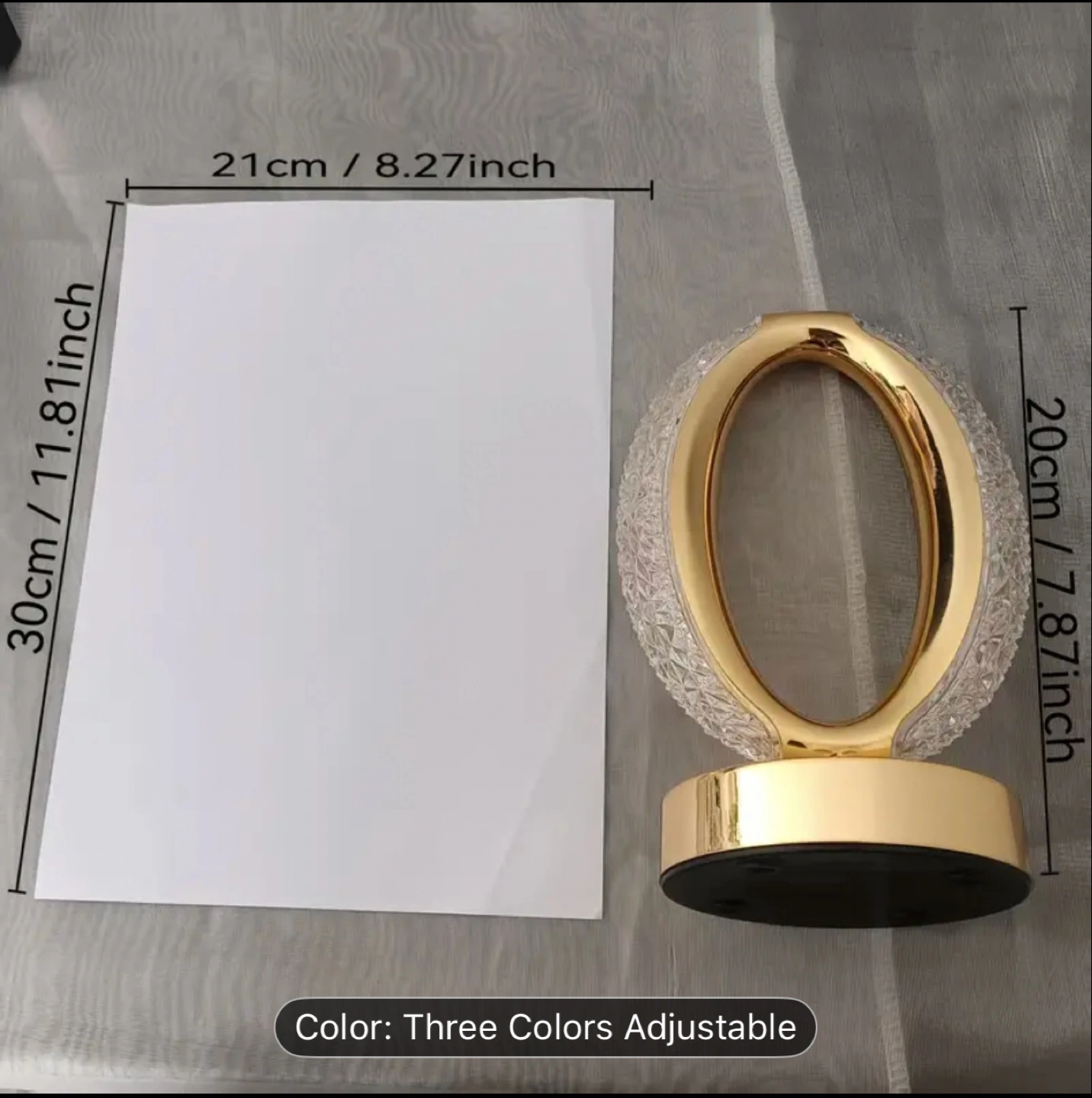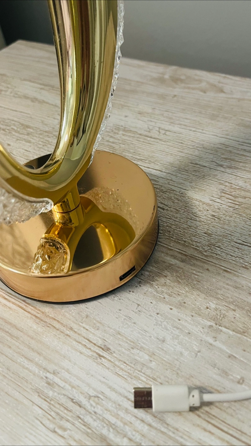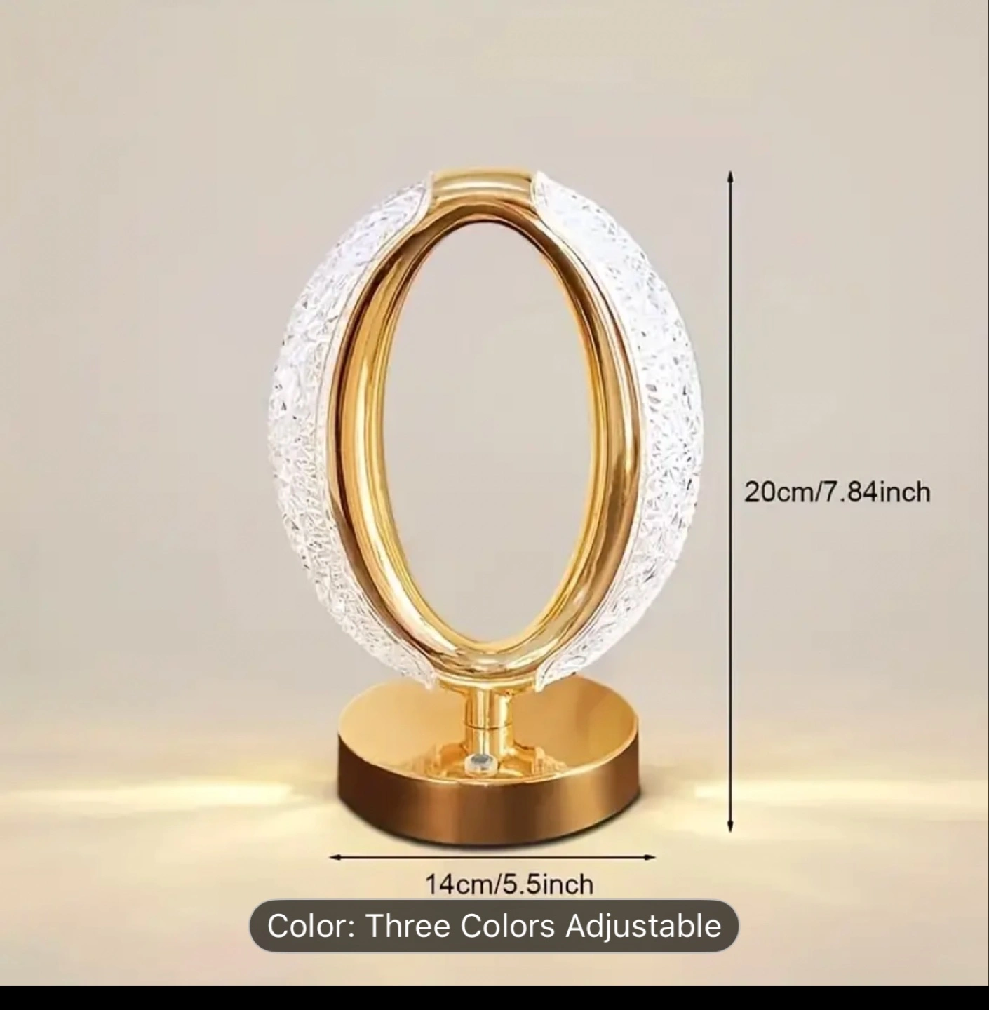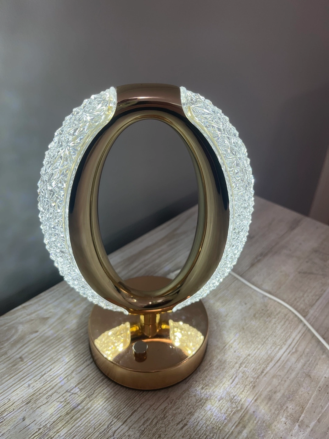 58A beautiful table lamp. Features a unique oval design. It has a gold-toned base, and a white power cable. The glass detail around the oval brings in some lovely light, so it’s a great addition to any room.