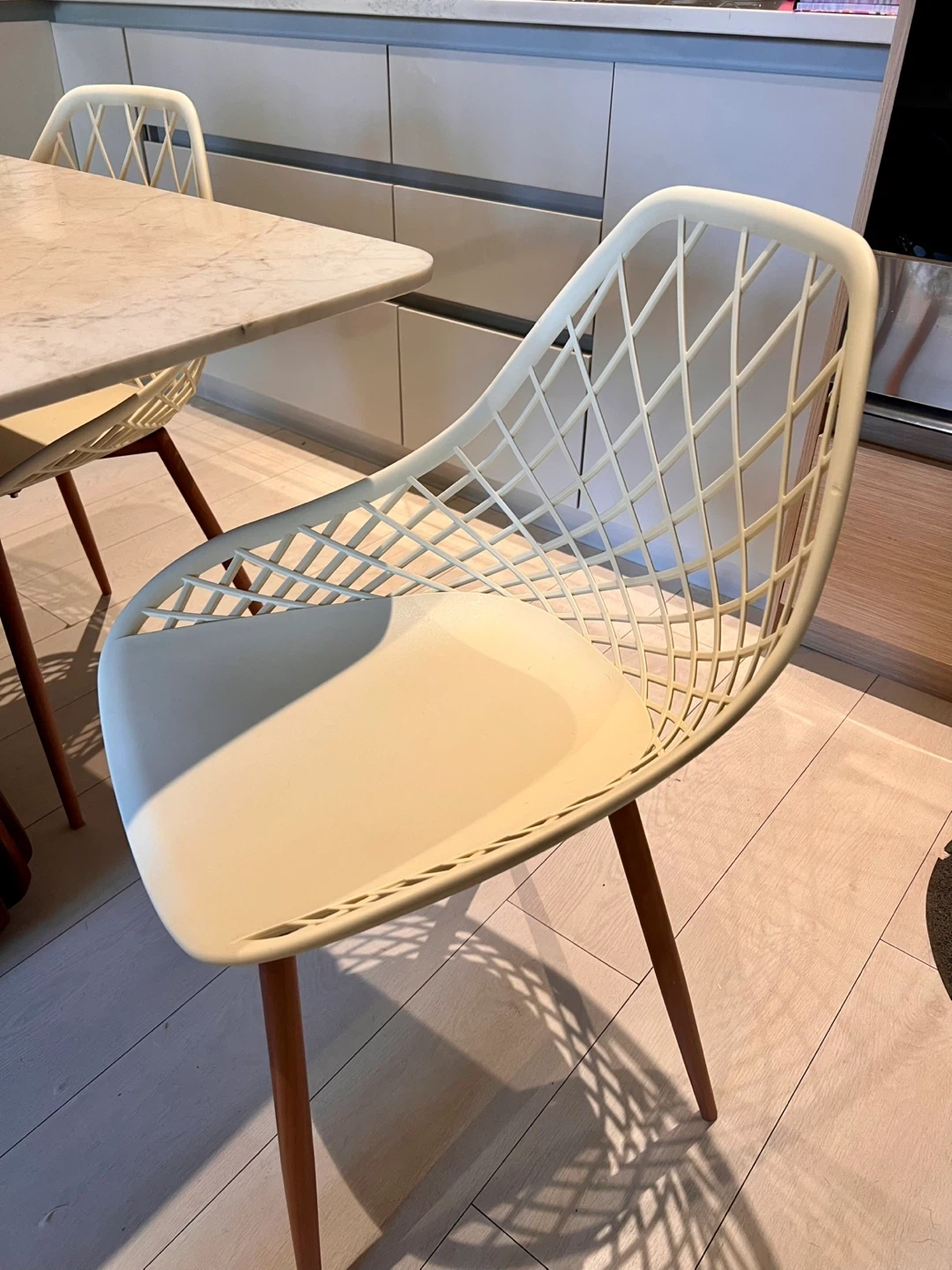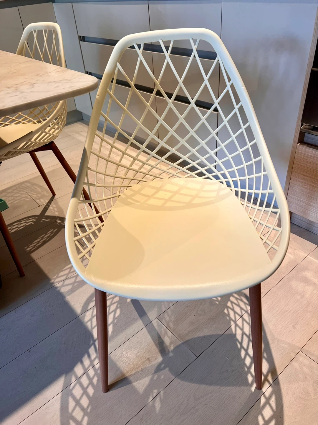 752 Stylish and comfortable dining chairs with a contemporary lattice-style back and wooden legs. Perfect for small kitchen or dining spaces — sturdy, lightweight, and very easy to clean. ✅ Excellent condition ✅ Modern minimalist design ✅ $40 each or $75 for both Pickup only.