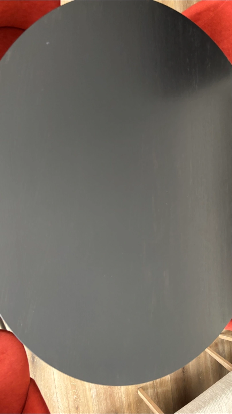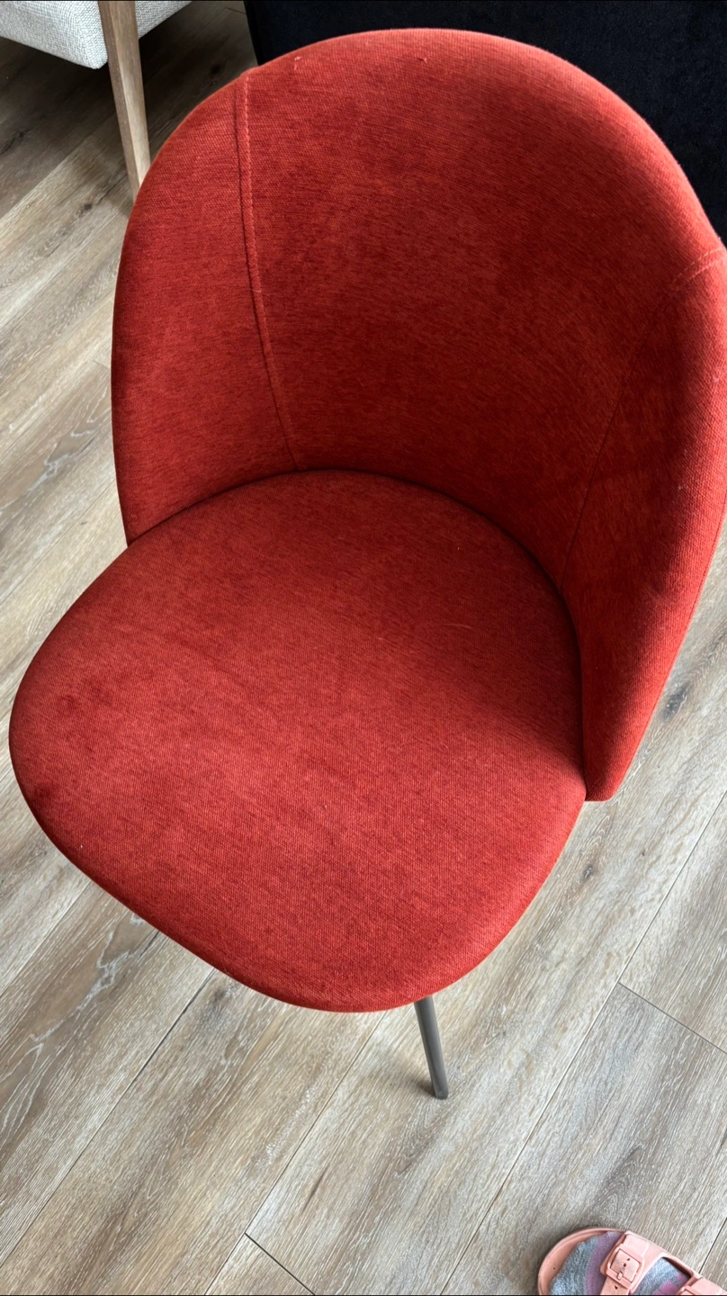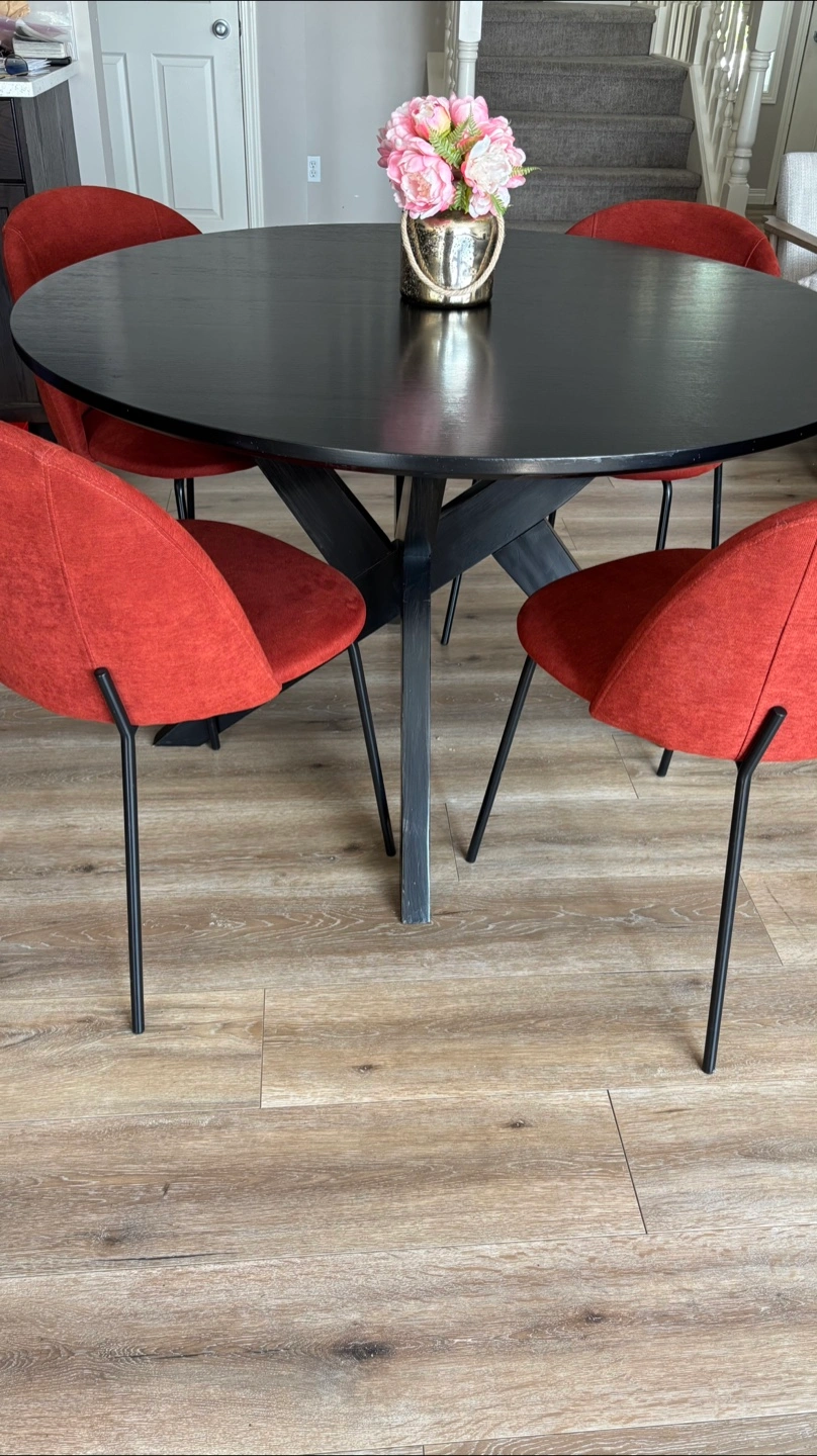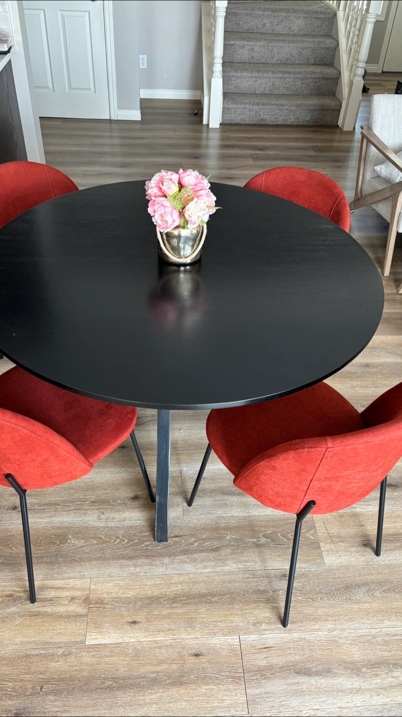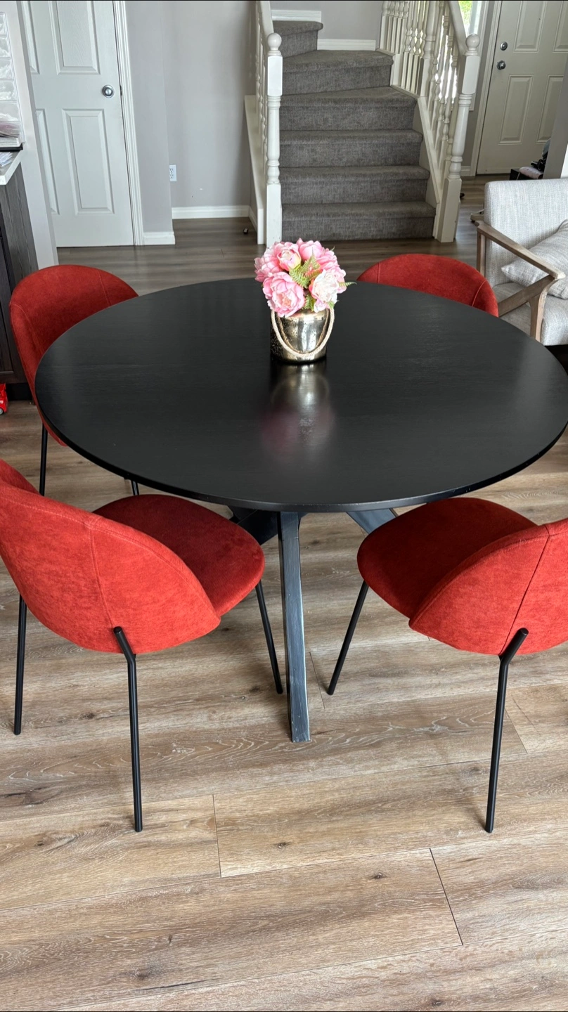 20Offering a sleek, modern dining set. The table is round and black, and it sits on a sturdy base. It comes with four chairs in a bold reddish-orange. You can enjoy a calm evening meal with your loved ones at this dining set.