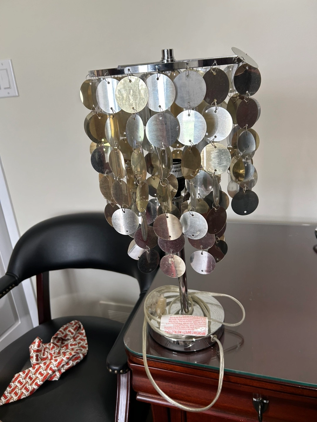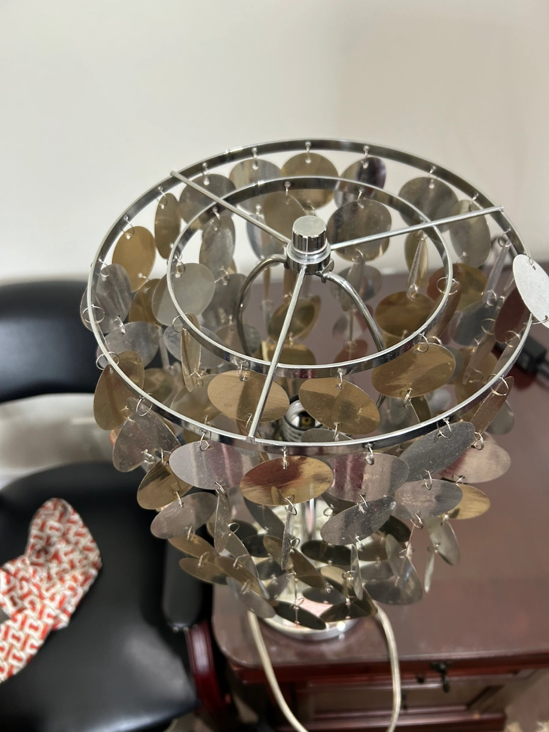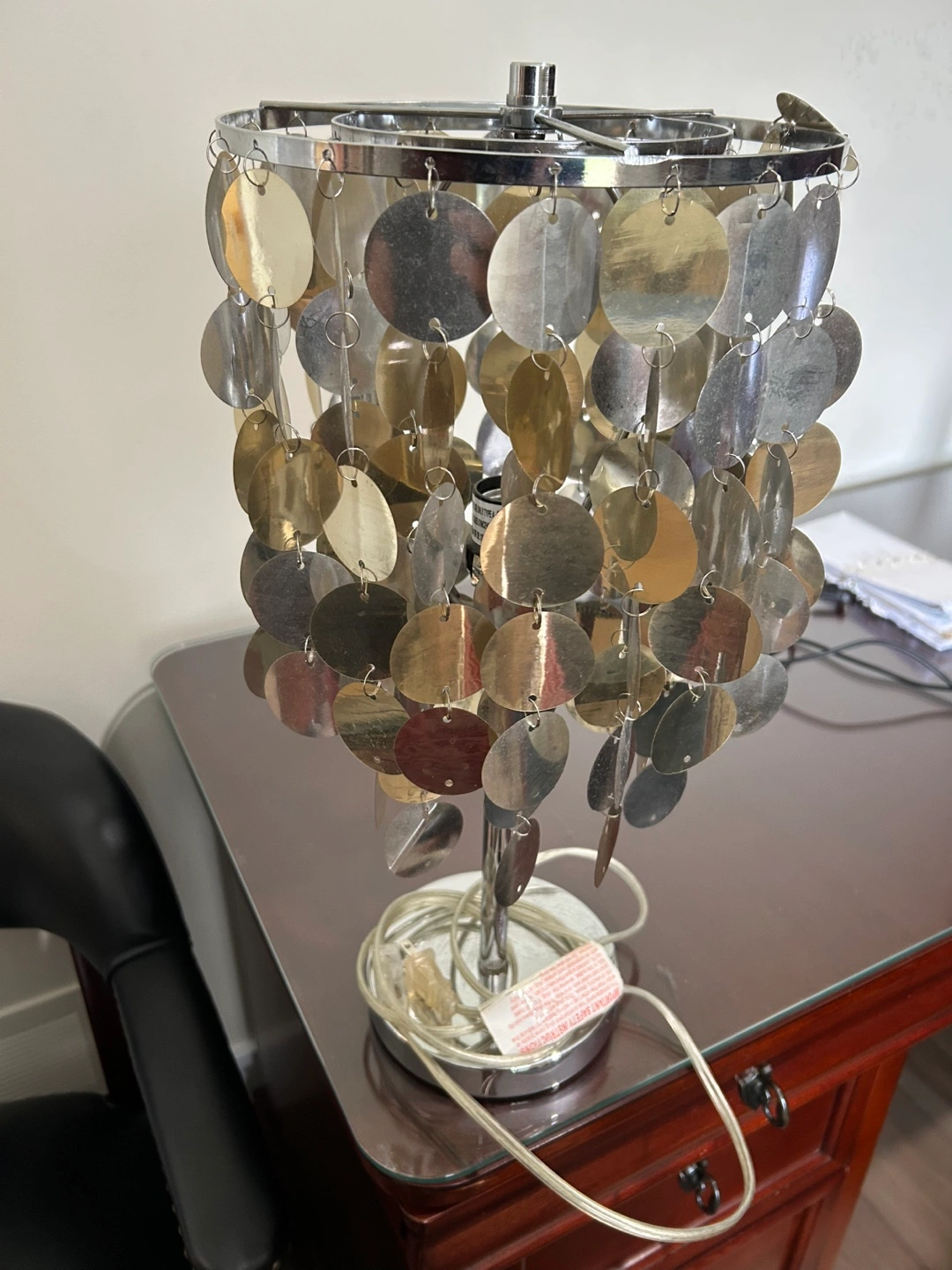 Stylish table lamp. Features a chrome metal base and a shade composed of many small, cascading metallic discs in silver and gold tones.