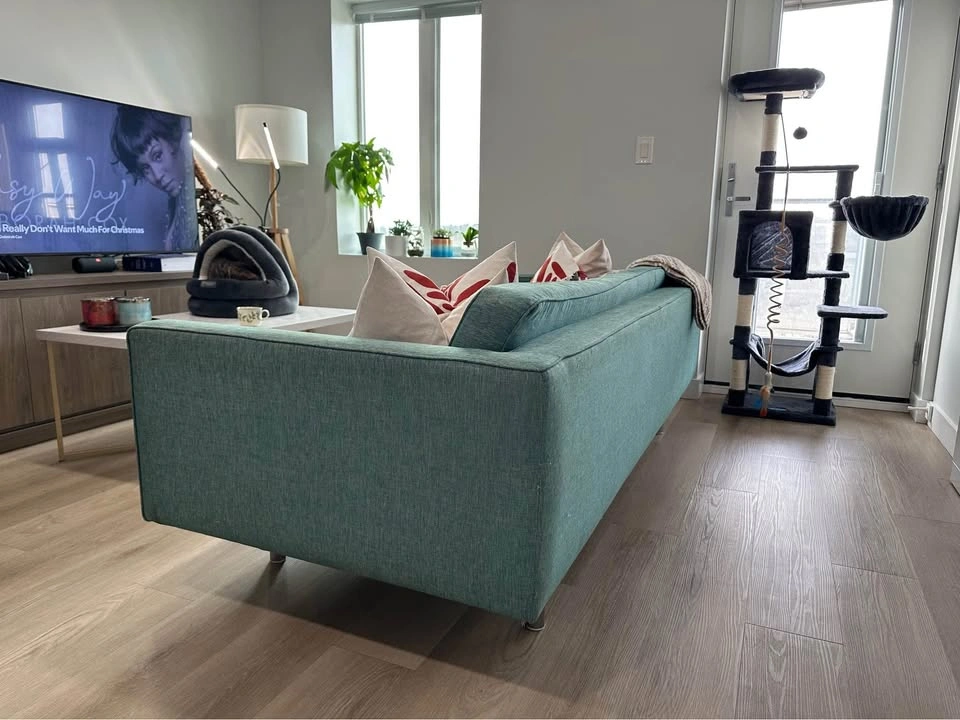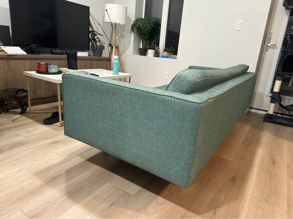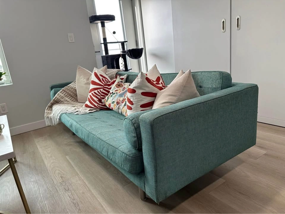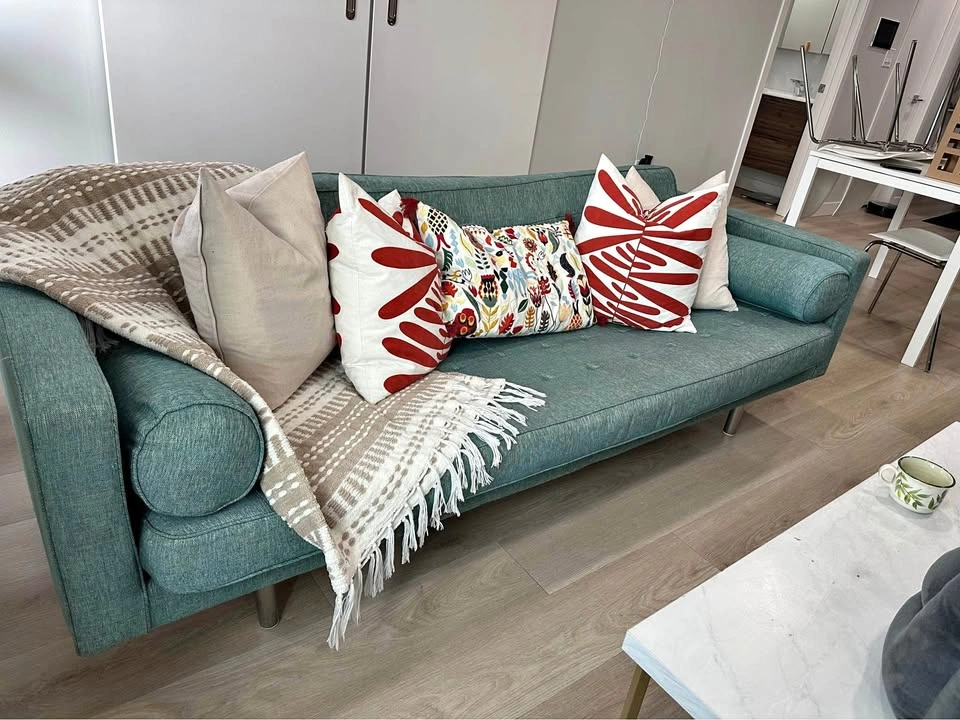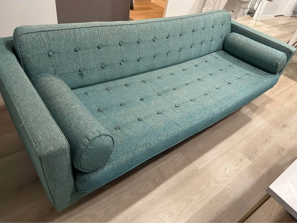 5Stylish and comfortable 2-seater sofa in a beautiful teal fabric. The upholstery is soft yet durable, and the frame is sturdy and supportive. Its clean lines and metal legs give it a modern, Scandinavian-inspired look — perfect for condos, apartments, or small living rooms. ✅ Comfortable seating for three ✅ Easy-to-clean fabric ✅ Solid structure and sleek design ✅ Ideal for modern or minimalist spaces Approx. dimensions: 85” (L) x 35” (D) x 29.5” (H) Throw pillows and blanket not included.