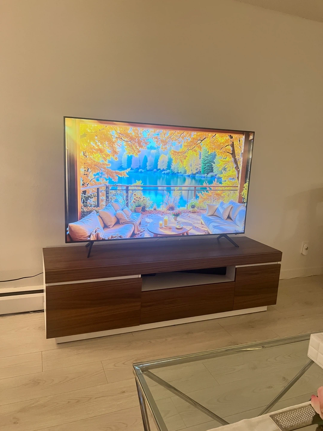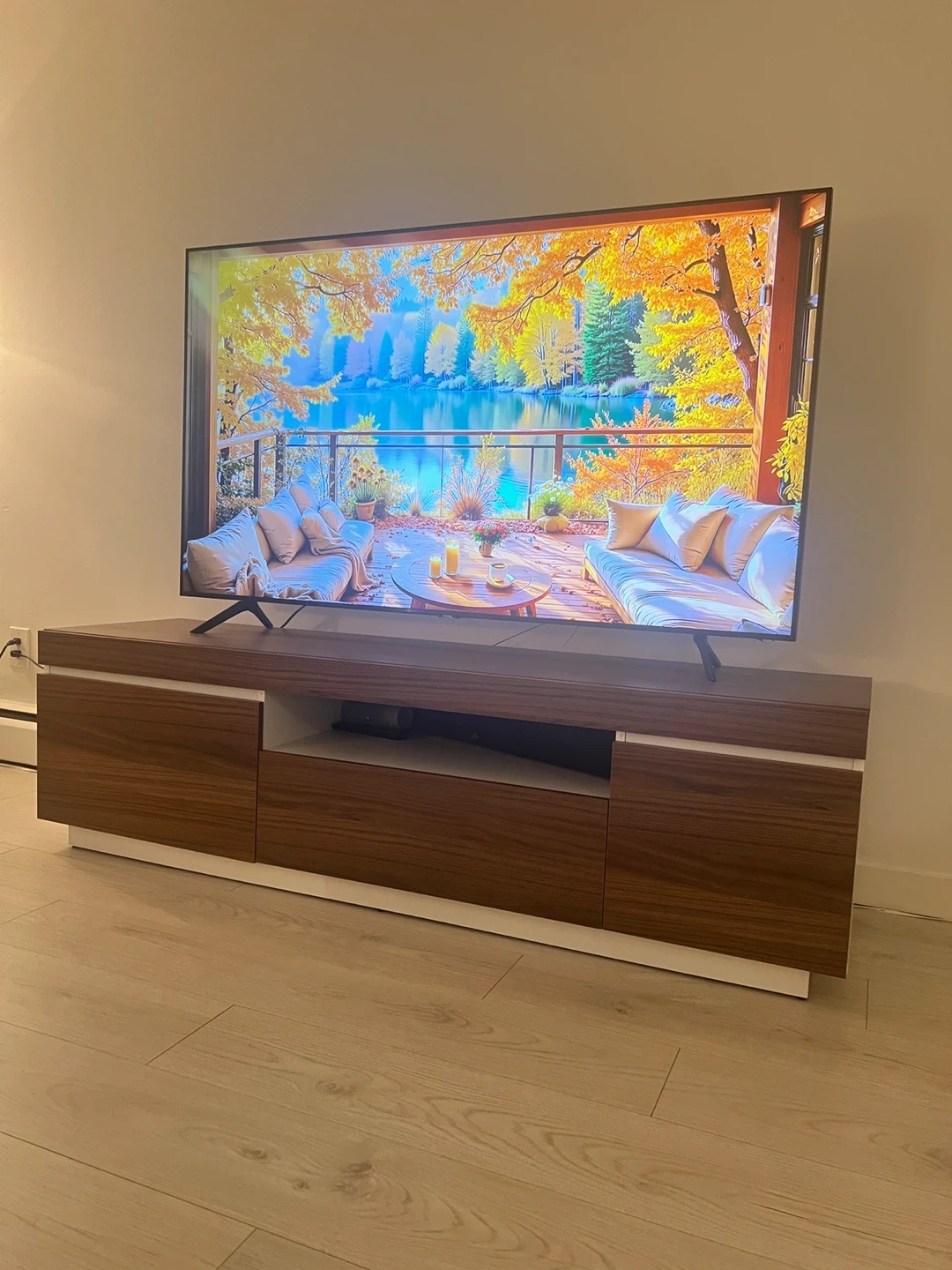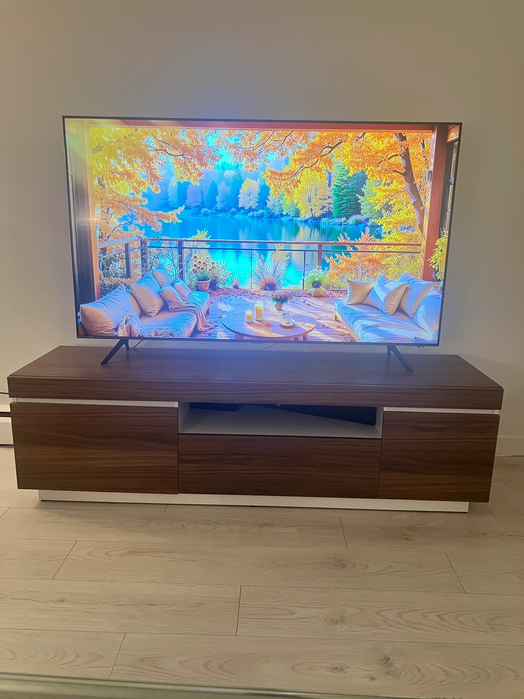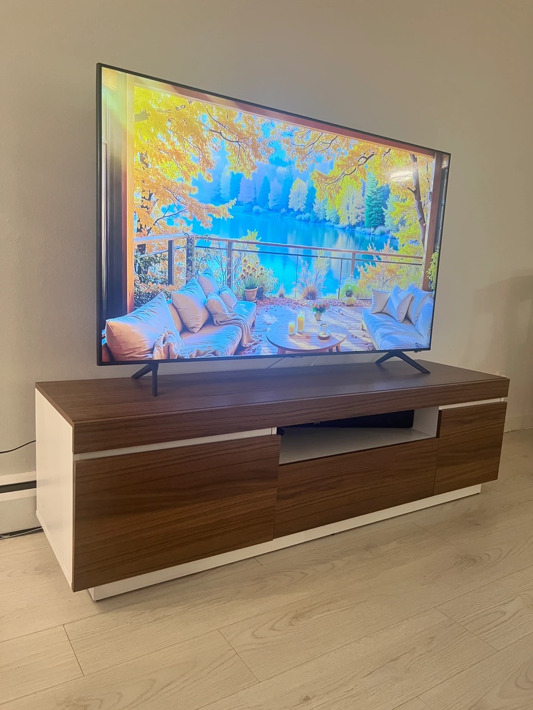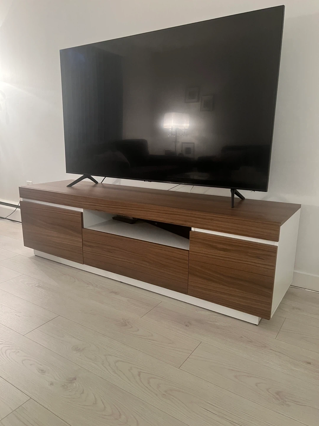 15Selling a modern and stylish TV stand in excellent condition. Very lightly used and looks like new — super clean, no damage, and well-maintained. Dimensions: • Length: 68” • Depth: 18.5” . Height: 19.5” Features: • Modern wood finish with white accent base • Fits TVs up to approx. 75” • Plenty of storage space (cabinets + shelf) • Strong and sturdy high-quality build Perfect for condos, apartments, and any living room setup.