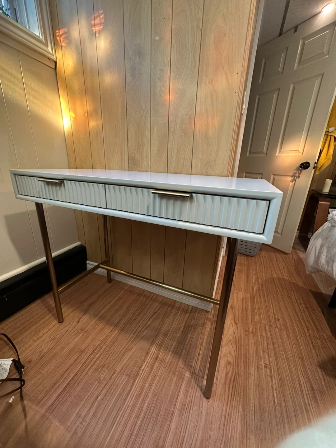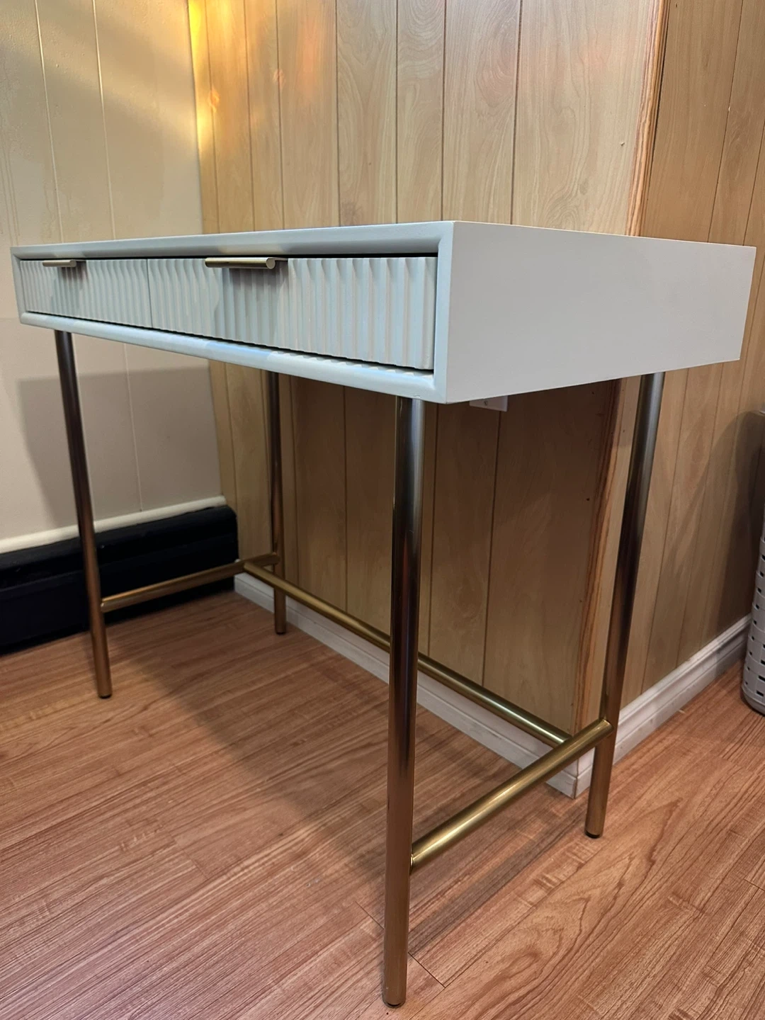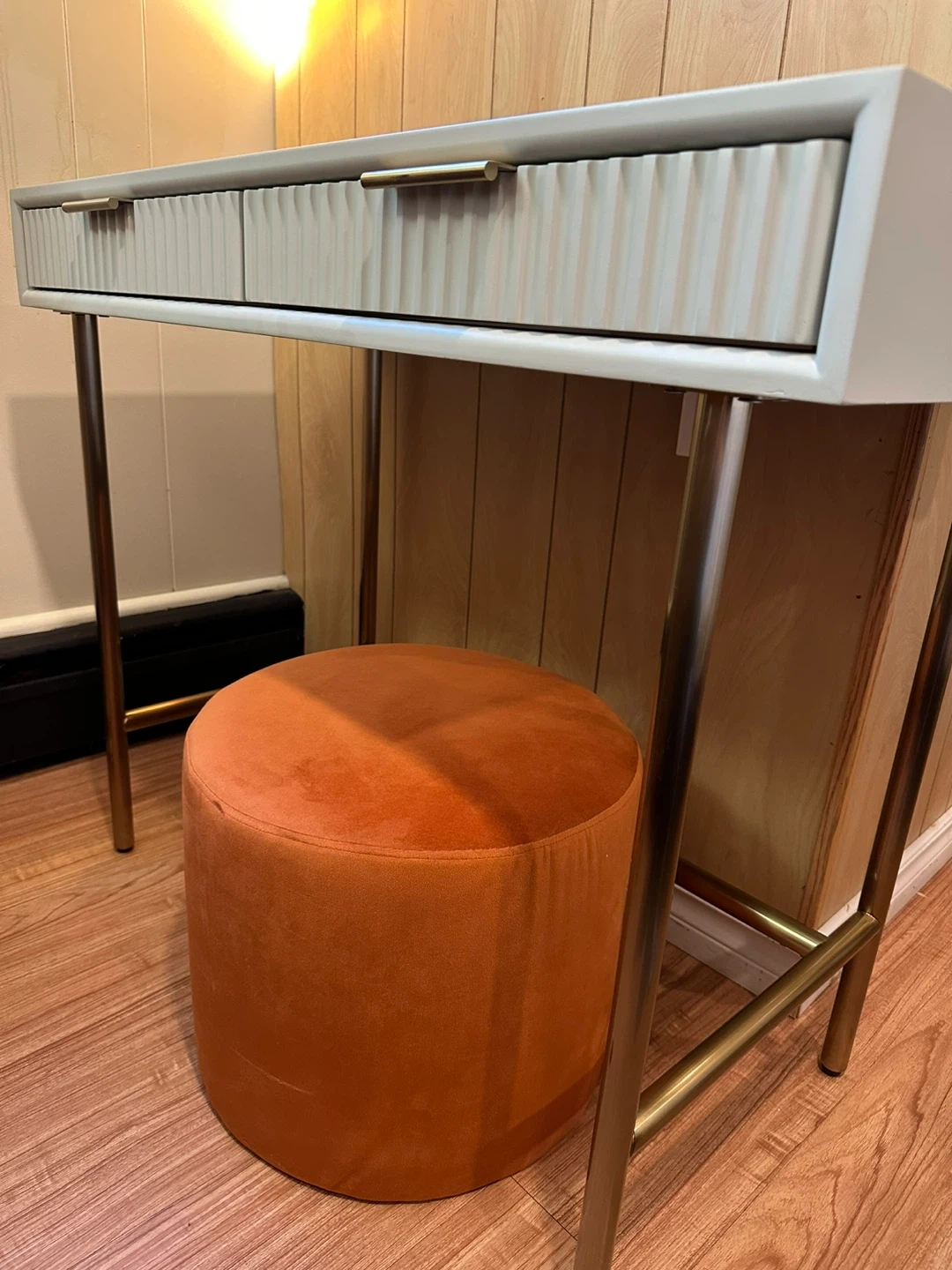 Selling a vanity table in excellent condition, perfect for makeup or as a stylish accent piece. ✔️ Comes with a comfy upholstered stool in terracotta color. ✔️ Modern design with gold metal legs and a textured drawer front. ✔️ Ideal for bedroom, beauty room, or personal space. 📏 Dimensions: 95 cm wide x 70 cm high. 💲 Price: $150 📍 Pickup in Scarborough .