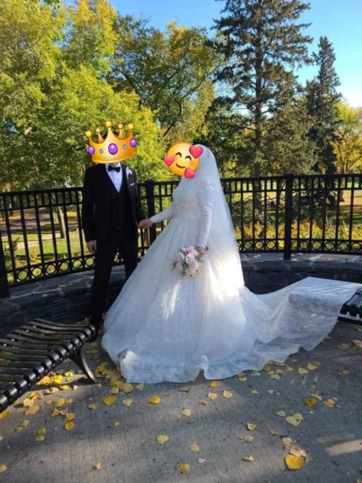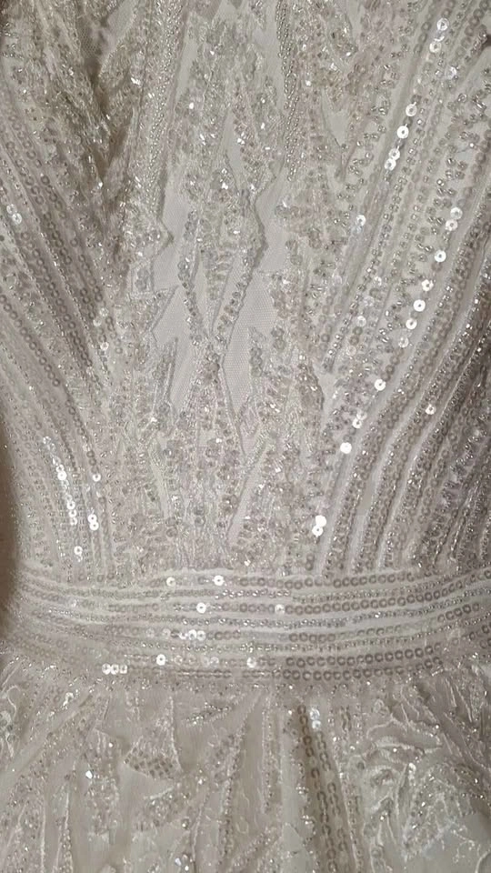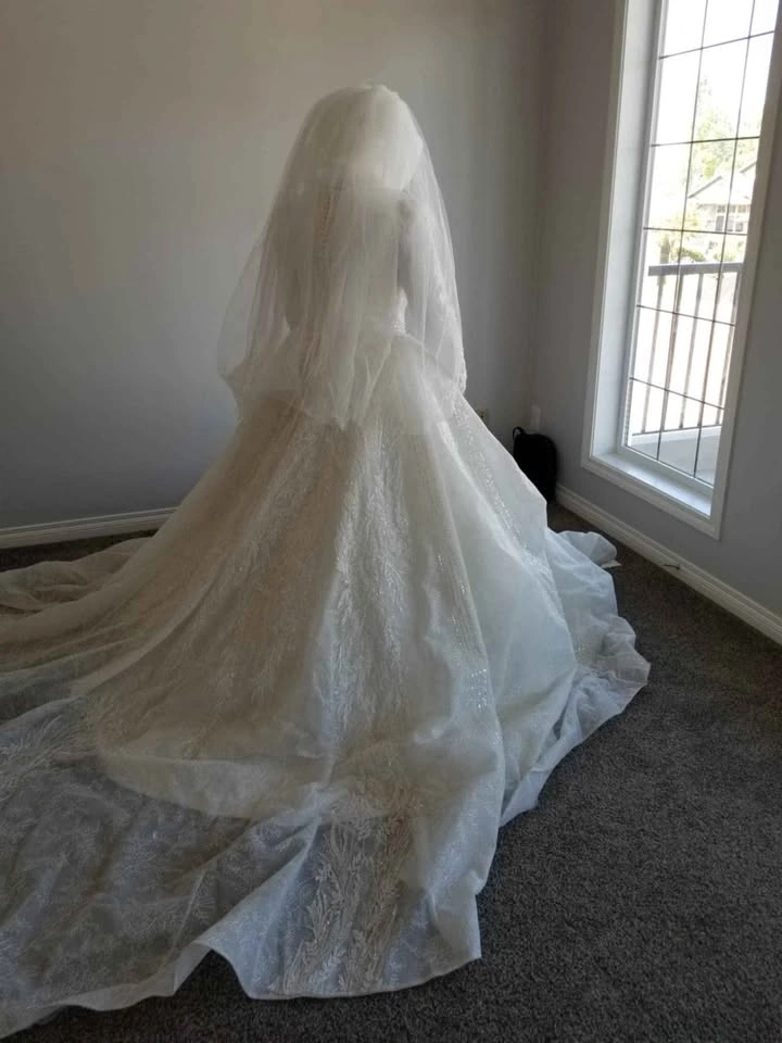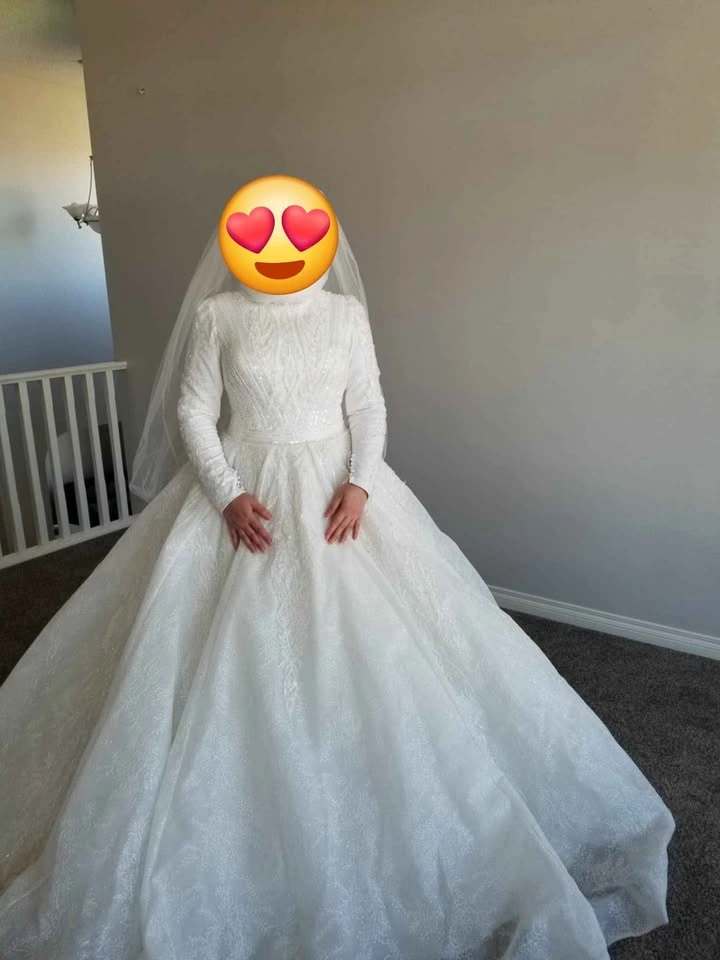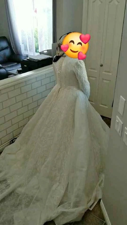 10The dress is cleaned and ready to be worn. You are welcome to try it on. I'll include the veil as well. It's long and I folded it in half but if you choose to wear long you could, it's beaded from all sides. I'll also include the head covering. The dress from Turkey and size M. I need to sell it as I don't have space for it unfortunately.