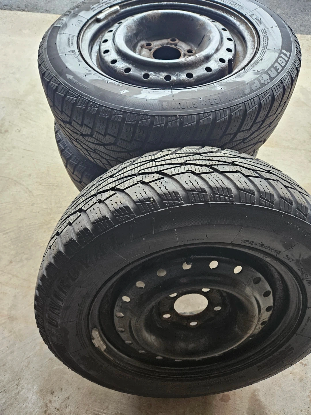 Four Uniroyal Tiger Paw snow tires mounted on steel rims. These tires are sized 195 65 15. They're a great option for Canadian winters! These tires should fit many vehicles with a 5x114.3mm bolt pattern.