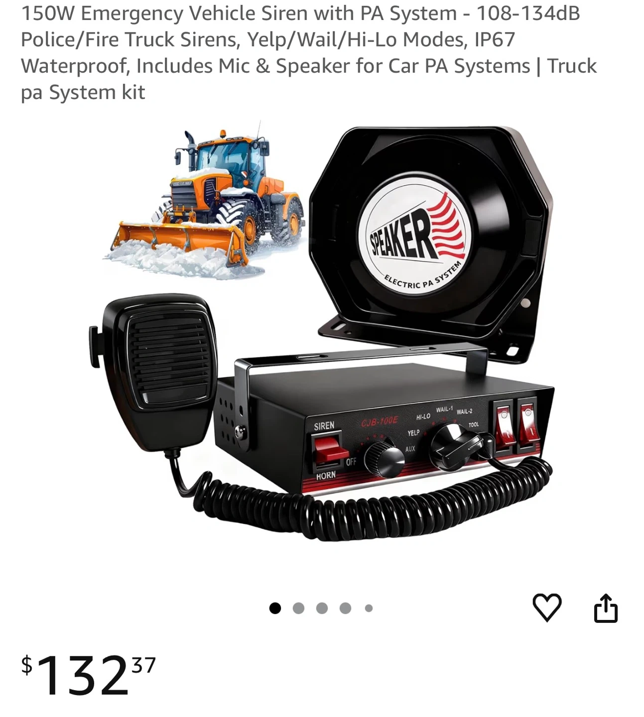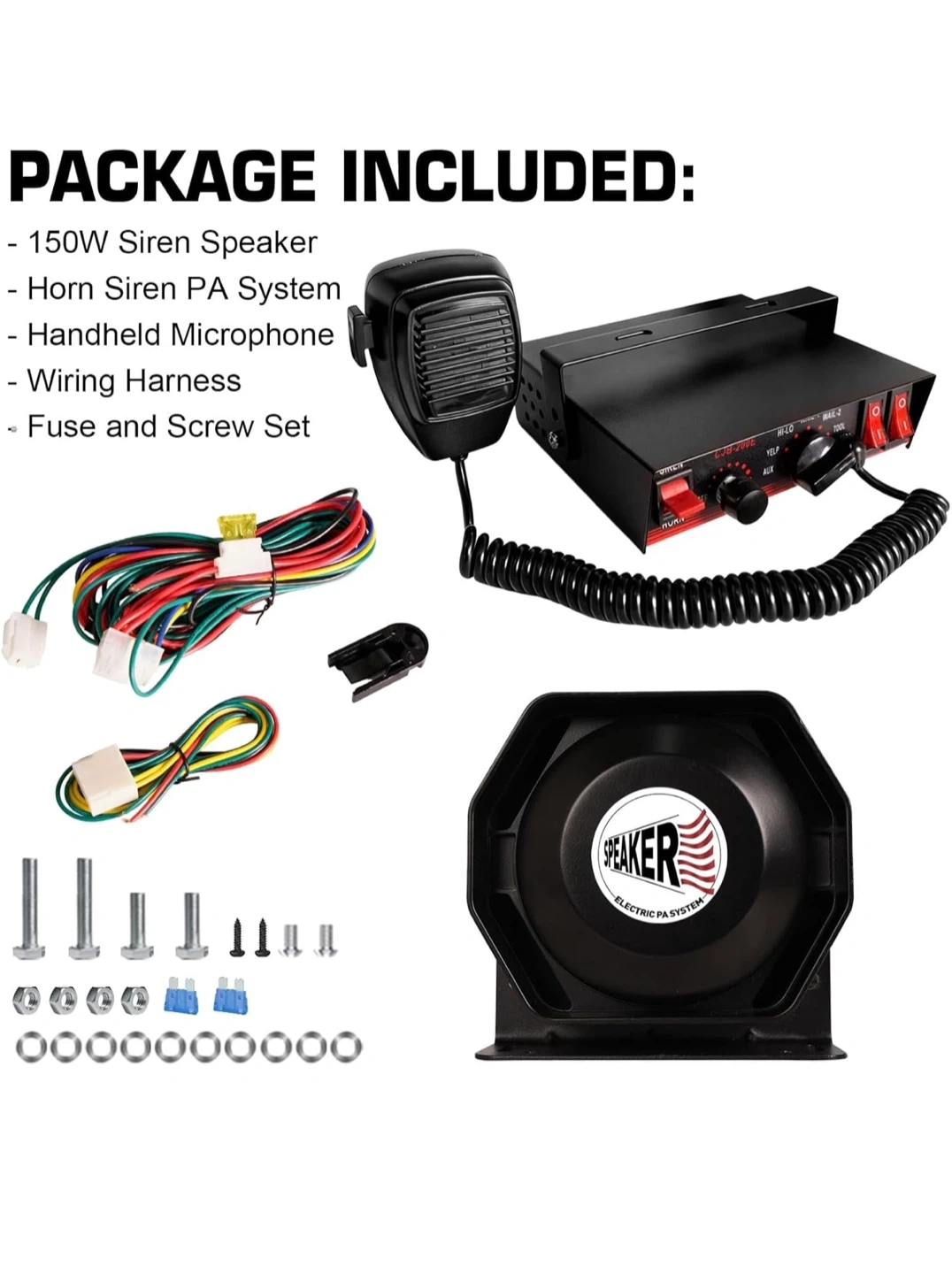 This is a YYATYS CJB-100E 150W emergency vehicle PA system. It includes a handheld microphone and has siren, horn, and multiple sound selector modes like Wail-1, Wail-2, Hi-Lo, Yelp, and Aux. Features two additional accessory switches. It's designed for easy operation and installation.