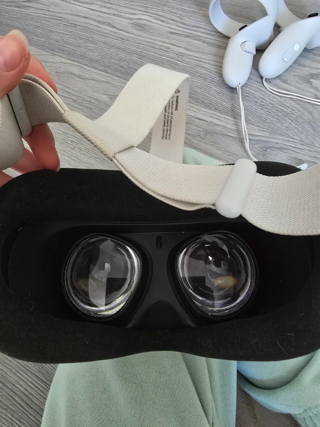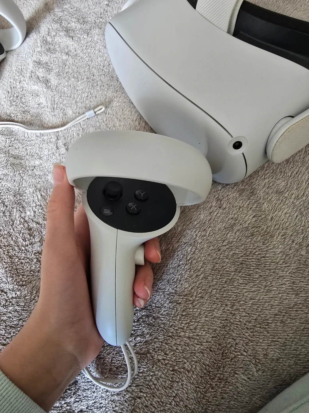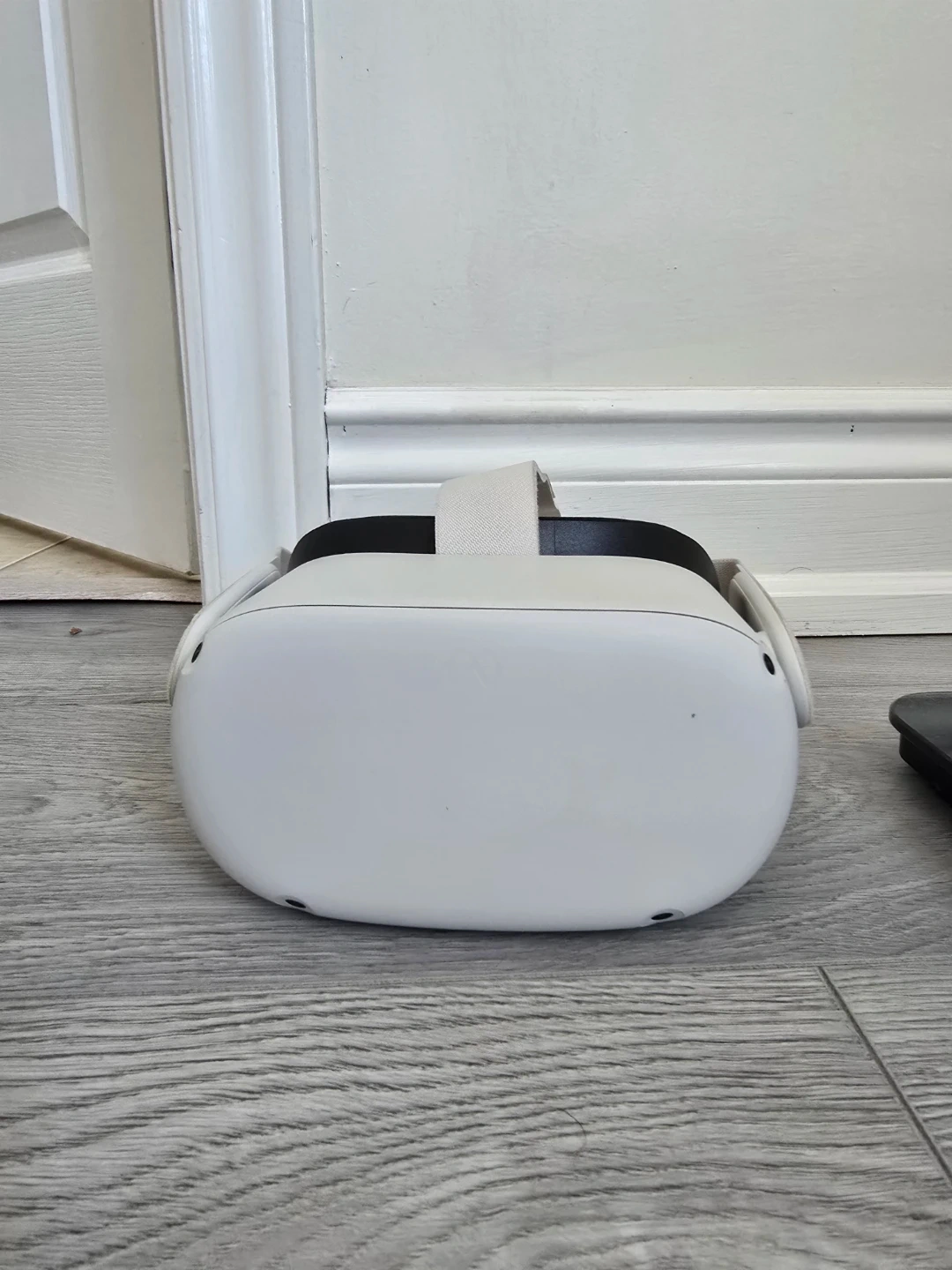 Meta Quest 2 virtual reality headset in white. It comes with two controllers. This headset is great for immersive gaming and experiences!Also cimes with a charger