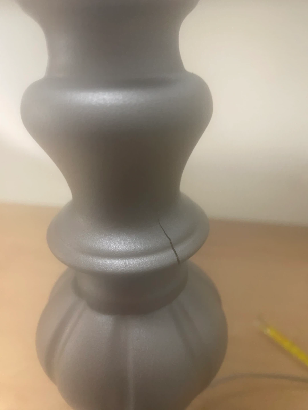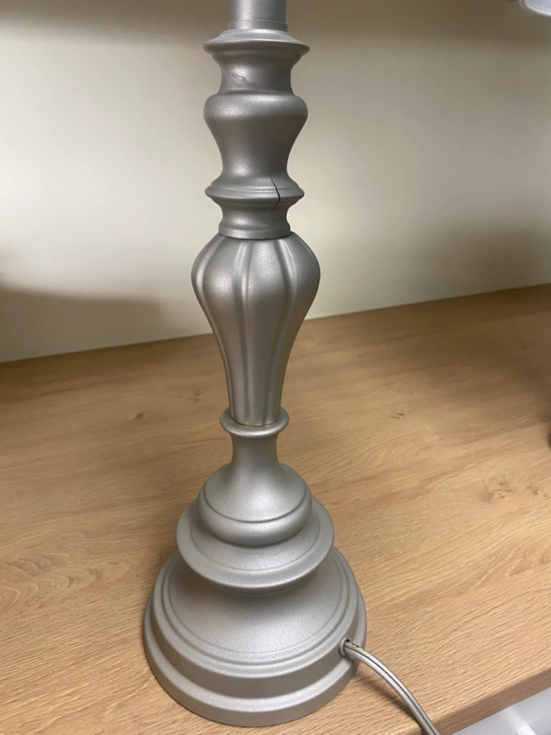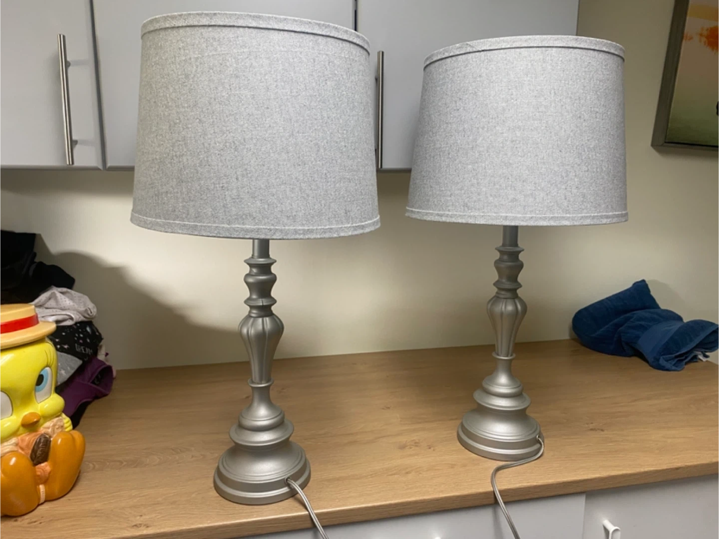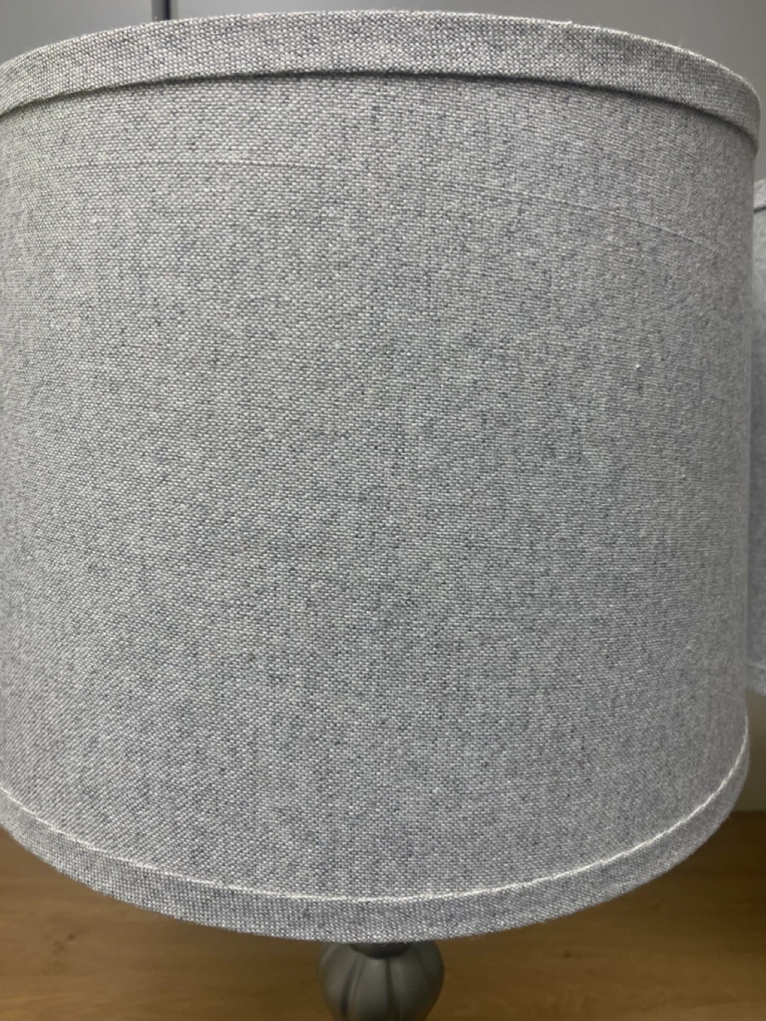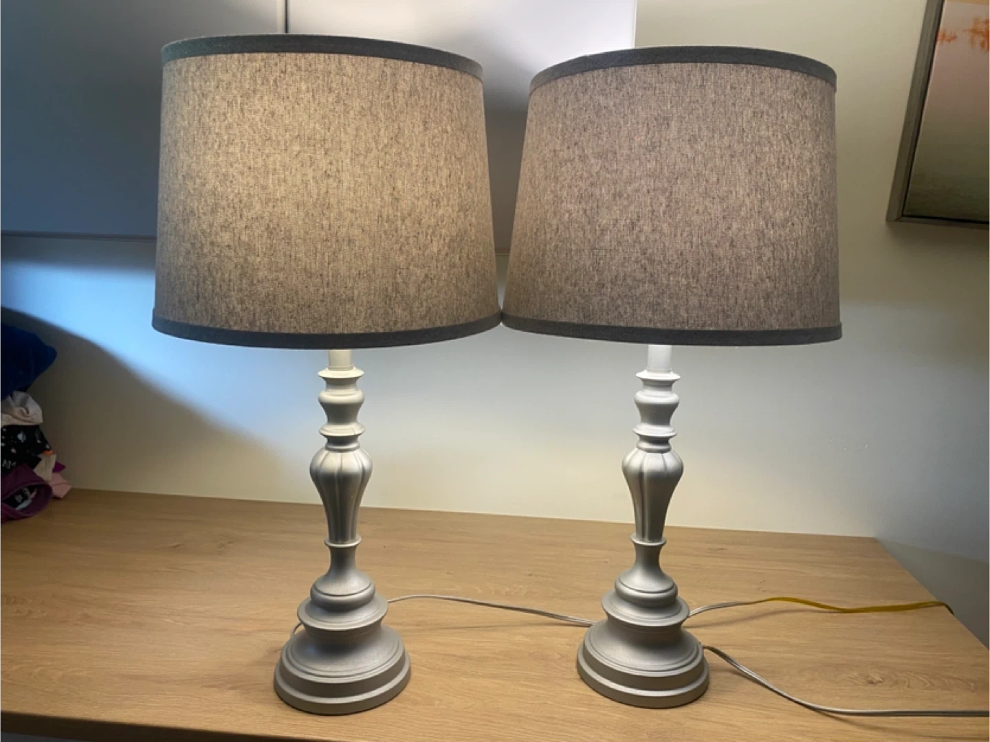 These table lamps have a grey fabric shade and a decorative base. They are a classic design that'll fit most rooms. There's a small crack on one of the base, but it's otherwise in excellent condition. .