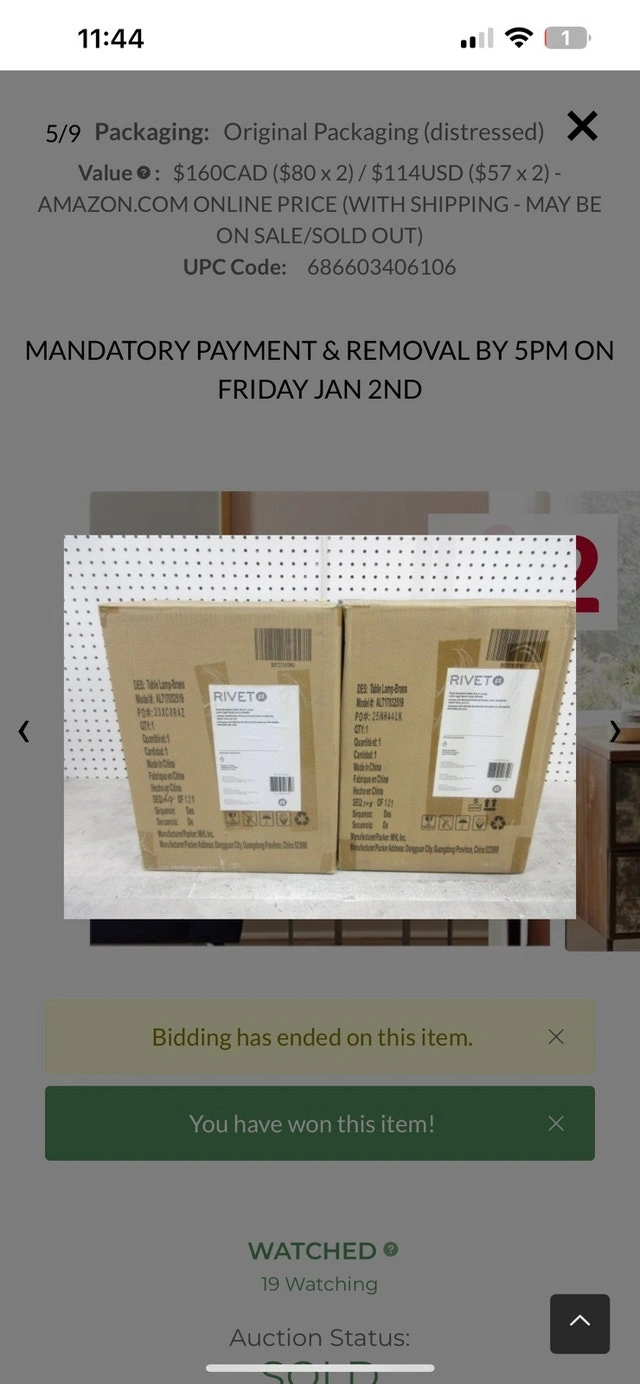 Brighten your space with this new Rivet gold bedside table desk lamp, featuring a sleek tripod design and an 18-inch height, complete with a light bulb. This lamp adds a touch of modern elegance to any room. The lamp has a convenient size for bedside tables or desks, and it's designed to provide ample light for reading or working. The gold finish adds a touch of sophistication. Key features include: Sleek tripod design, Gold finish, 18-inch height, Includes light bulb. Each $75. If the ad is still up, yes, it's still available!